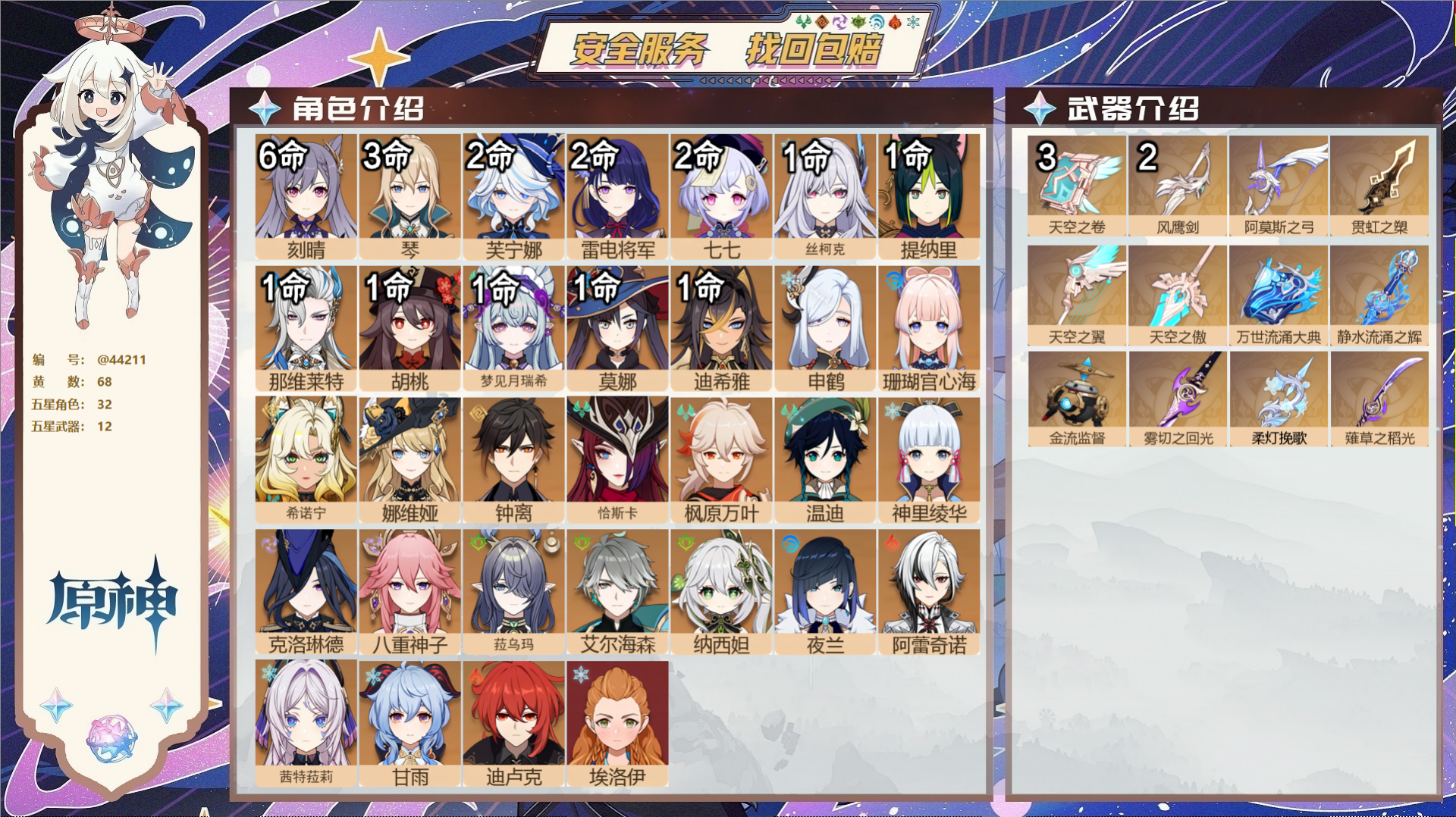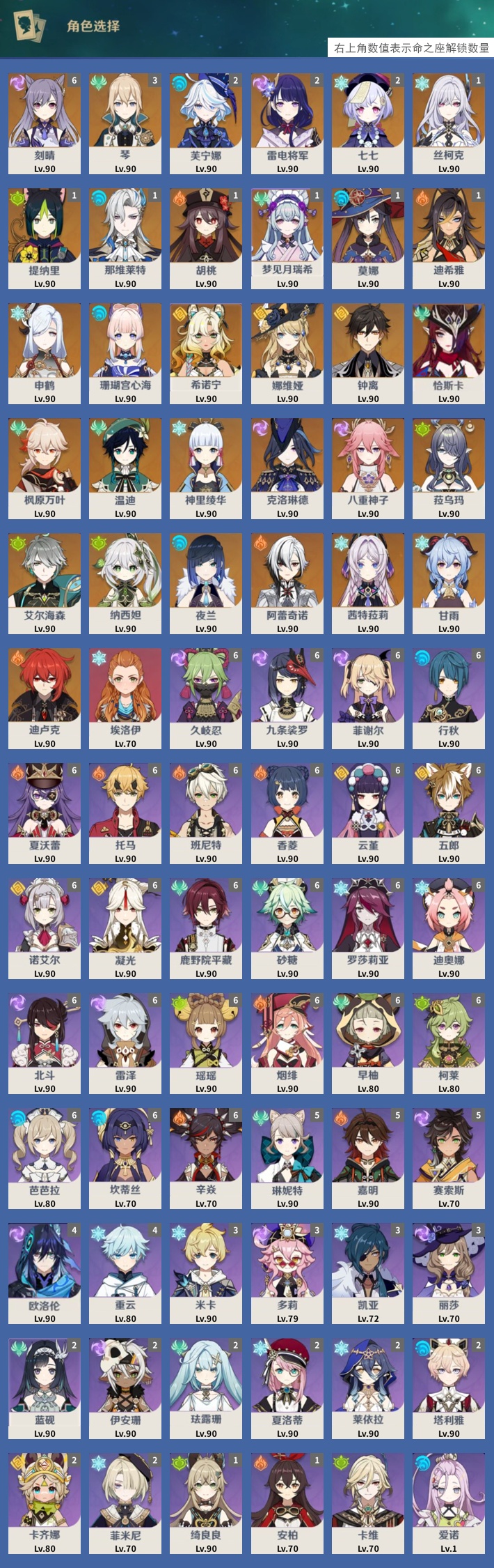 【32个五星角色】,满命刻晴,3命琴,2命芙宁娜,2命雷电将军,2命七七,1命丝柯克,1命提纳里,1命那维莱特,1命胡桃,1命梦见月瑞希,1命莫娜,1命迪希雅,0命申鹤,0命珊瑚宫心海,0命希诺宁,0命娜维娅,0命钟离,0命恰斯卡,0命枫原万叶,0命温迪,0命神里绫华,0命克洛琳德,0命八重神子,0命菈乌玛,0命艾尔海森,0命纳西妲,0命夜兰,0命阿蕾奇诺,0命茜特菈莉,0命甘雨,0命迪卢克,0命埃洛伊,
