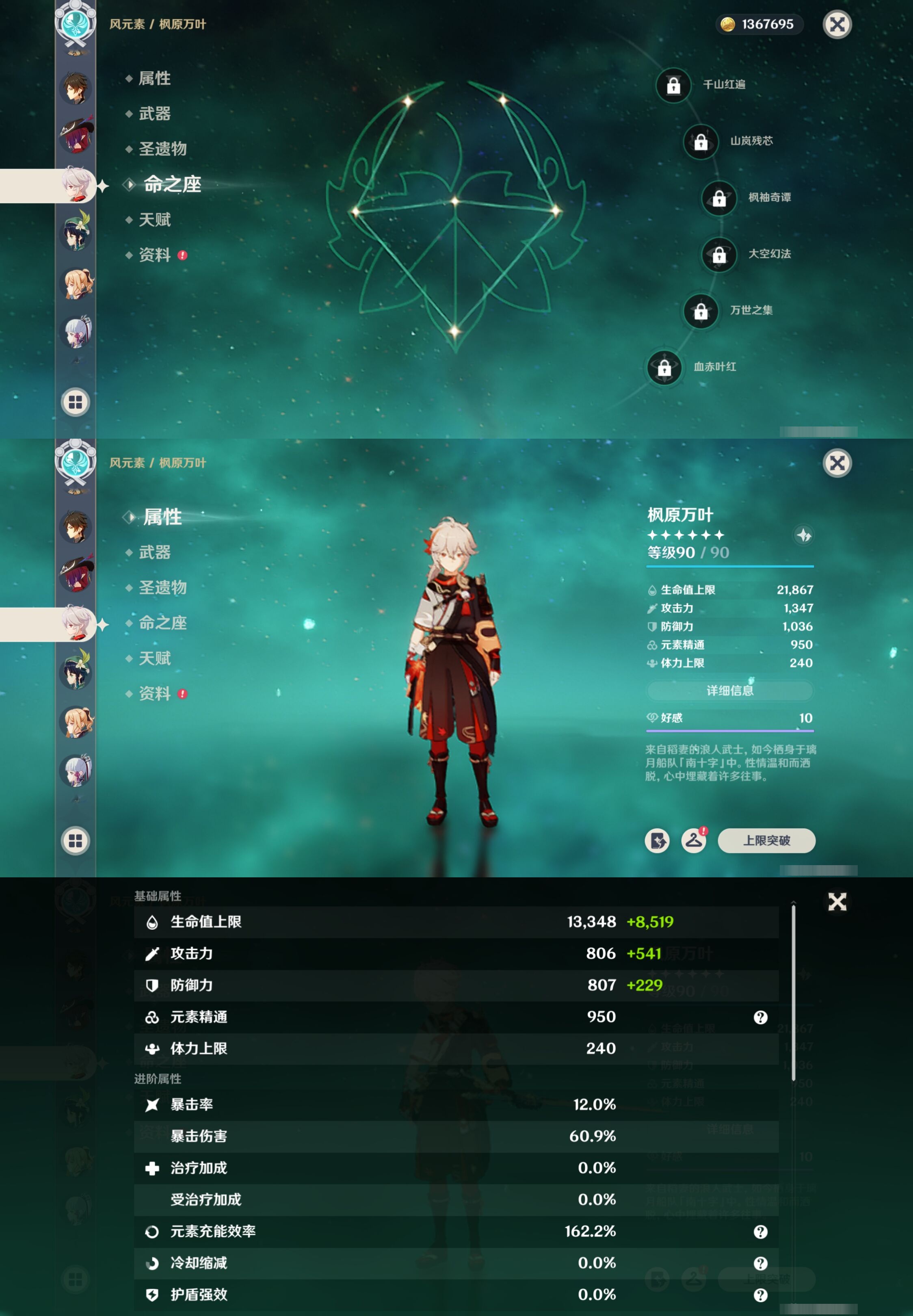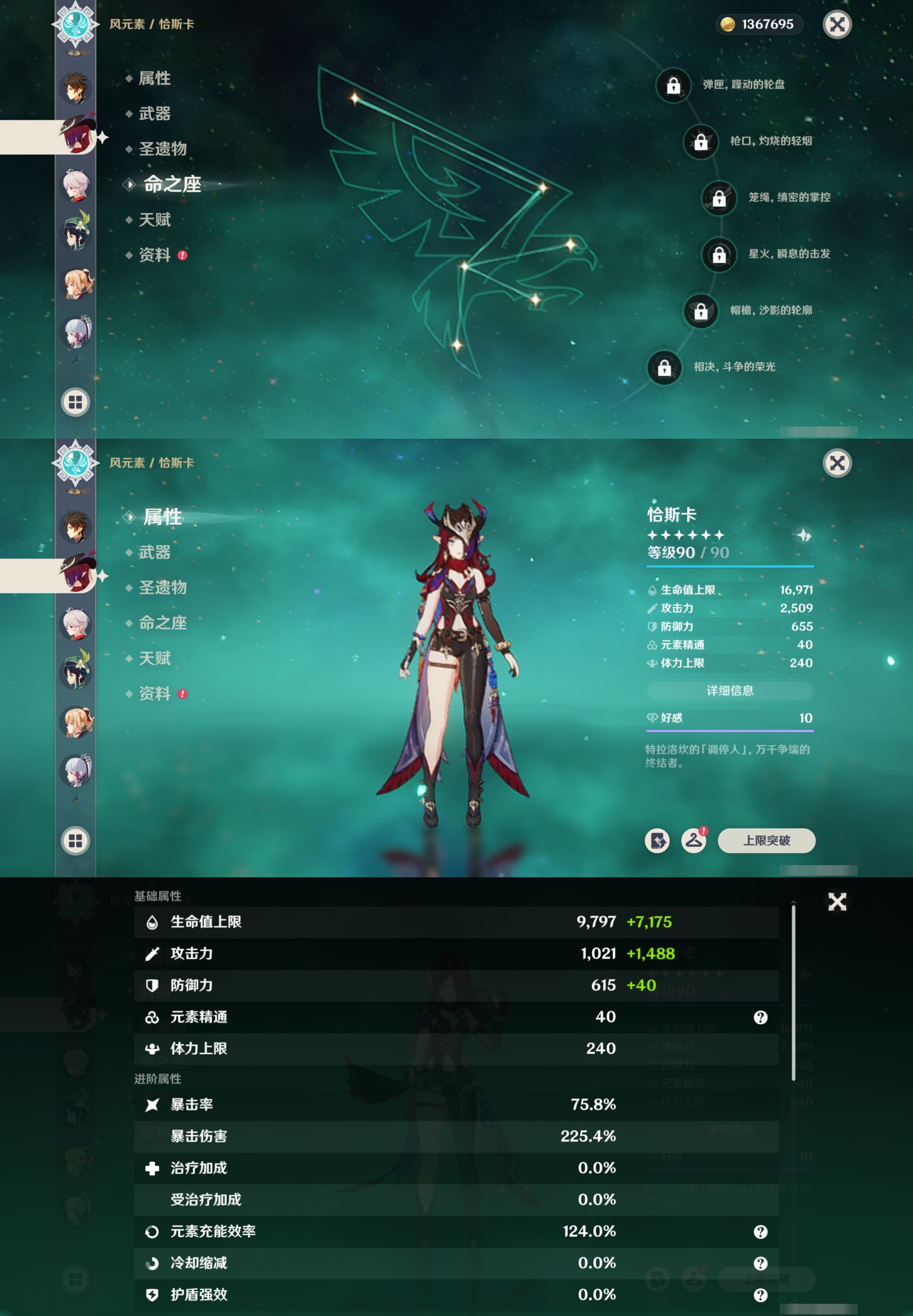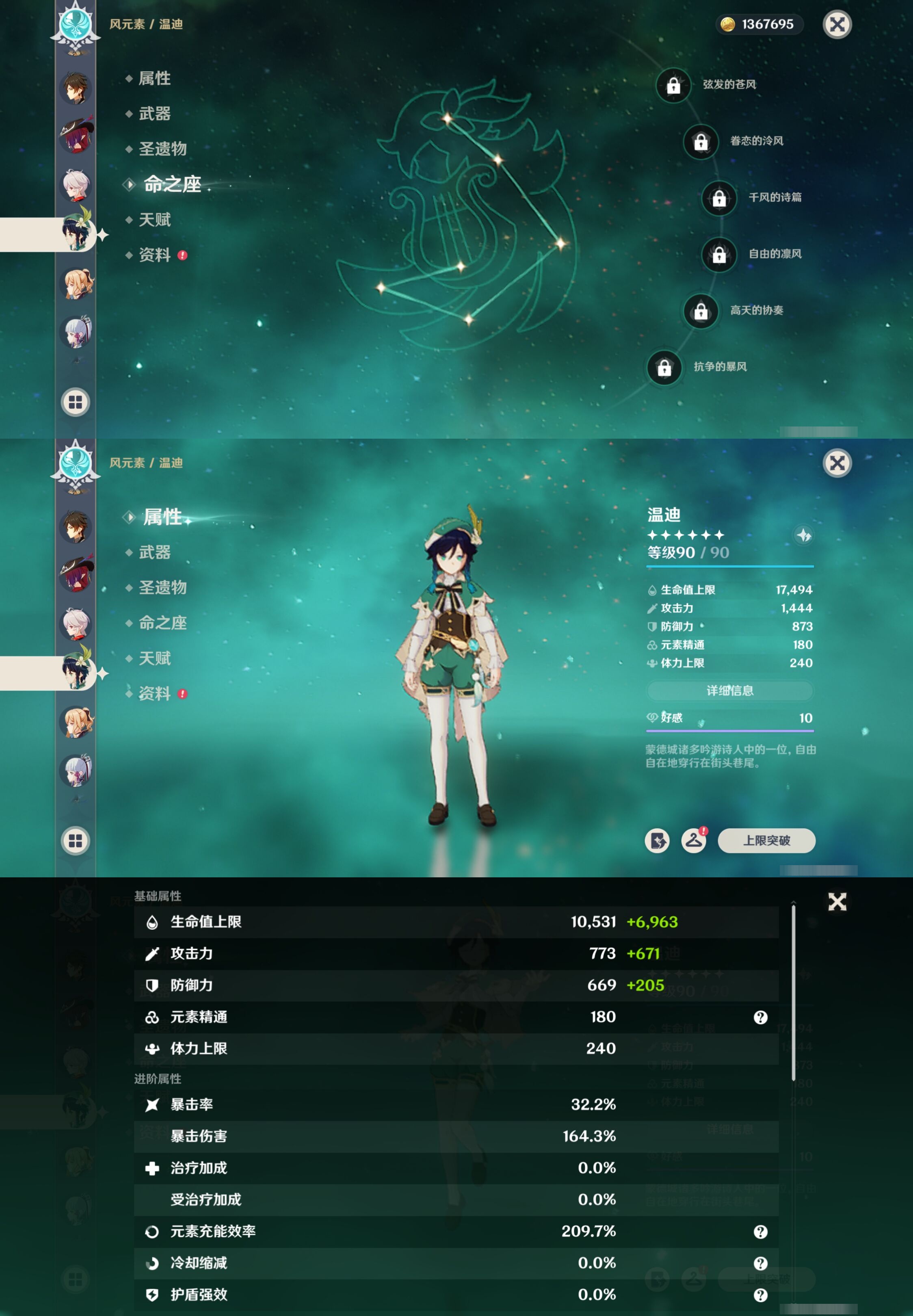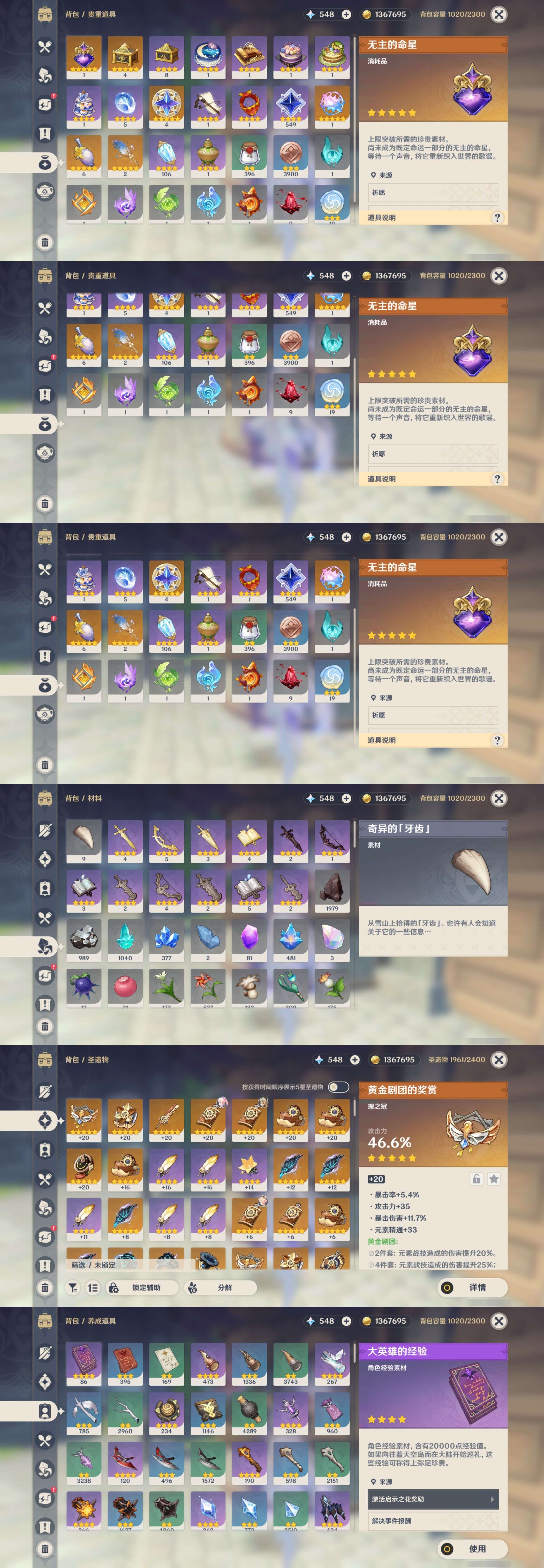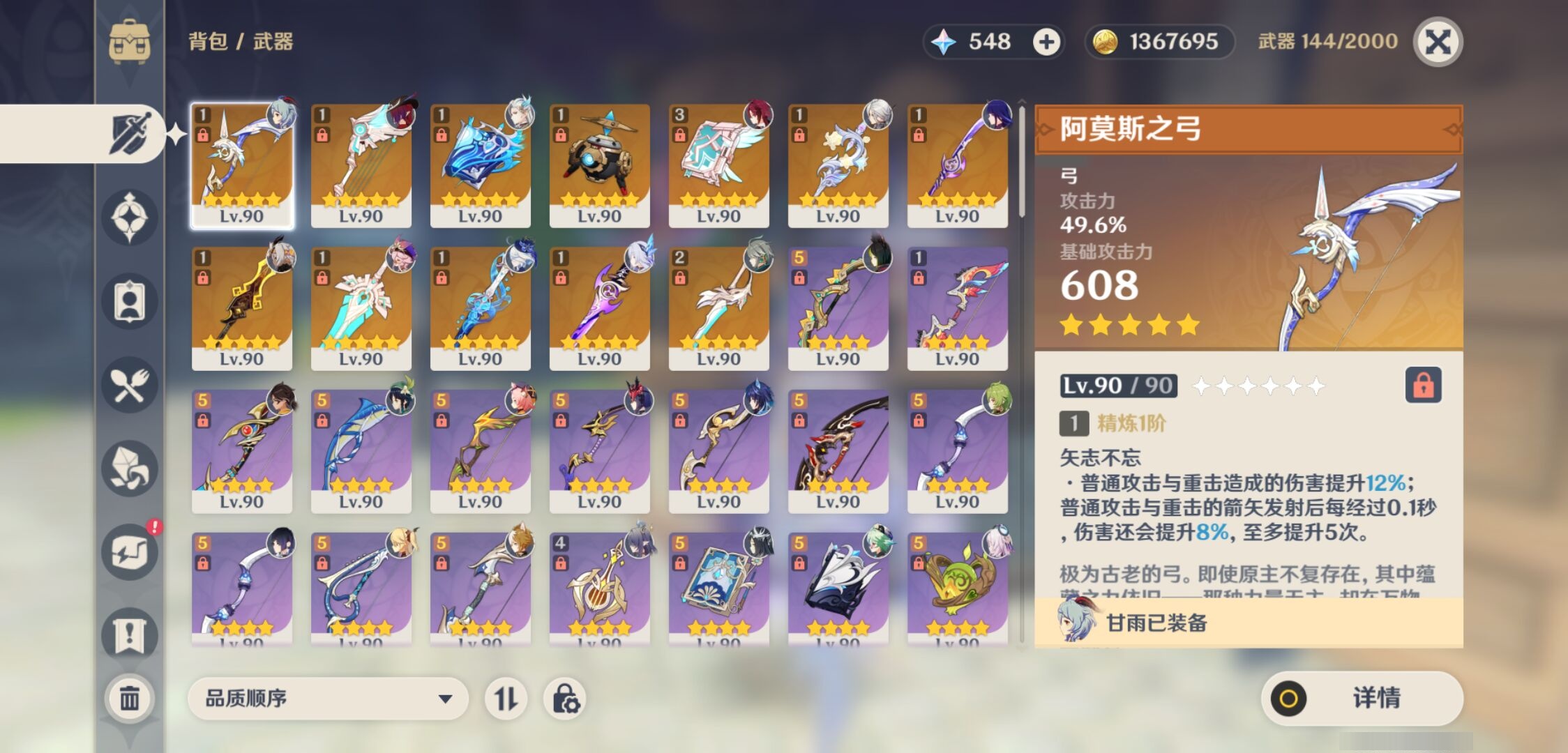 【12个五星武器】,精3天空之卷,精2风鹰剑,精1阿莫斯之弓,精1贯虹之槊,精1天空之翼,精1天空之傲,精1万世流涌大典,精1静水流涌之辉,精1金流监督,精1雾切之回光,精1柔灯挽歌,精1薙草之稻光,