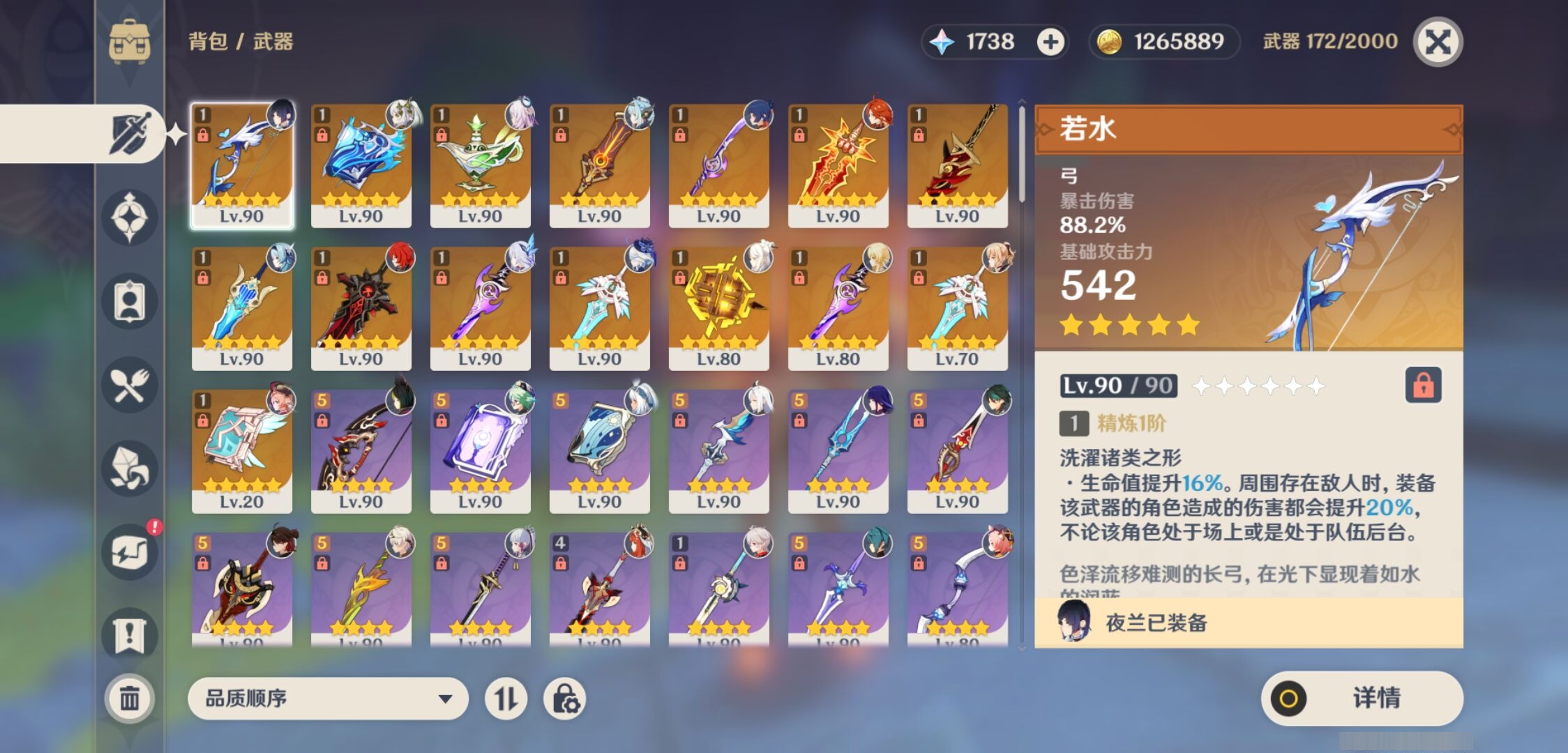 【15个五星武器】,精1若水,精1松籁响起之时,精1天空之卷,精1万世流涌大典,精1狼的末路,精1千夜浮梦,精1雾切之回光,精1赤沙之杖,精1天空之刃,精1薙草之稻光,精1尘世之锁,精1焚曜千阳,精1雾切之回光,精1赤角石溃杵,精1天空之刃,