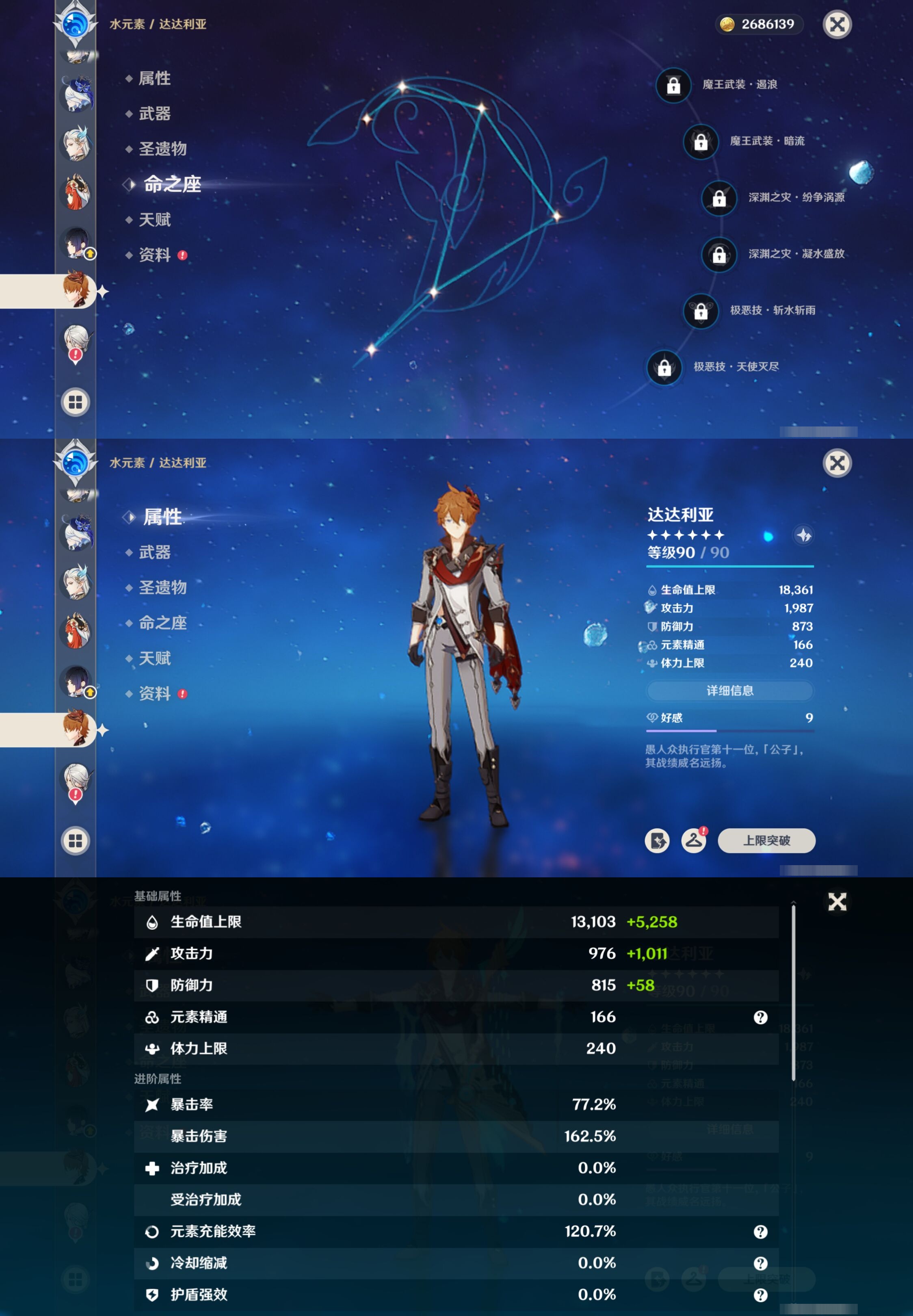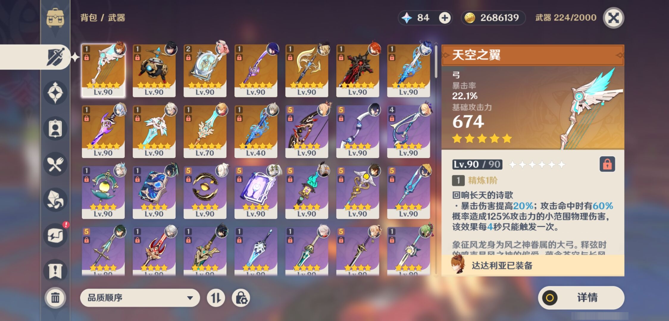 【11个五星武器】,精2四风原典,精1天空之翼,精1雾切之回光,精1金流监督,精1天空之刃,精1天空之脊,精1静水流涌之辉,精1薙草之稻光,精1裁断,精1狼的末路,精1静水流涌之辉,
