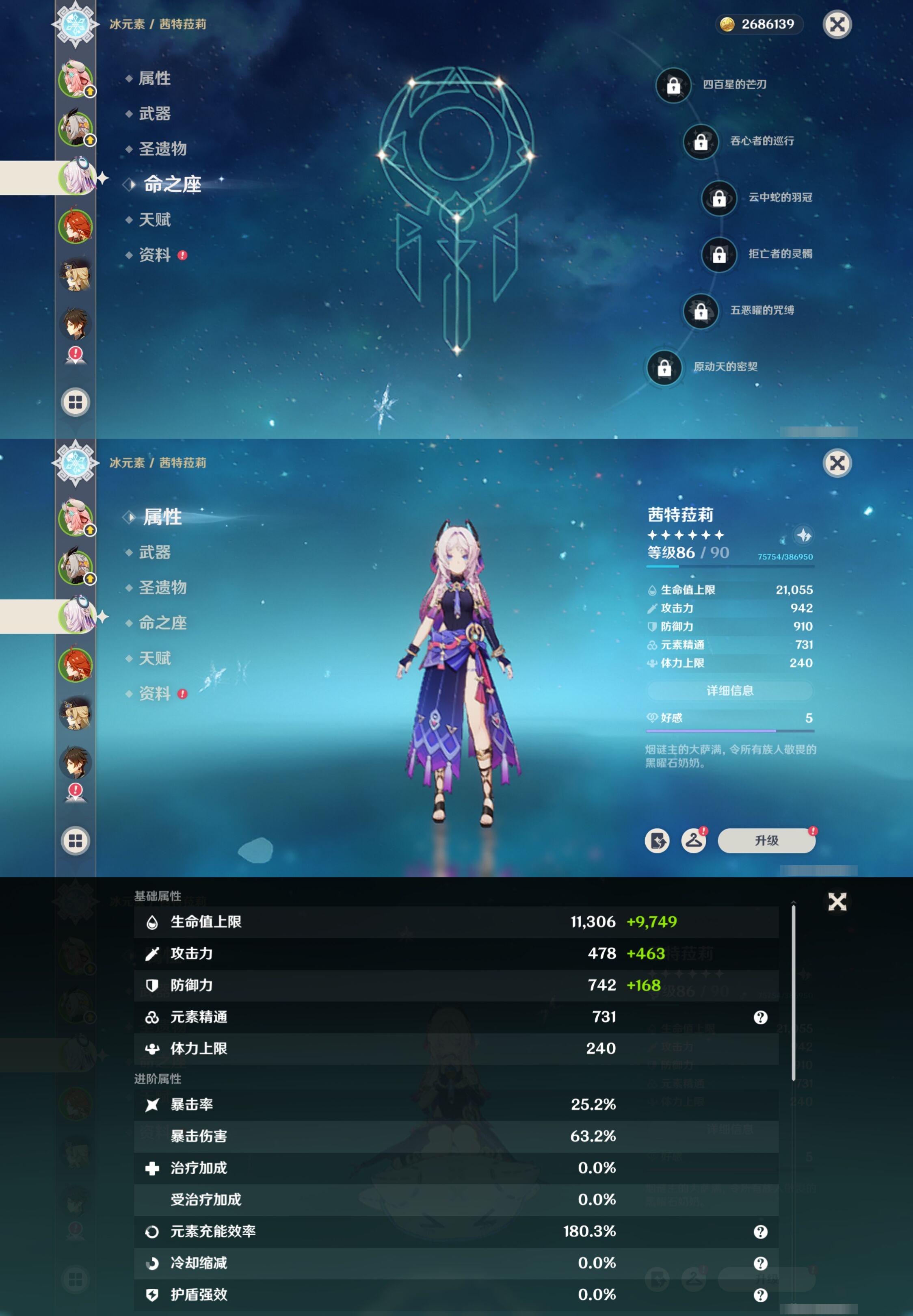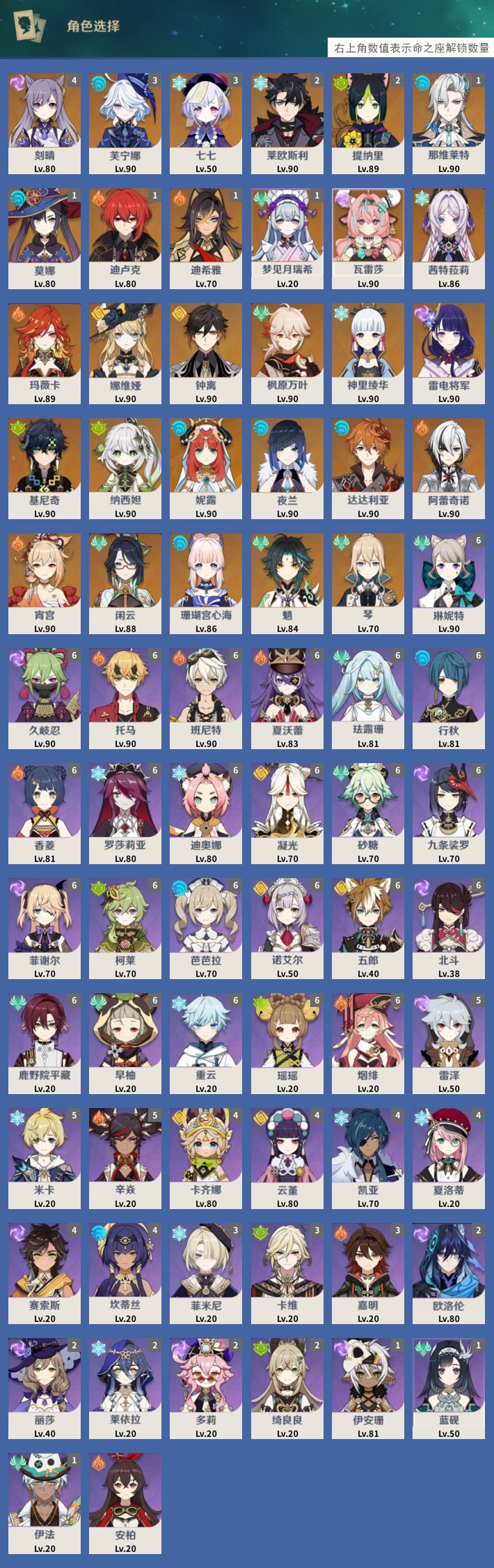 【29个五星角色】,4命刻晴,3命芙宁娜,3命七七,2命莱欧斯利,2命提纳里,1命那维莱特,1命莫娜,1命迪卢克,1命迪希雅,1命梦见月瑞希,0命瓦雷莎,0命茜特菈莉,0命玛薇卡,0命娜维娅,0命钟离,0命枫原万叶,0命神里绫华,0命雷电将军,0命基尼奇,0命纳西妲,0命妮露,0命夜兰,0命达达利亚,0命阿蕾奇诺,0命宵宫,0命闲云,0命珊瑚宫心海,0命魈,0命琴,