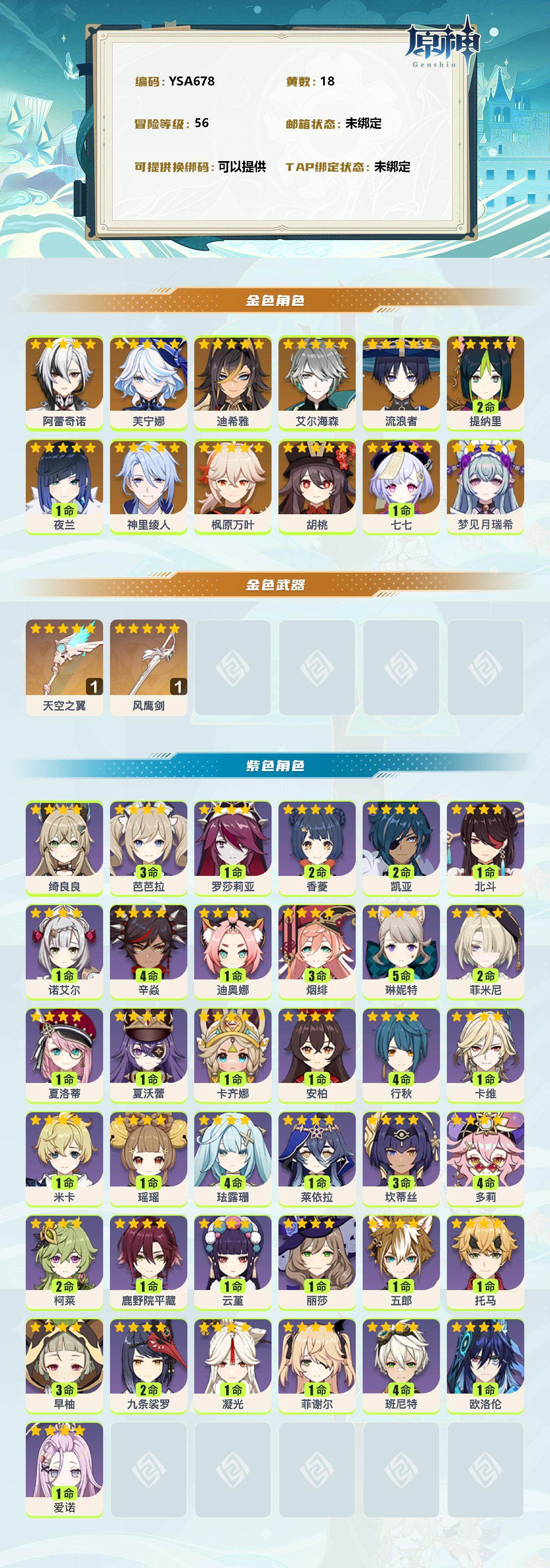 【YSA678】56级/18黄/女主/13个五星角色/2个五星武器/0命梦见月瑞希/0命阿蕾奇诺/0命芙宁娜/迪希雅/艾尔海森/流浪者/2命提纳里/1命夜兰/神里绫人/枫原万叶/胡桃/1命七七/风鹰剑/天空之翼/1命爱诺/0命欧洛伦/1命卡齐娜/0命夏沃蕾/0命夏洛蒂/2命菲米尼/5命琳妮特/0命绮良良/0命卡维/0命米卡/1命瑶瑶/4命珐露珊/0命莱依拉/3命坎蒂丝/4命多莉/2命柯莱/0命鹿野院平藏/0命云堇/0命五郎/0命托马/2命九条裟罗/3命早柚/3命烟绯/1命罗莎莉亚/4命辛焱/0命迪奥娜/1命菲谢尔/0命丽莎/1命北斗/2命香菱/0命安柏/4命班尼特/4命行秋/3命芭芭拉/0命凝光/1命诺艾尔/2命凯亚【按邮箱: 邮箱未绑定】