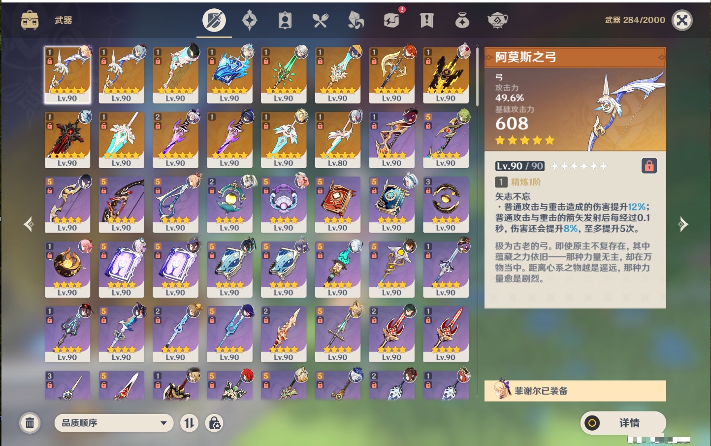 【14个五星武器】,精2雾切之回光,精1阿莫斯之弓,精1天空之翼,精1万世流涌大典,精1和璞鸢,精1天空之脊,精1裁断,精1无工之剑,精1狼的末路,精1天空之傲,精1雾切之回光,精1天空之刃,精1风鹰剑,