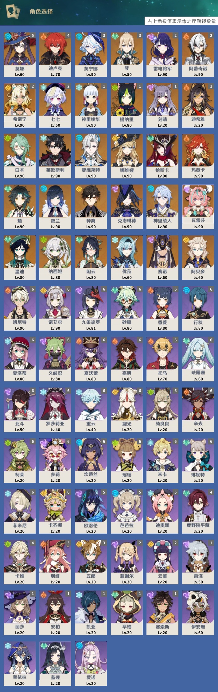 【30个五星角色】,5命莫娜,4命迪卢克,3命芙宁娜,3命琴,2命雷电将军,2命阿蕾奇诺,2命希诺宁,2命七七,1命神里绫华,1命提纳里,1命刻晴,1命迪希雅,0命白术,0命莱欧斯利,0命那维莱特,0命娜维娅,0命恰斯卡,0命玛薇卡,0命魈,0命夜兰,0命钟离,0命克洛琳德,0命神里绫人,0命瓦雷莎,0命温迪,0命纳西妲,0命闲云,0命优菈,0命赛诺,0命阿贝多,