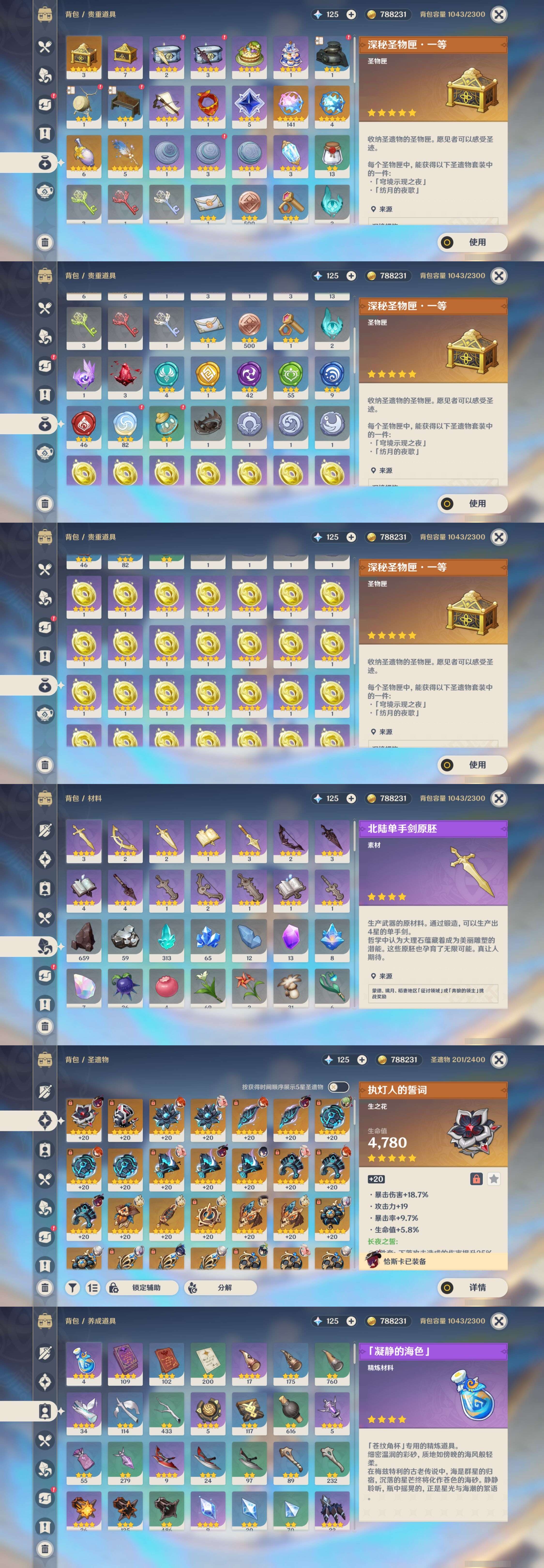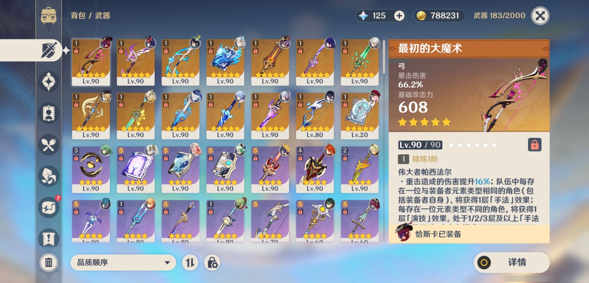 【14个五星武器】,精1最初的大魔术,精1裁断,精1飞雷之弦振,精1岩峰巡歌,精1终末嗟叹之诗,精1静水流涌之辉,精1万世流涌大典,精1波乱月白经津,精1赤沙之杖,精1雾切之回光,精1薙草之稻光,精1若水,精1和璞鸢,精1四风原典,
