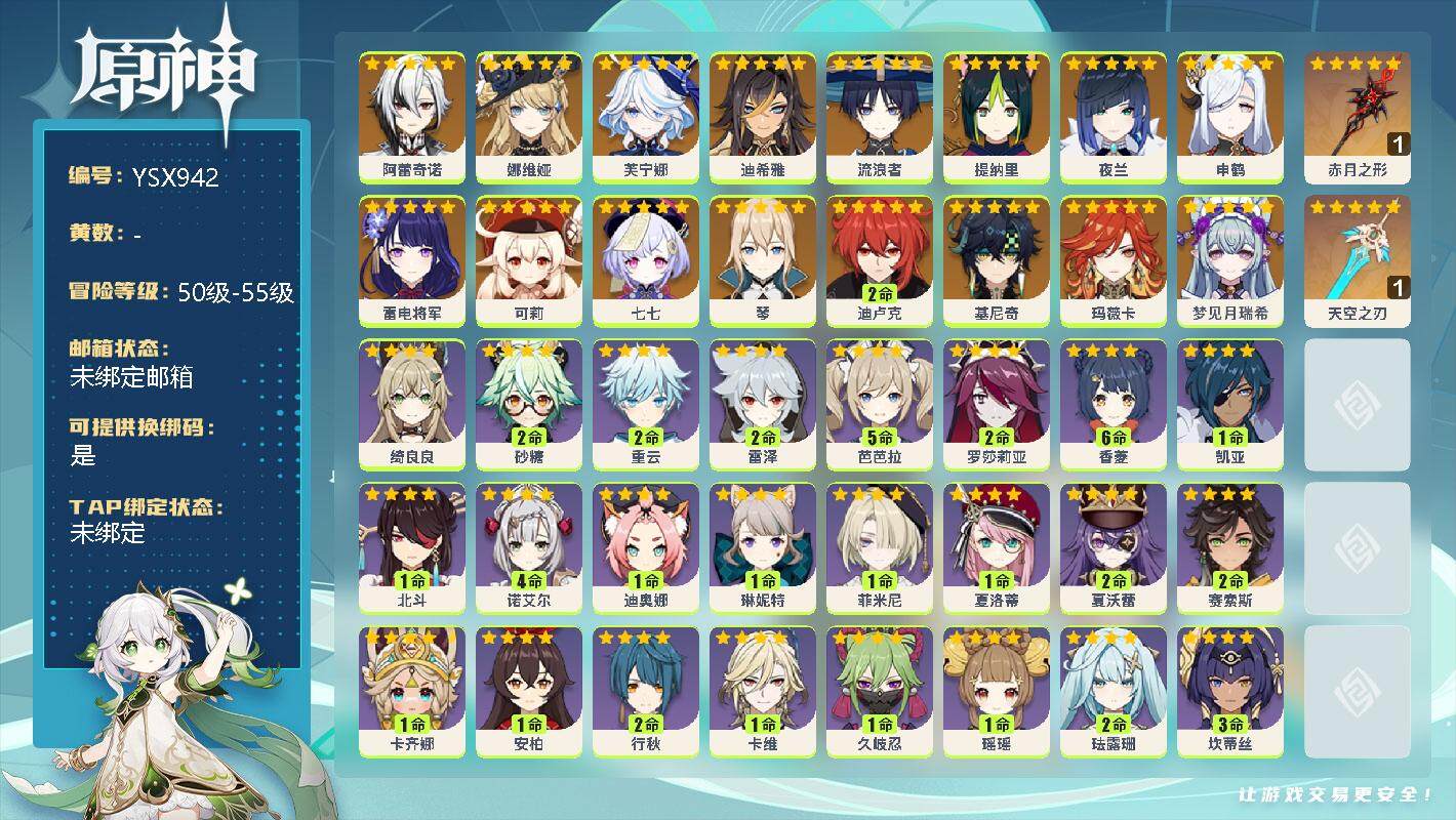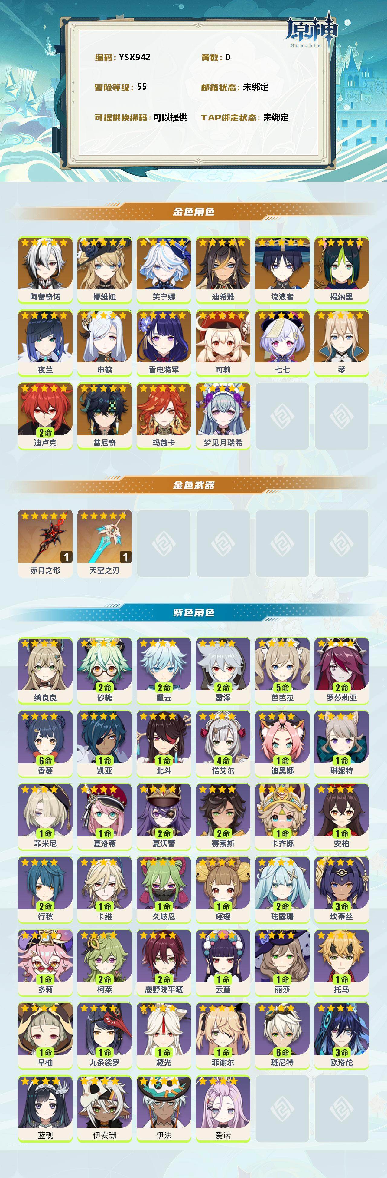 【YSX942】55级/女主/18个五星角色/0命梦见月瑞希/0命玛薇卡/0命基尼奇/0命阿蕾奇诺/0命娜维娅/0命芙宁娜/迪希雅/流浪者/提纳里/夜兰/申鹤/雷电将军/可莉/琴/2命迪卢克/七七/精1赤月之形/天空之刃/0命爱诺/0命伊法/0命伊安珊/0命蓝砚/3命欧洛伦/0命卡齐娜/2命赛索斯/2命夏沃蕾/0命夏洛蒂/0命菲米尼/1命琳妮特/0命绮良良/1命卡维/0命瑶瑶/2命珐露珊/3命坎蒂丝/1命多莉/2命柯莱/2命鹿野院平藏/0命久岐忍/1命云堇/0命托马/0命九条裟罗/0命早柚/2命罗莎莉亚/0命迪奥娜/2命砂糖/2命雷泽/1命菲谢尔/0命丽莎/1命北斗/满命香菱/0命安柏/满命班尼特/2命行秋/5命芭芭拉/1命凝光/4命诺艾尔/0命凯亚/2命重云【按邮箱: 邮箱未绑定】