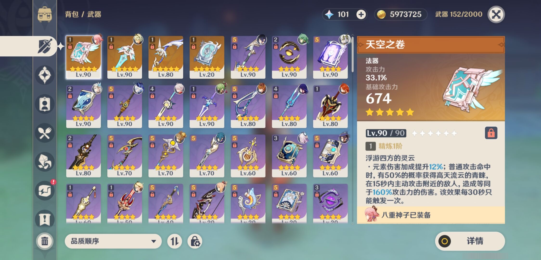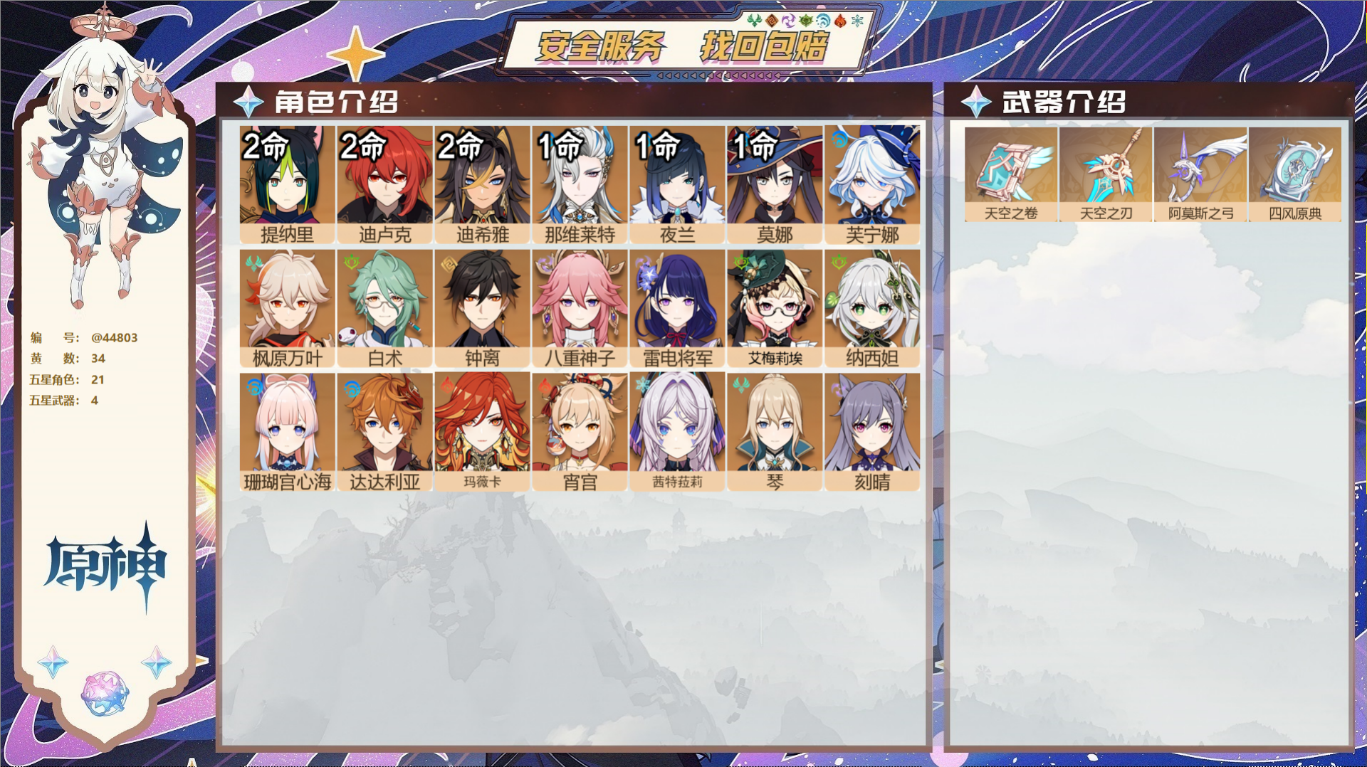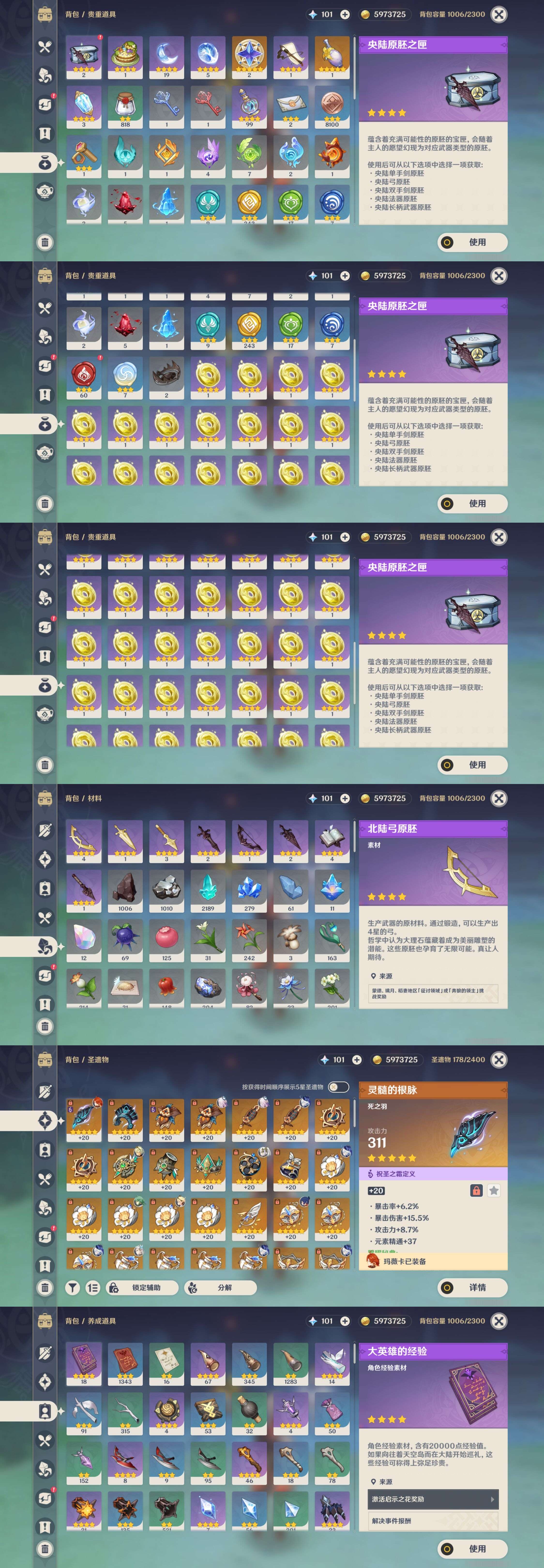 【4个五星武器】,精1天空之卷,精1天空之刃,精1阿莫斯之弓,精1四风原典,