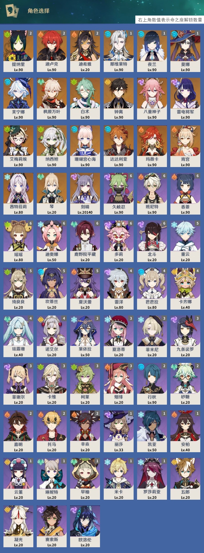 【21个五星角色】,2命提纳里,2命迪卢克,2命迪希雅,1命那维莱特,1命夜兰,1命莫娜,0命芙宁娜,0命枫原万叶,0命白术,0命钟离,0命八重神子,0命雷电将军,0命艾梅莉埃,0命纳西妲,0命珊瑚宫心海,0命达达利亚,0命玛薇卡,0命宵宫,0命茜特菈莉,0命琴,0命刻晴,