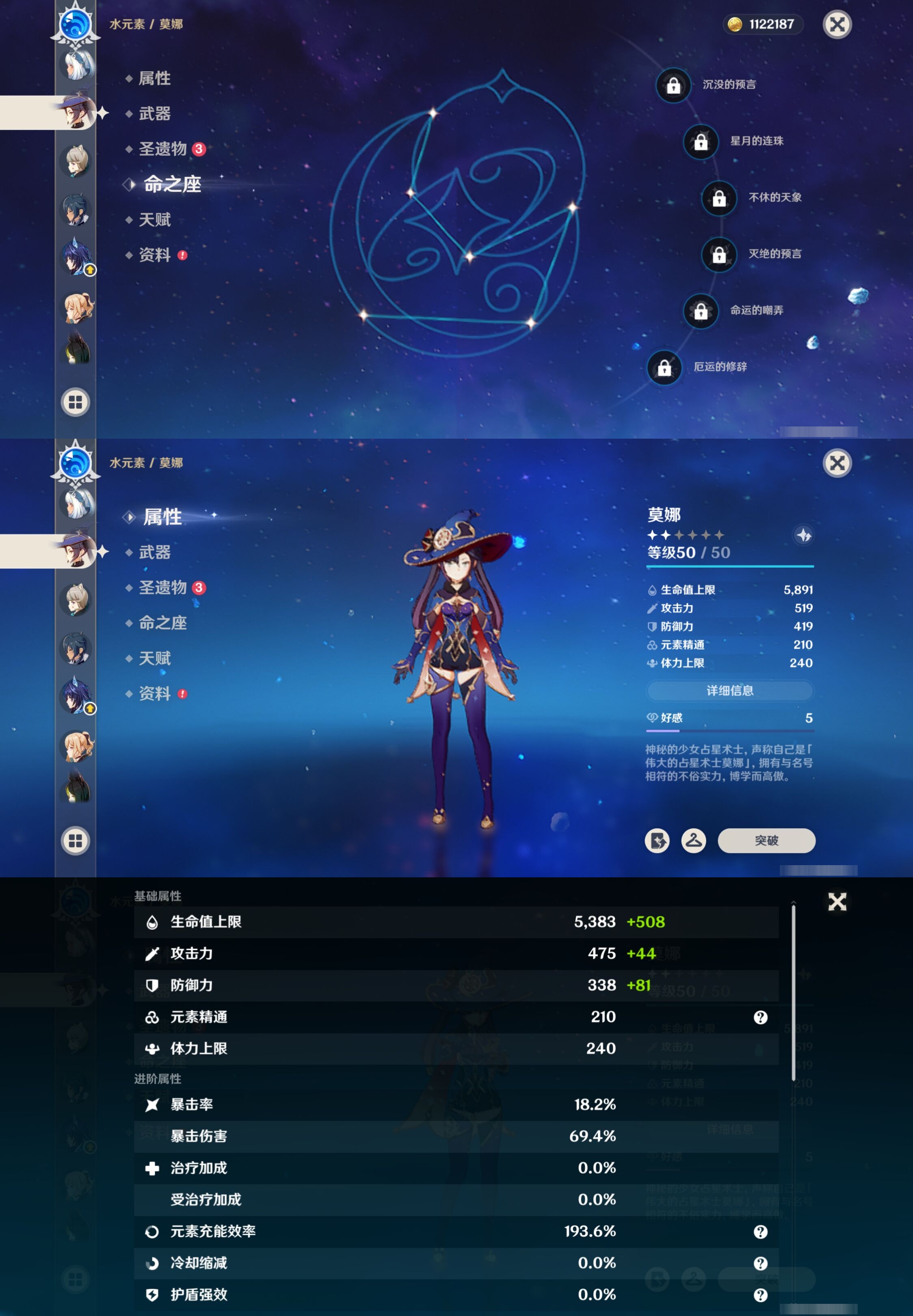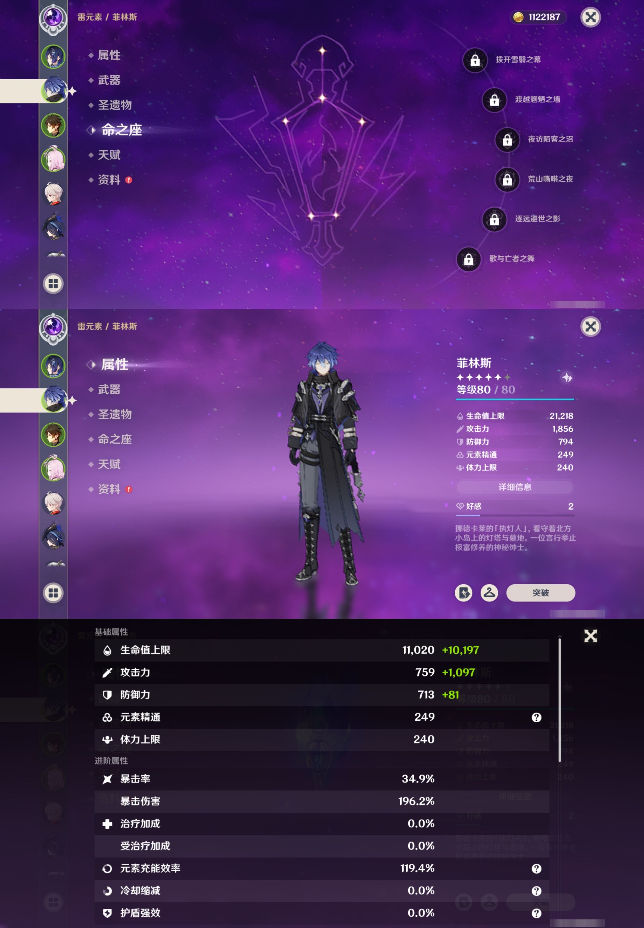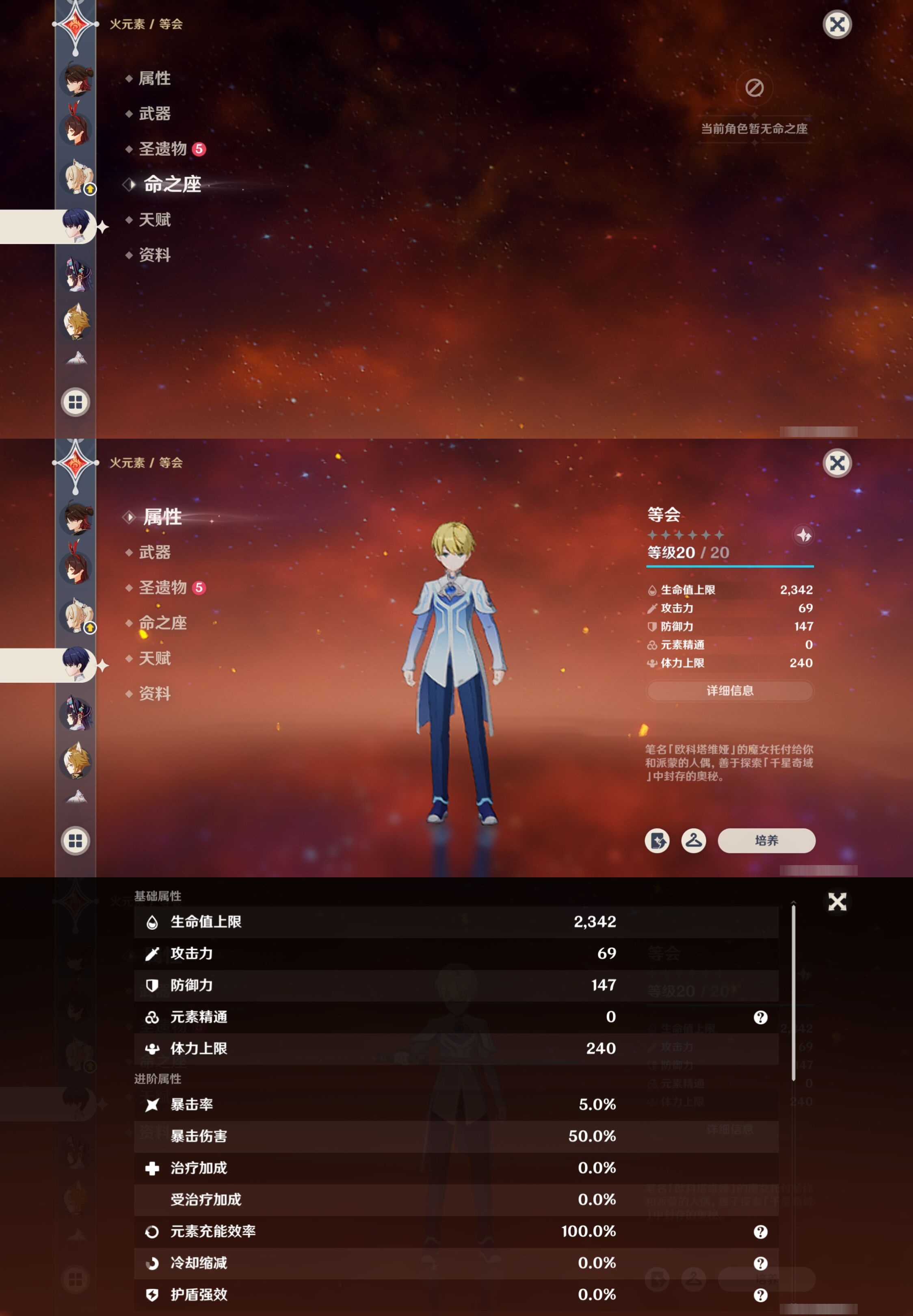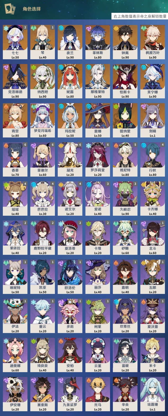 【18个五星角色】,2命七七,1命琴,0命夜兰,0命菲林斯,0命钟离,0命枫原万叶,0命克洛琳德,0命纳西妲,0命妮露,0命那维莱特,0命恰斯卡,0命芙宁娜,0命宵宫,0命梦见月瑞希,0命玛拉妮,0命莫娜,0命提纳里,0命刻晴,