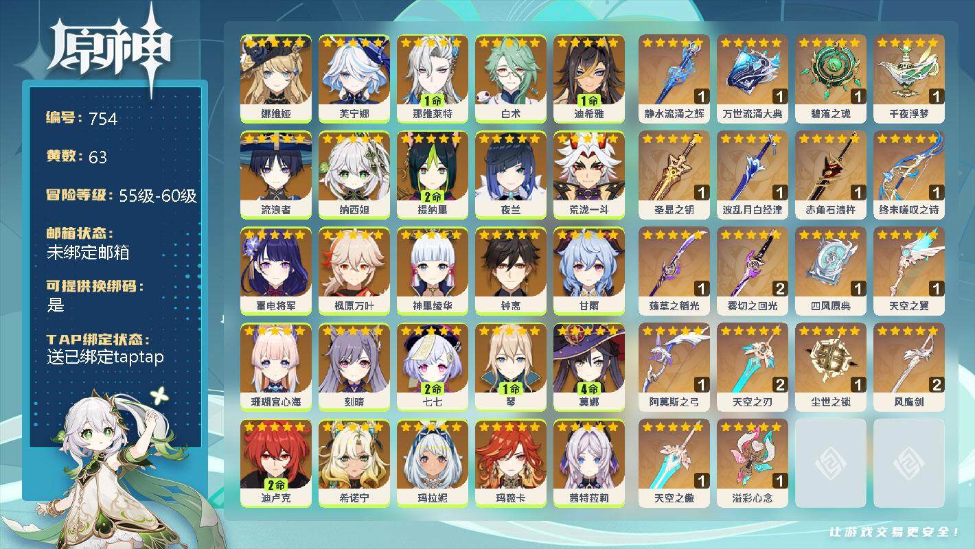 0命娜维娅,0命芙宁娜,1命那维莱特,0命白术,1命迪希雅,0命流浪者,0命纳西妲,2命提纳里,0命夜兰,0命荒泷一斗,0命雷电将军,0命枫原万叶,0命神里绫华,0命钟离,0命甘雨,0命珊瑚宫心海,0命刻晴,2命七七,1命琴,4命莫娜,2命迪卢克,0命希诺宁,0命玛拉妮,0命玛薇卡,0命茜特菈莉,0命梦见月瑞希,0命瓦雷莎,0命爱可菲,0命丝柯克,精1静水流涌之辉,精1万世流涌大典,精1碧落之珑,精1千夜浮梦,精1圣显之钥,精1波乱月白经津,精1赤角石溃杵,精1终末嗟叹之诗,精1薙草之稻光,精2雾切之回光,精1四风原典,精1天空之翼,精1阿莫斯之弓,精2天空之刃,精1尘世之锁,精2风鹰剑,精1天空之傲,精1溢彩心念【按邮箱: 邮箱未绑定】