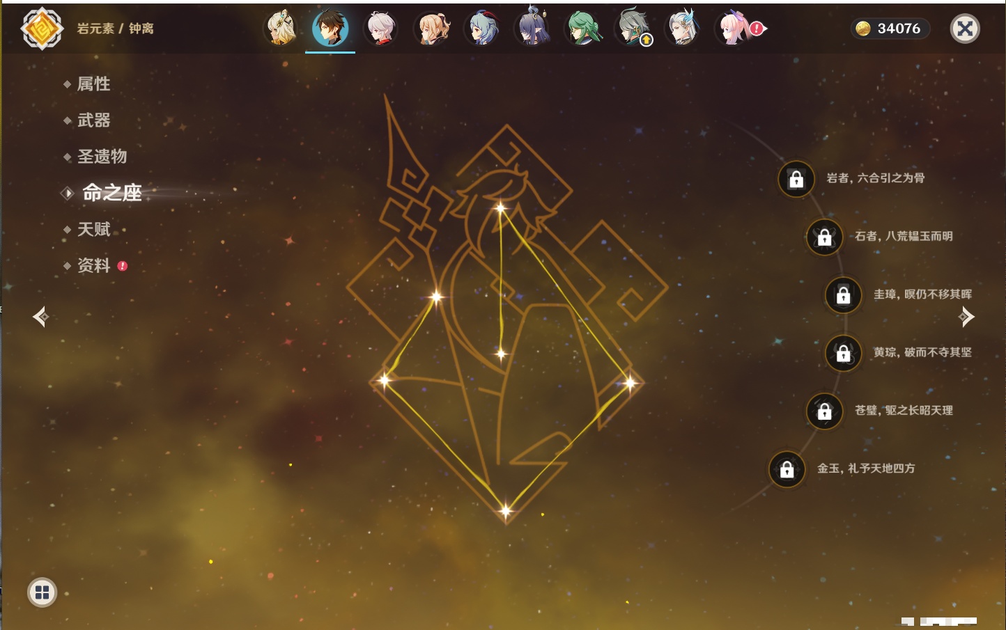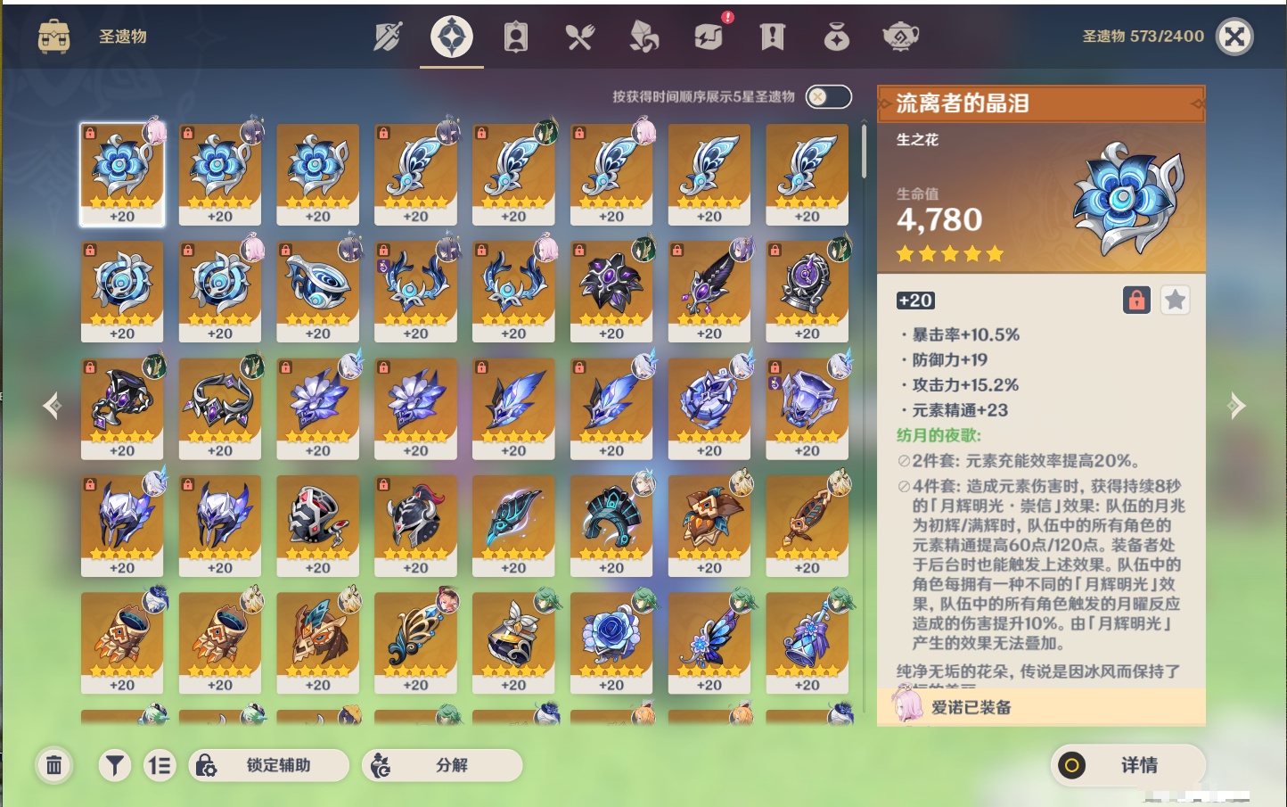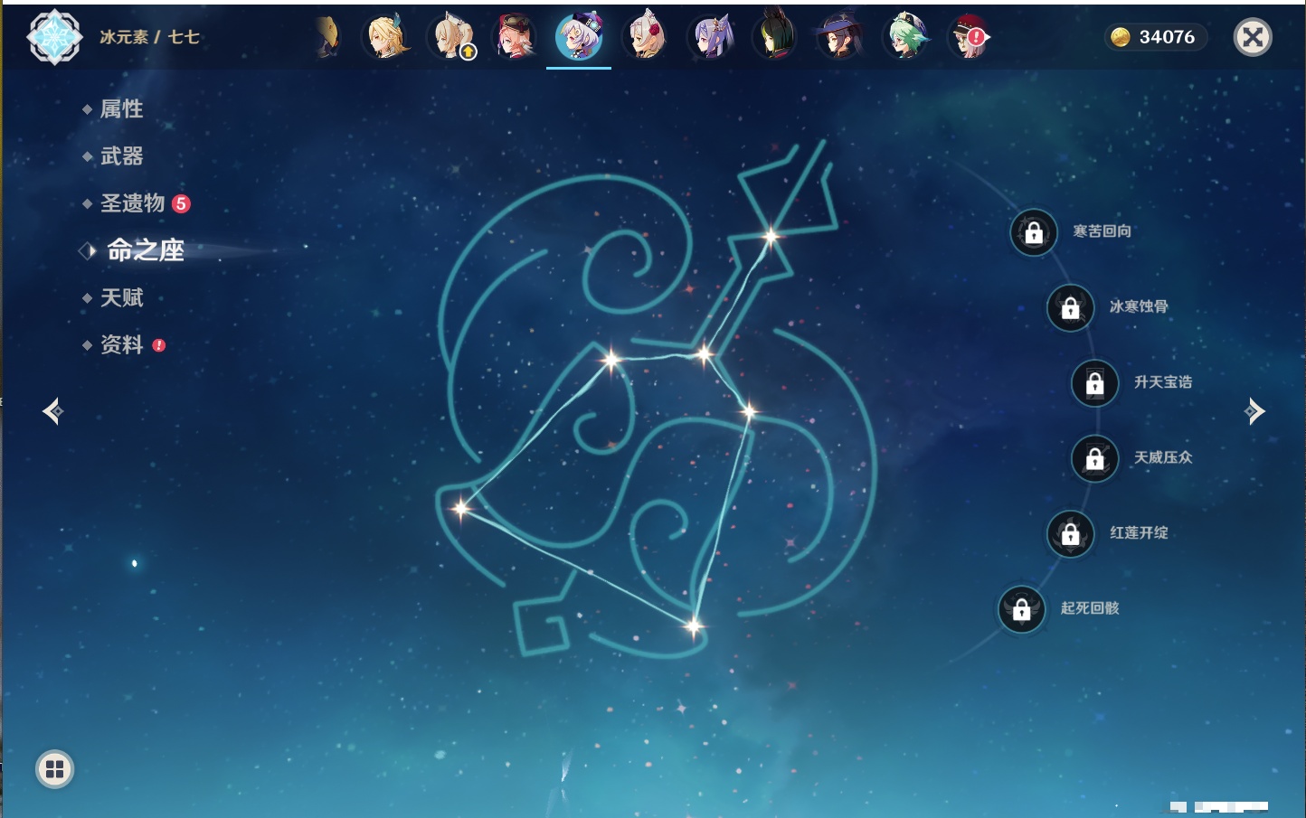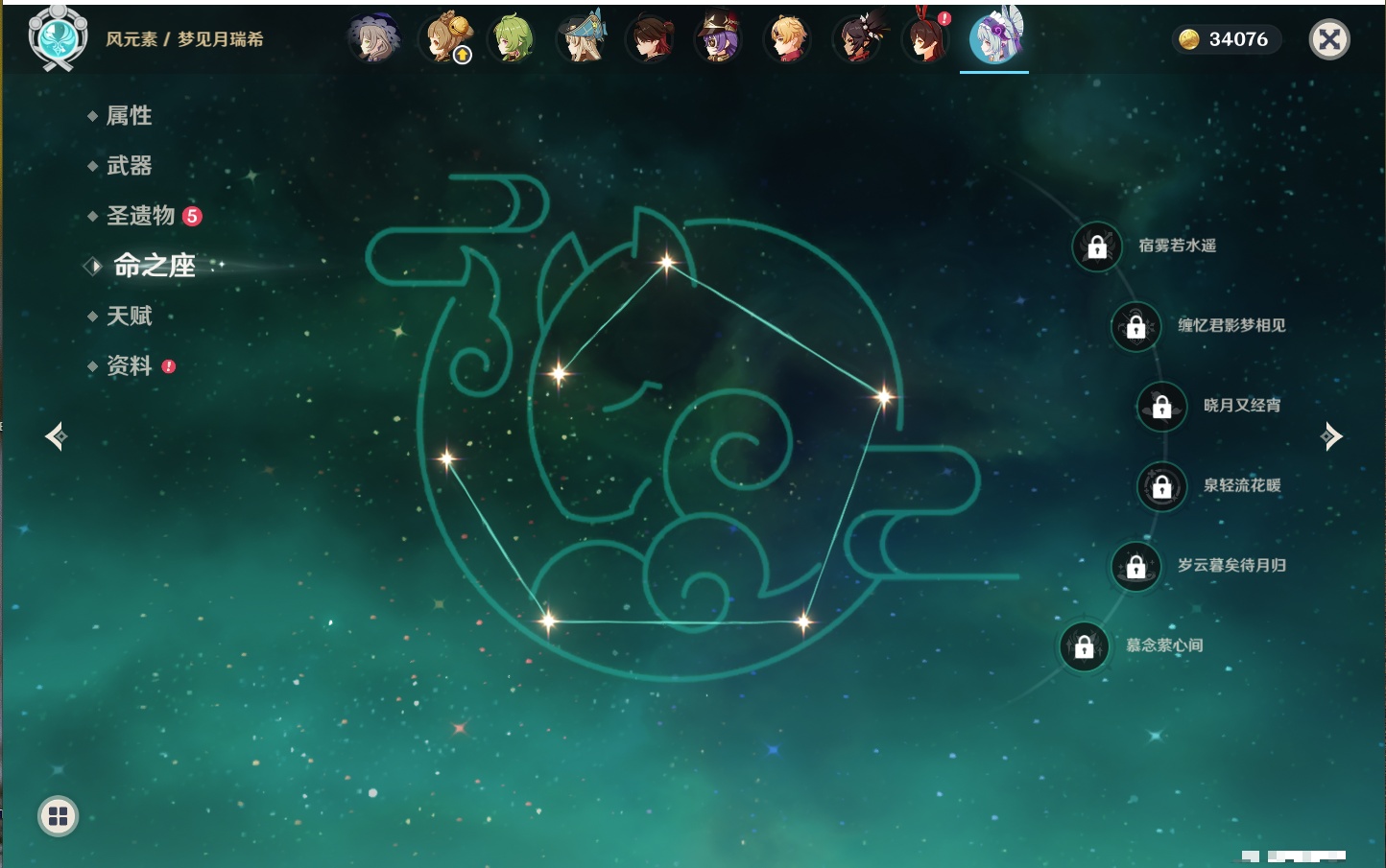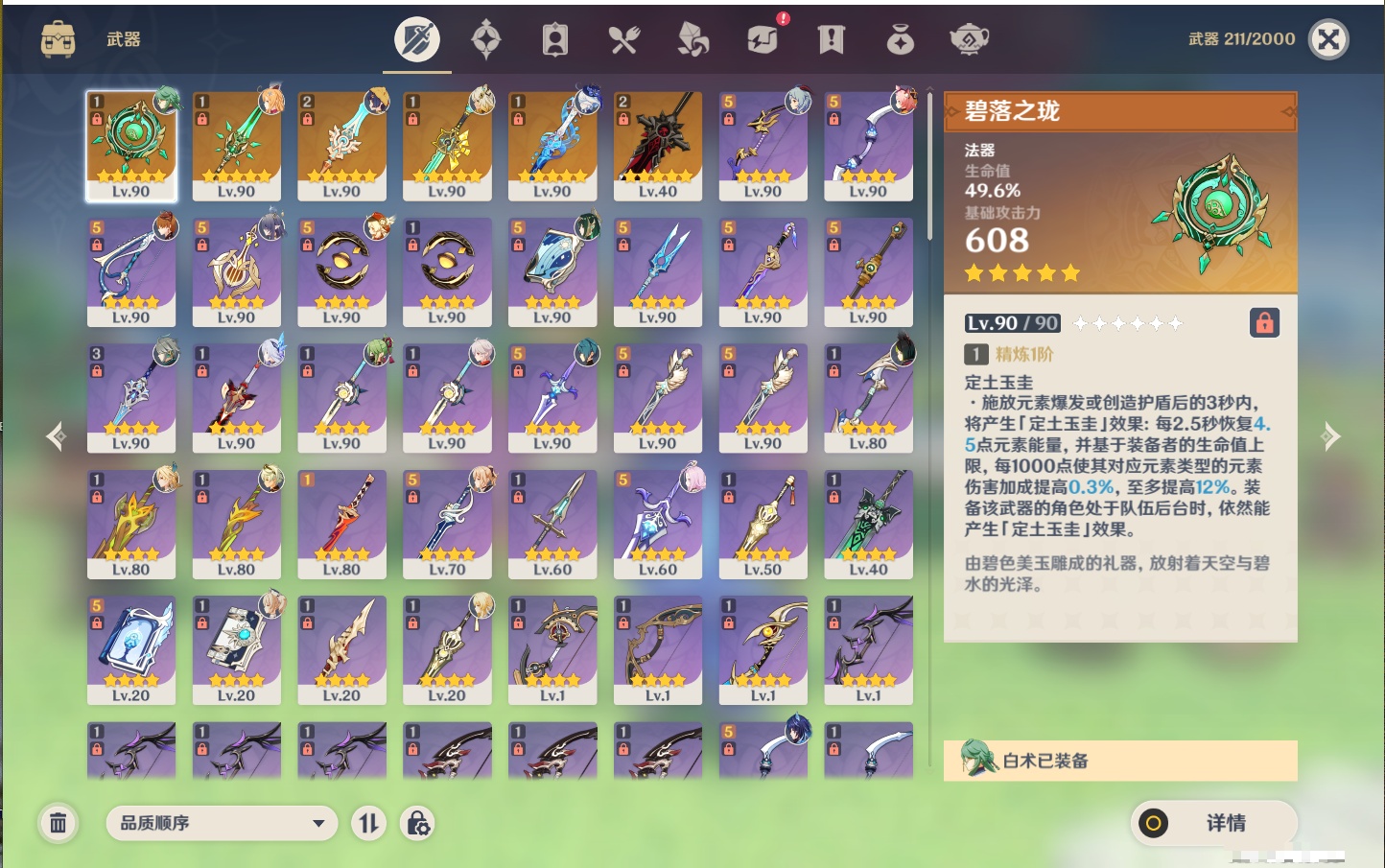 【6个五星武器】,精2天空之脊,精2狼的末路,精1碧落之珑,精1和璞鸢,精1岩峰巡歌,精1静水流涌之辉,