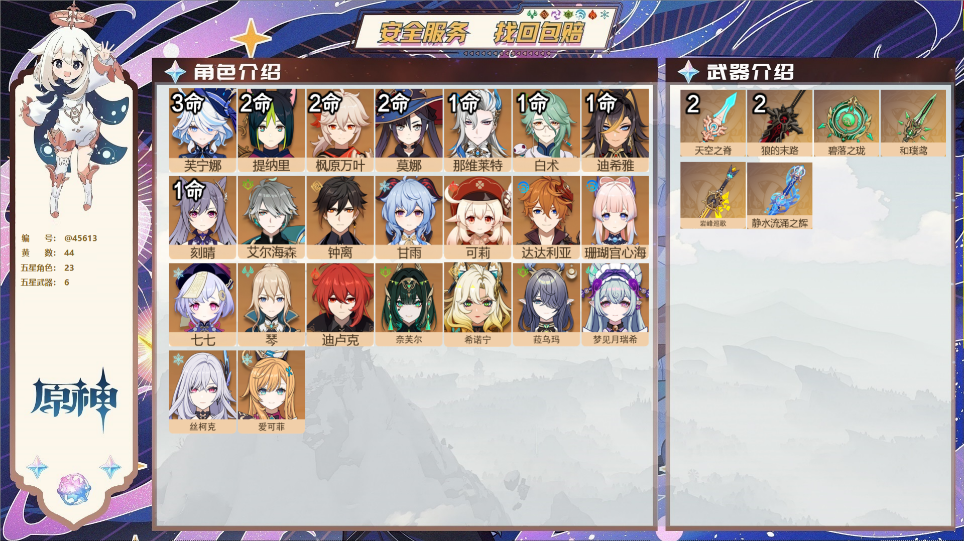 PX_2239482- 邮箱不出售 冒险等级60级 女主 44黄 23个五星角色 6个五星武器 纠缠之源0--原石1121--圣遗物573--【时装】,岁夜欢哗,倩影游侠,帆影游风,