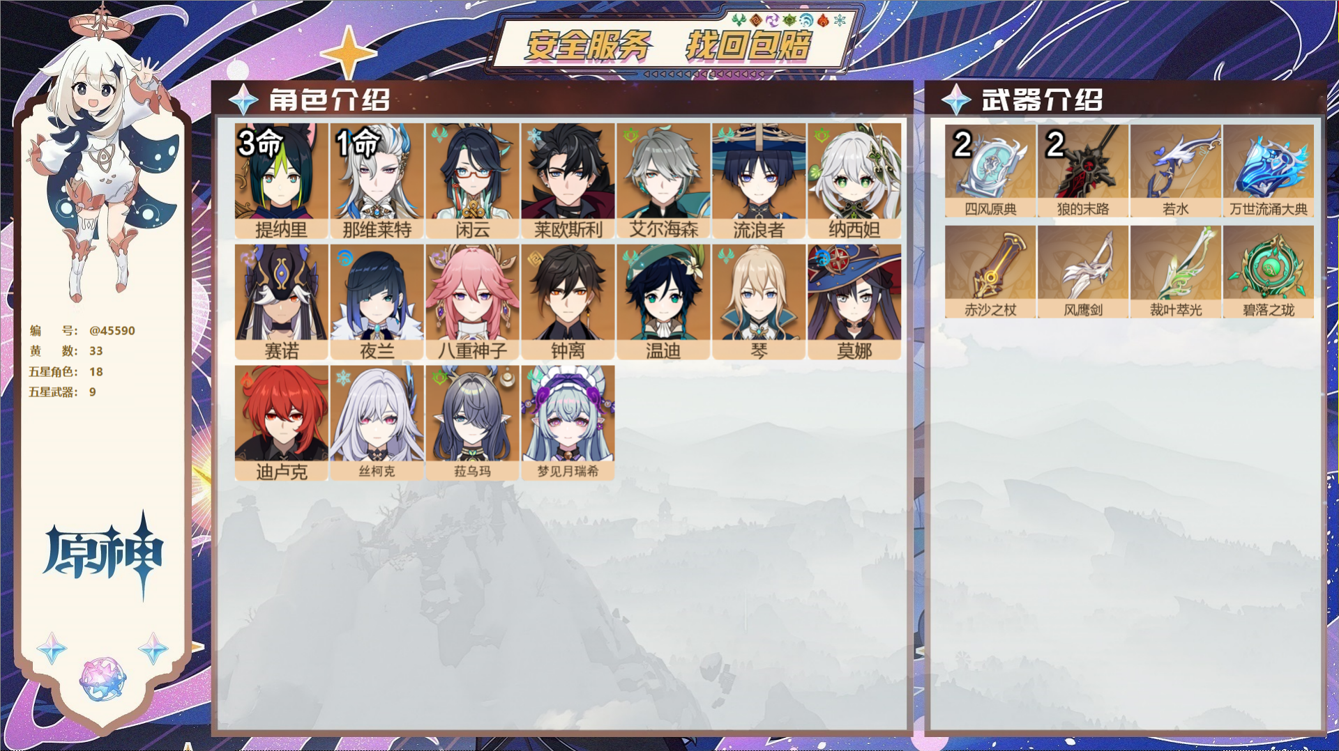 【18个五星角色】,3命提纳里,1命那维莱特,0命闲云,0命莱欧斯利,0命艾尔海森,0命流浪者,0命纳西妲,0命赛诺,0命夜兰,0命八重神子,0命钟离,0命温迪,0命琴,0命莫娜,0命迪卢克,0命丝柯克,0命菈乌玛,0命梦见月瑞希,