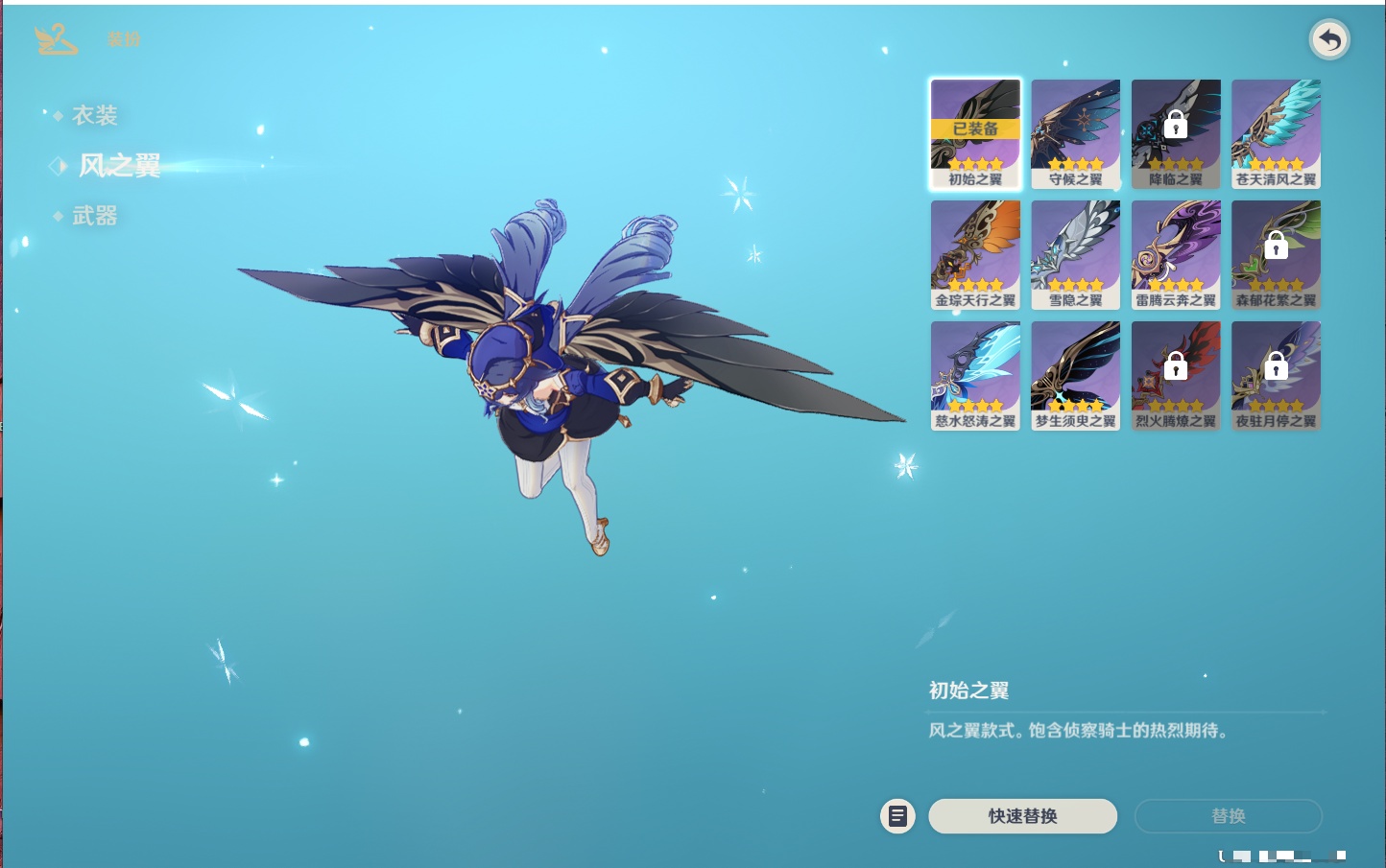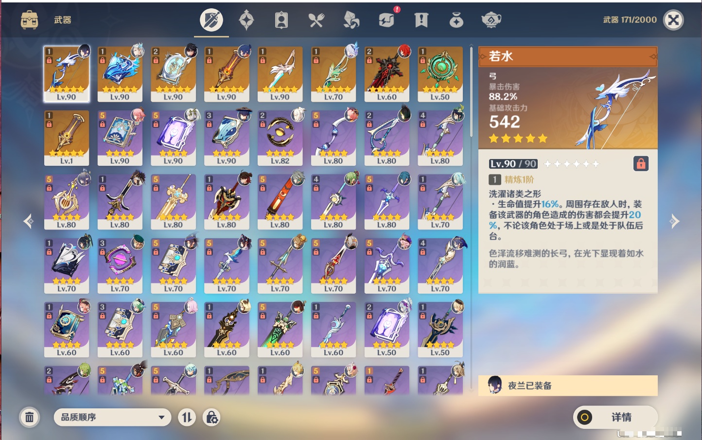 【9个五星武器】,精2四风原典,精2狼的末路,精1若水,精1万世流涌大典,精1赤沙之杖,精1风鹰剑,精1裁叶萃光,精1碧落之珑,