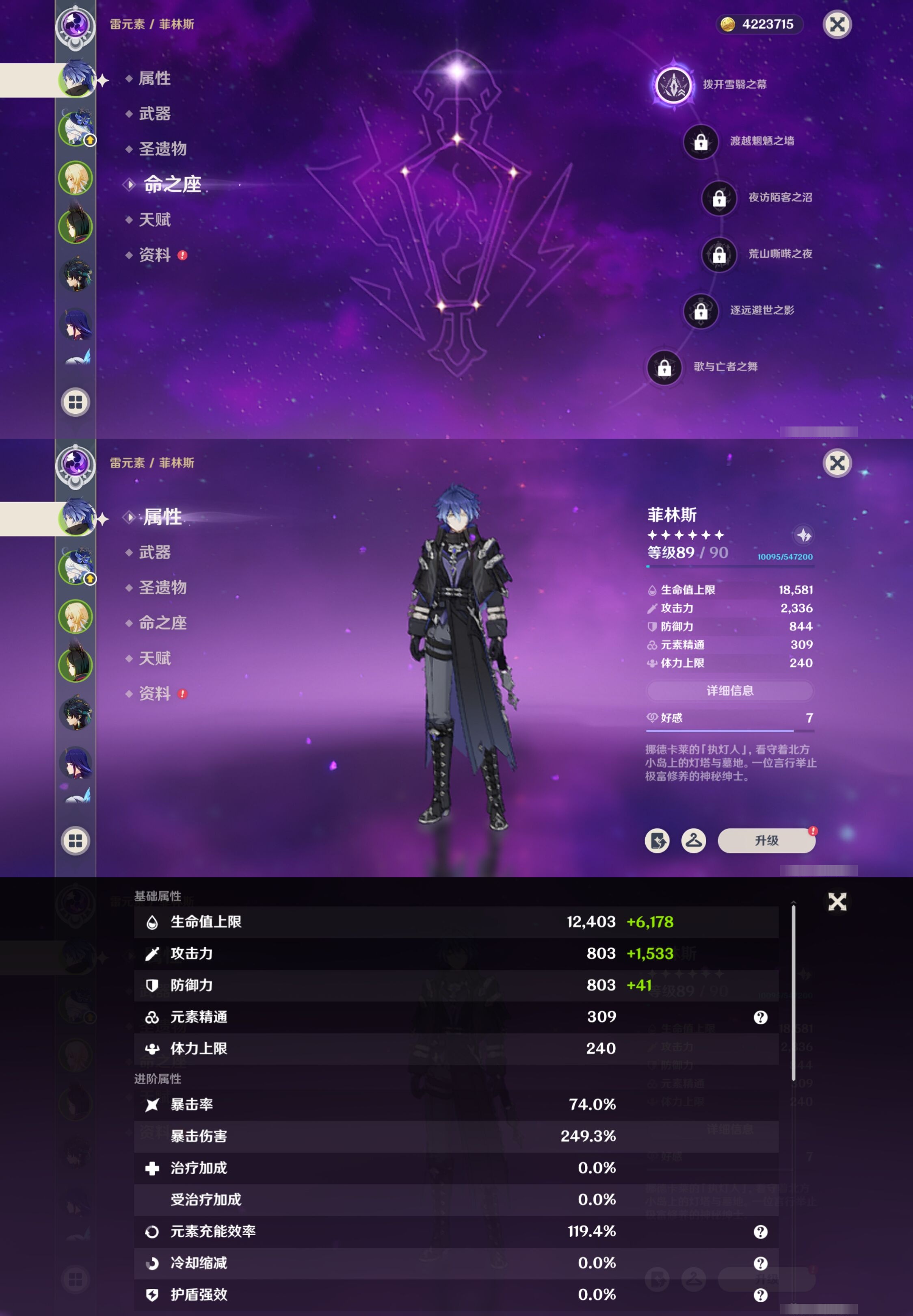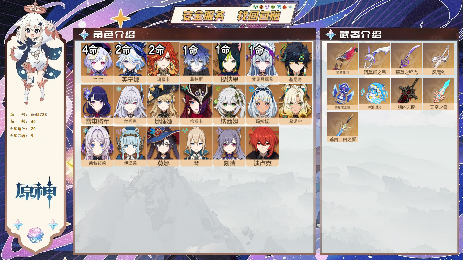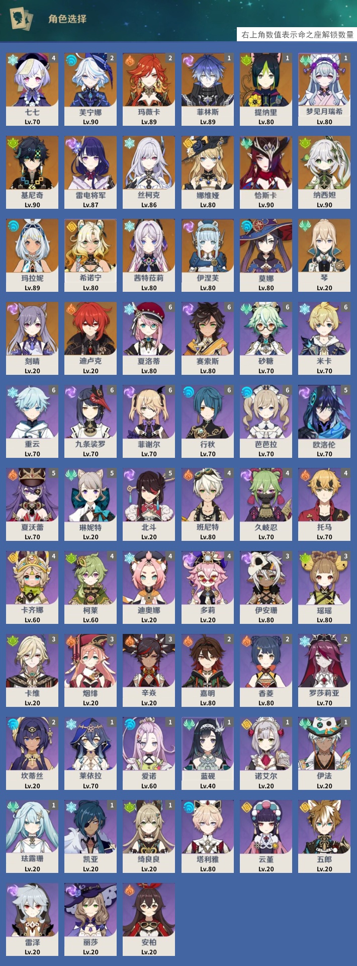 【20个五星角色】,4命七七,2命芙宁娜,2命玛薇卡,1命菲林斯,1命提纳里,1命梦见月瑞希,0命基尼奇,0命雷电将军,0命丝柯克,0命娜维娅,0命恰斯卡,0命纳西妲,0命玛拉妮,0命希诺宁,0命茜特菈莉,0命伊涅芙,0命莫娜,0命琴,0命刻晴,0命迪卢克,