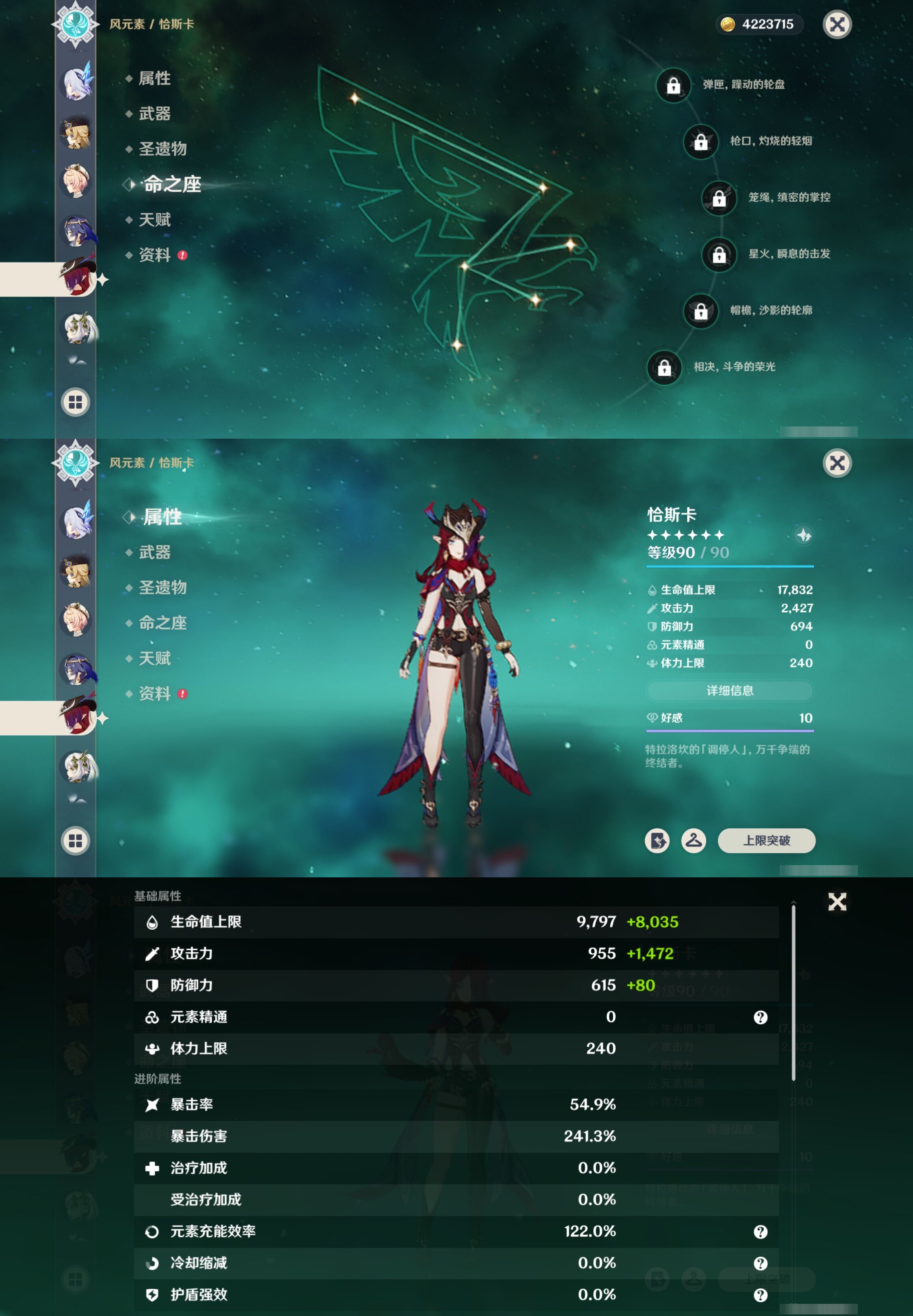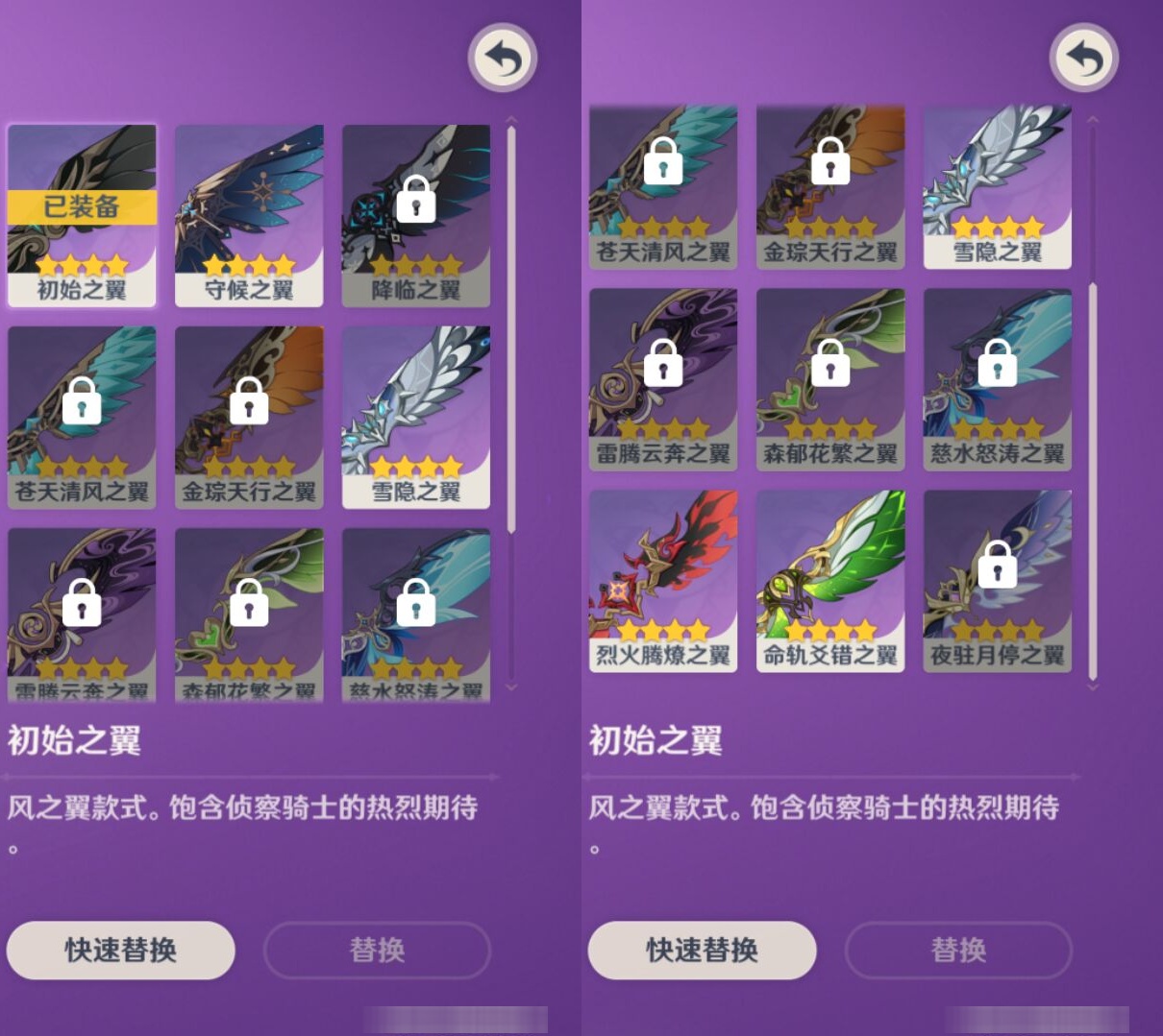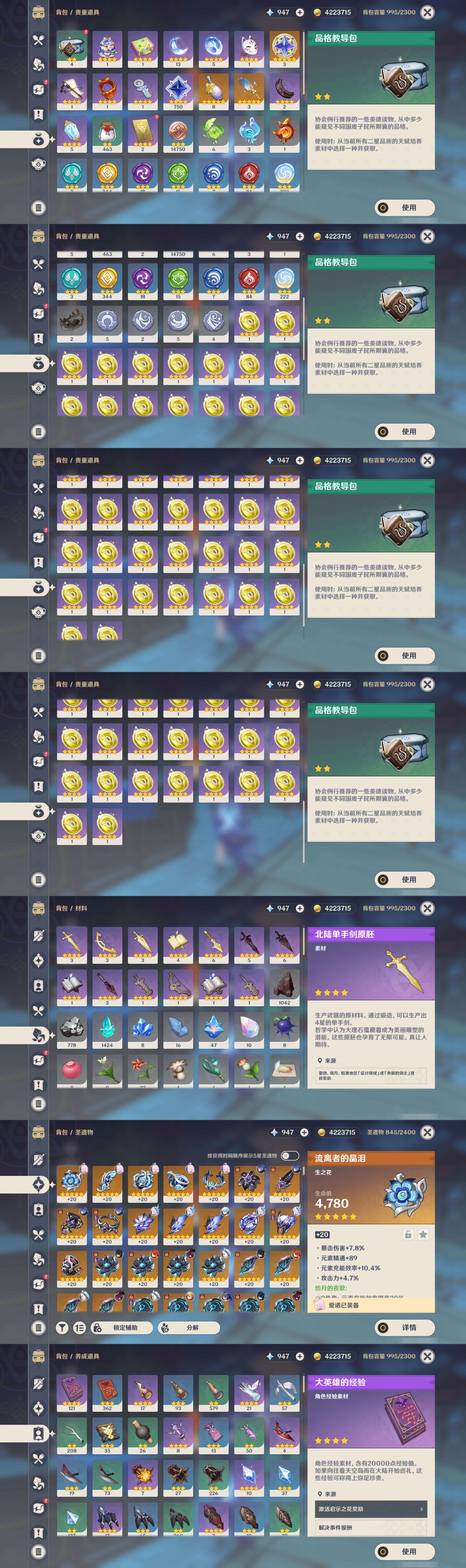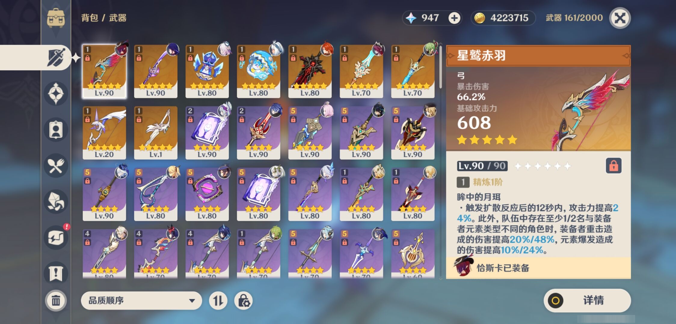 【9个五星武器】,精1星鹫赤羽,精1阿莫斯之弓,精1薙草之稻光,精1风鹰剑,精1祭星者之望,精1冲浪时光,精1狼的末路,精1天空之脊,精1苍古自由之誓,