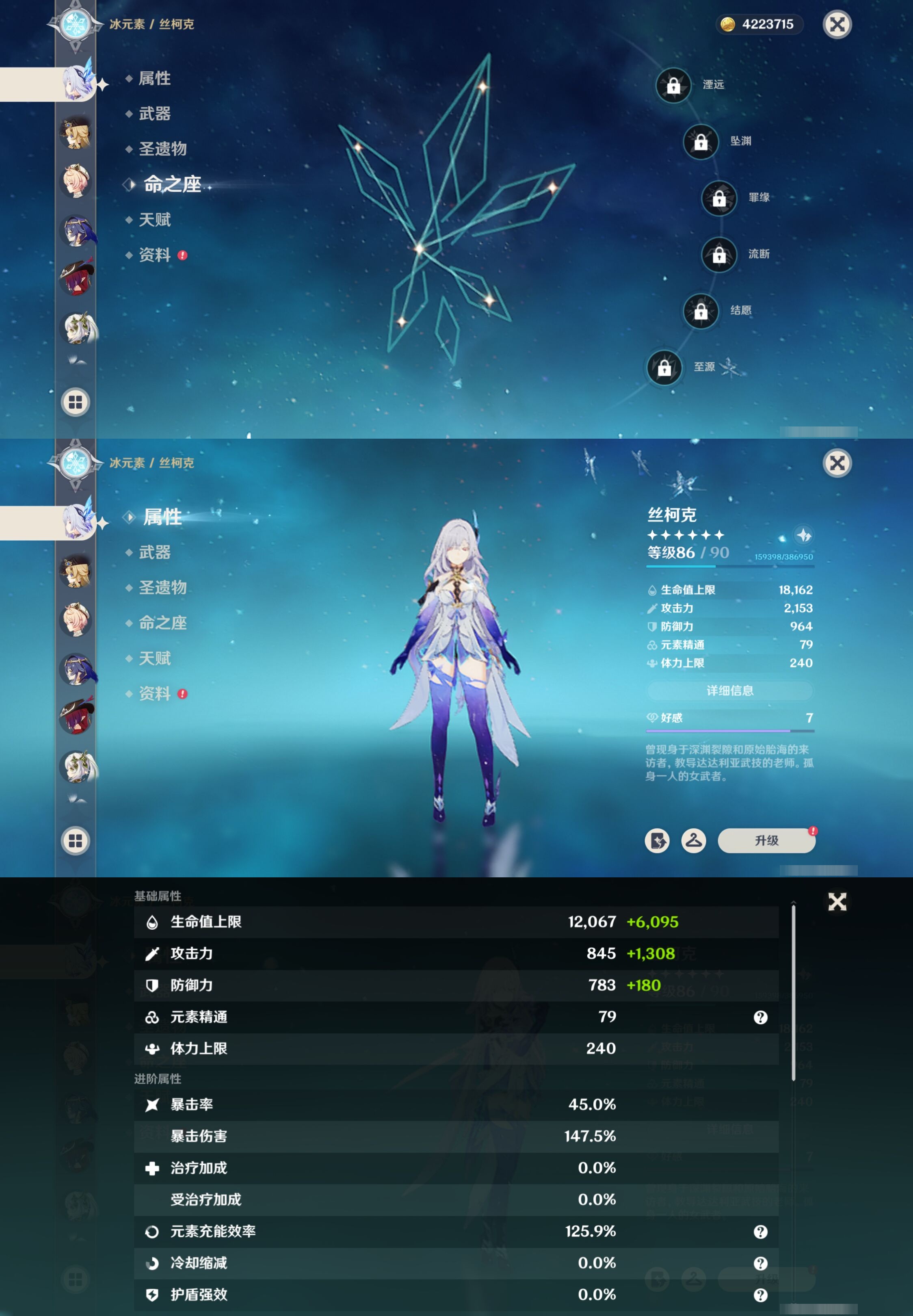 PX_2245204- 未绑定邮箱 冒险等级59级 女主 40黄 20个五星角色 9个五星武器 纠缠之源0--原石947--圣遗物845--【时装】,炽绘奇旅,岁夜欢哗,