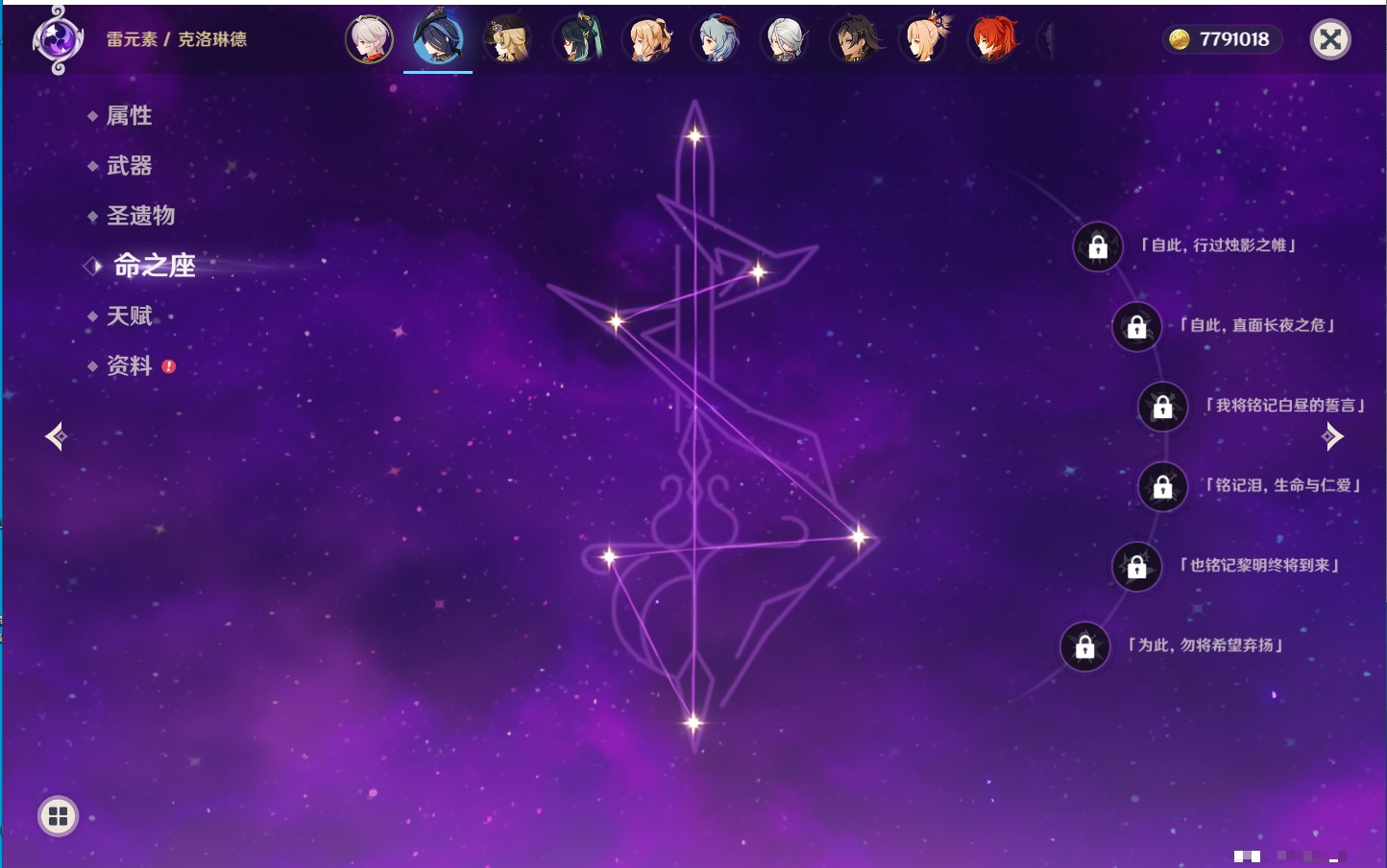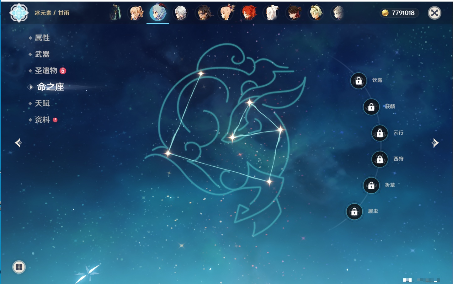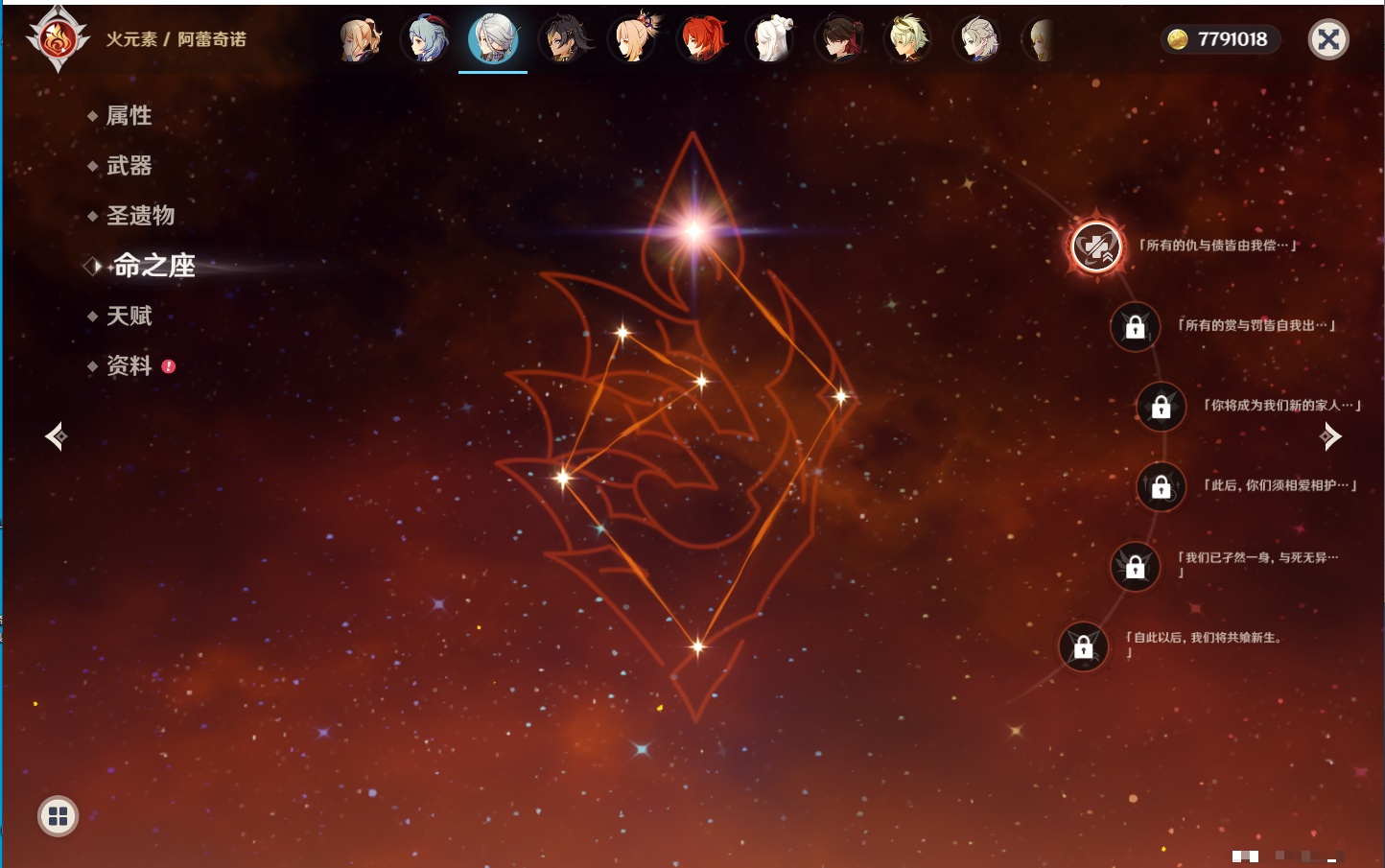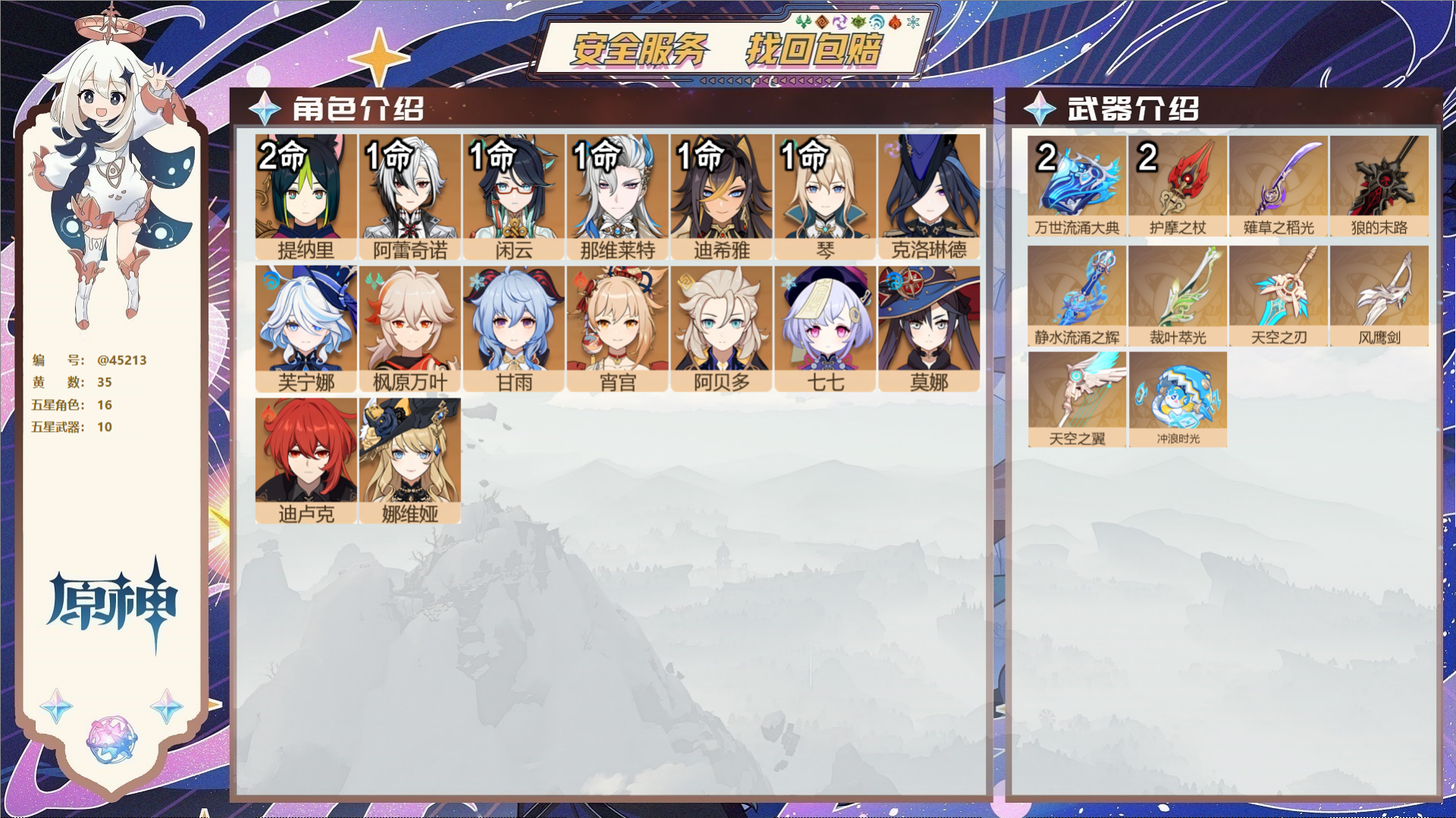 【16个五星角色】,2命提纳里,1命阿蕾奇诺,1命闲云,1命那维莱特,1命迪希雅,1命琴,0命克洛琳德,0命芙宁娜,0命枫原万叶,0命甘雨,0命宵宫,0命阿贝多,0命七七,0命莫娜,0命迪卢克,0命娜维娅,