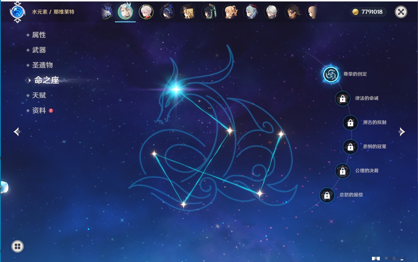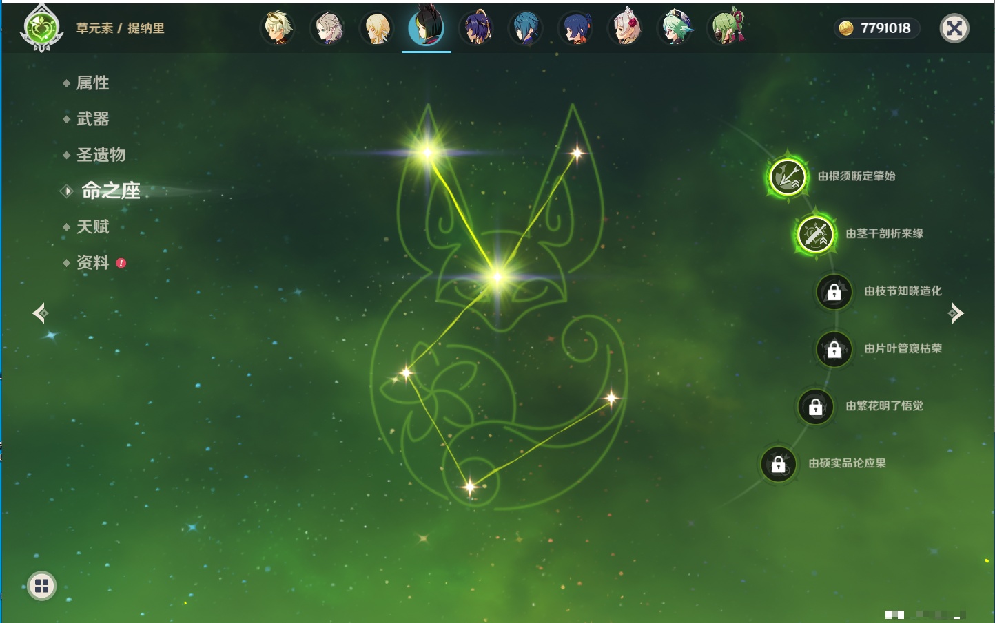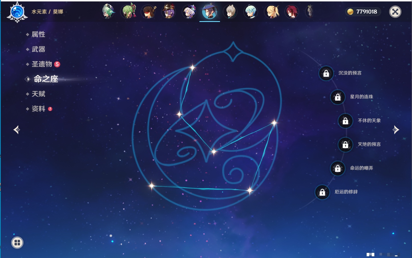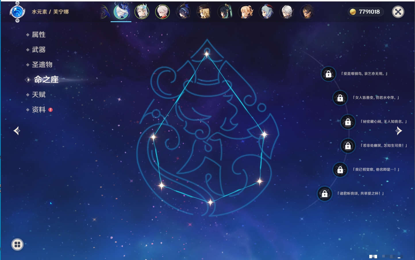 【16个五星角色】,2命提纳里,1命阿蕾奇诺,1命闲云,1命那维莱特,1命迪希雅,1命琴,0命克洛琳德,0命芙宁娜,0命枫原万叶,0命甘雨,0命宵宫,0命阿贝多,0命七七,0命莫娜,0命迪卢克,0命娜维娅,