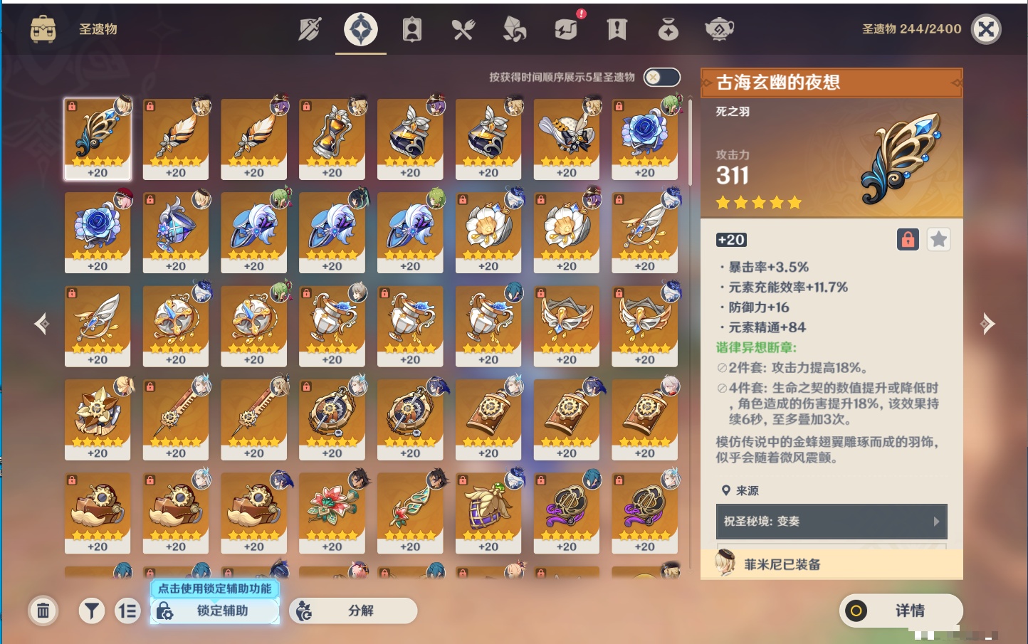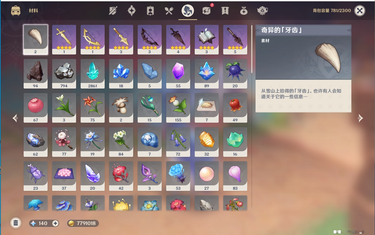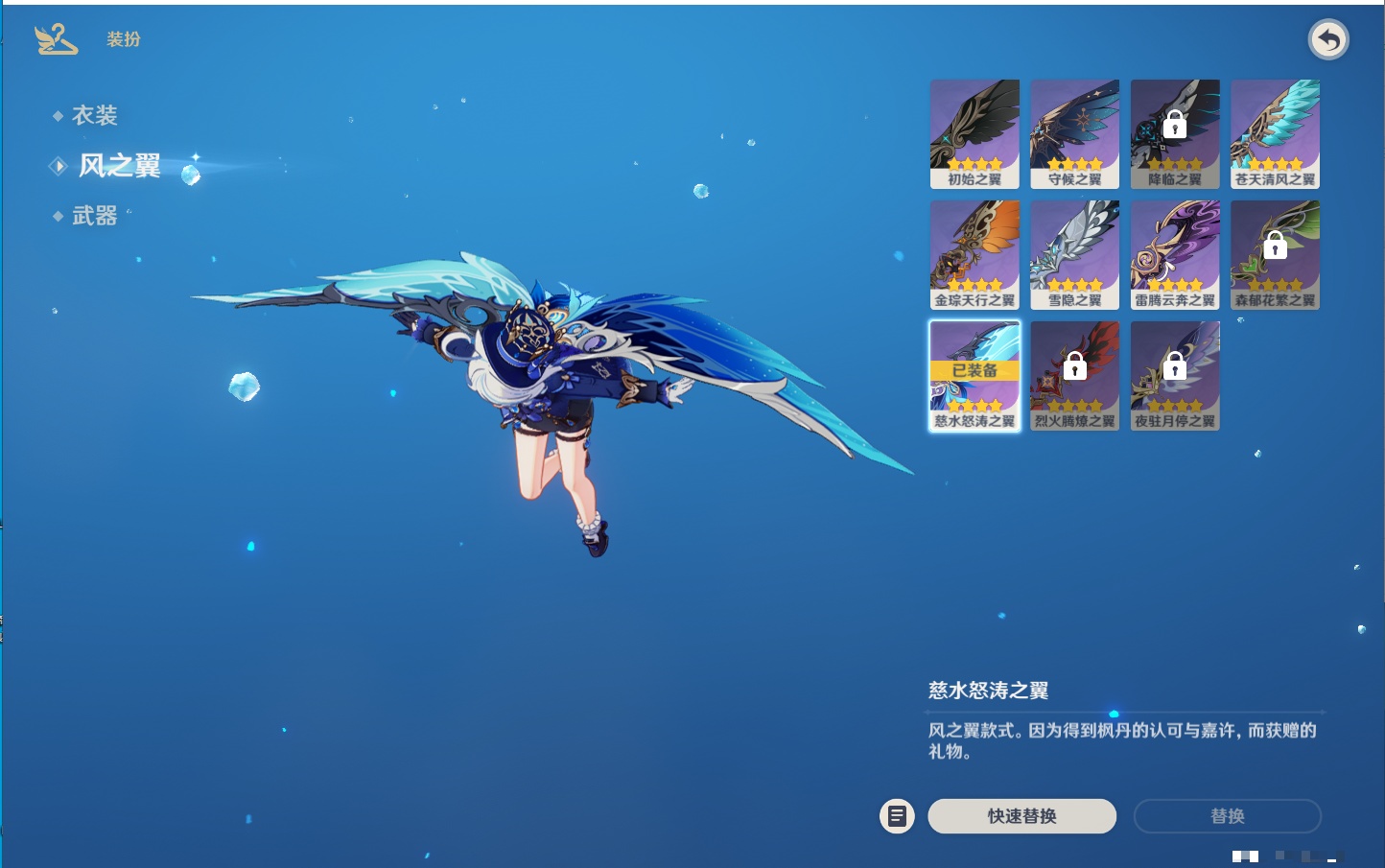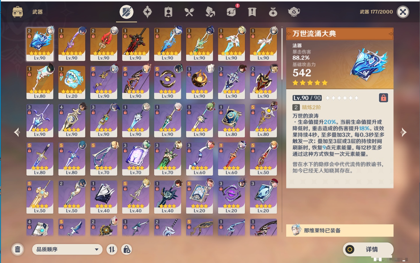 【10个五星武器】,精2万世流涌大典,精2护摩之杖,精1薙草之稻光,精1狼的末路,精1静水流涌之辉,精1裁叶萃光,精1天空之刃,精1风鹰剑,精1天空之翼,精1冲浪时光,