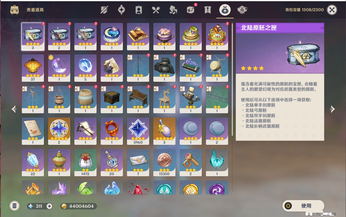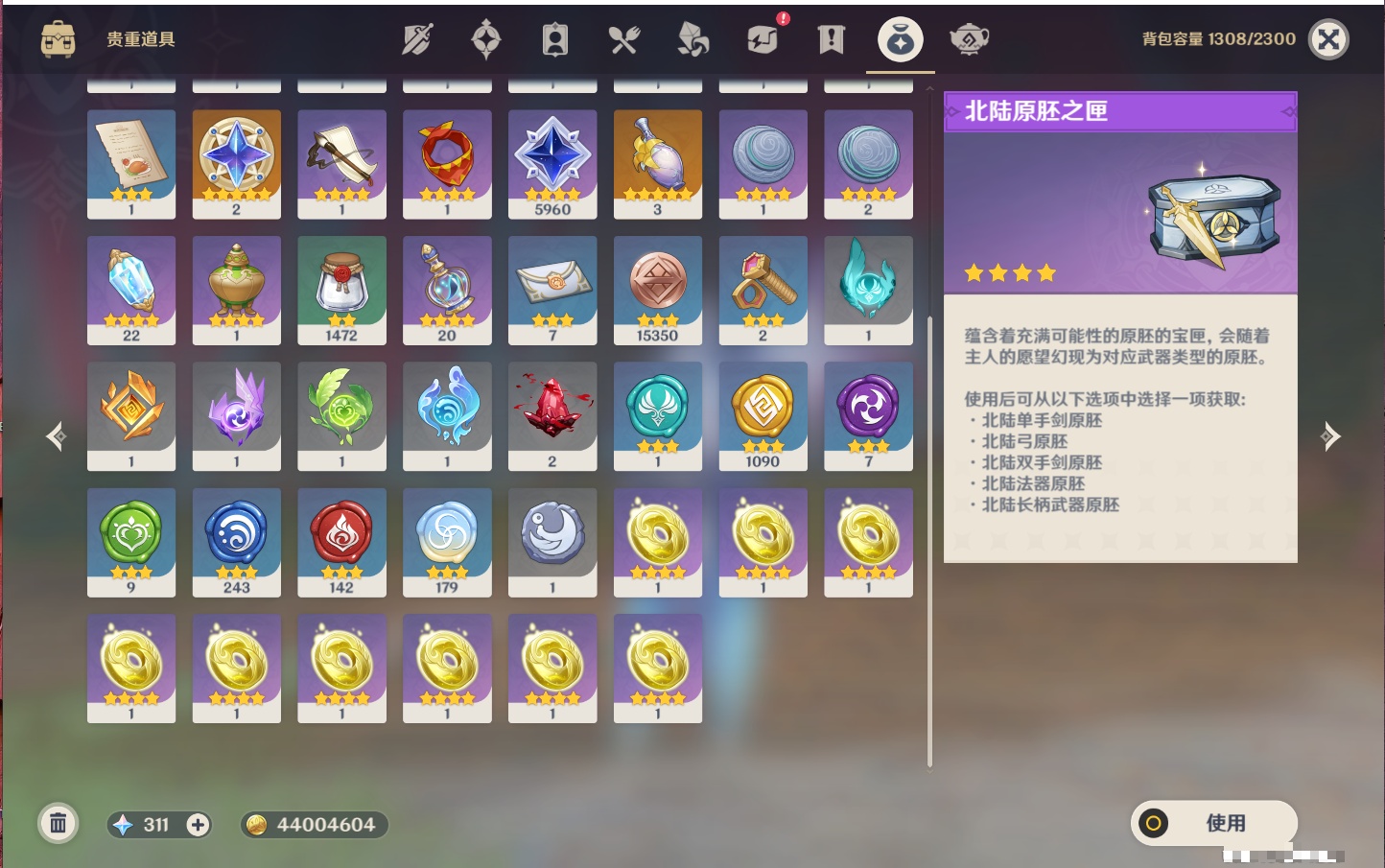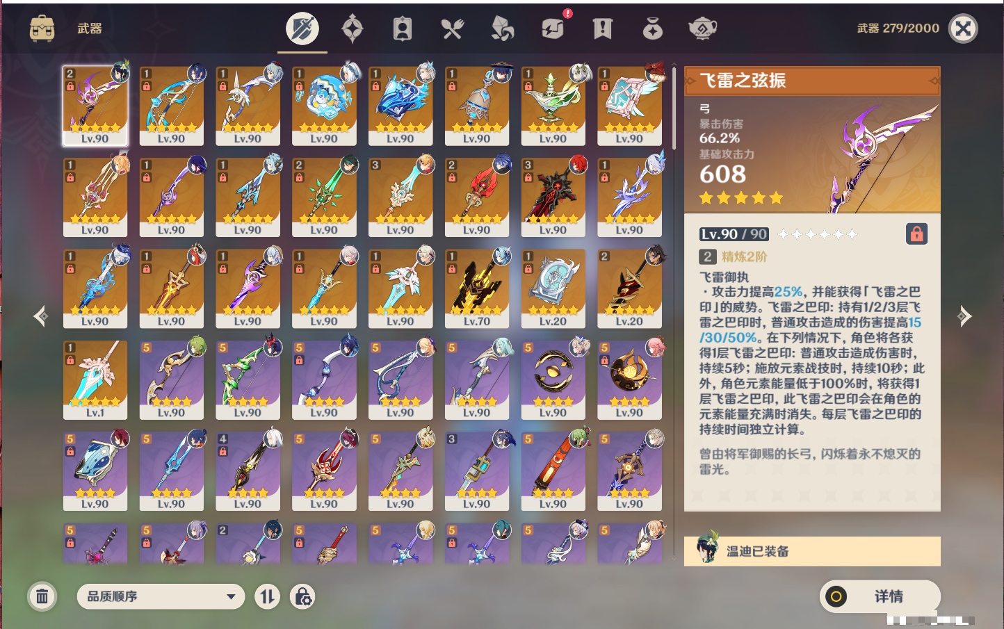 【25个五星武器】,精3天空之脊,精3狼的末路,精2飞雷之弦振,精2和璞鸢,精2护摩之杖,精2赤角石溃杵,精1终末嗟叹之诗,精1阿莫斯之弓,精1冲浪时光,精1万世流涌大典,精1图莱杜拉的回忆,精1千夜浮梦,精1天空之卷,精1香韵奏者,精1薙草之稻光,精1息灾,精1苍耀,精1静水流涌之辉,精1圣显之钥,精1雾切之回光,精1苍古自由之誓,精1天空之刃,精1无工之剑,精1四风原典,精1天空之傲,