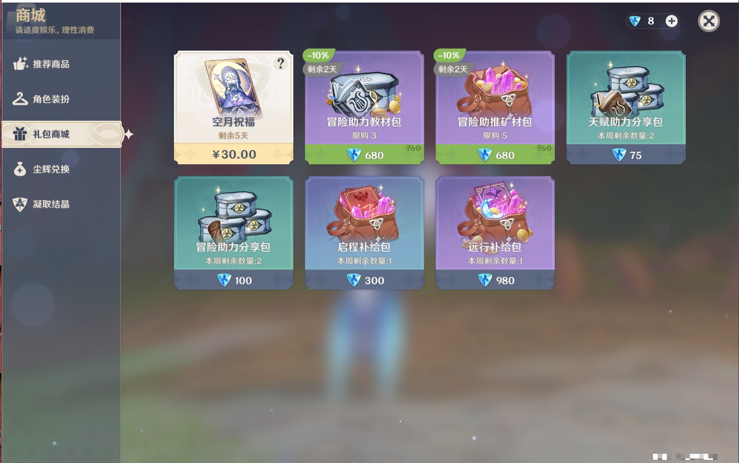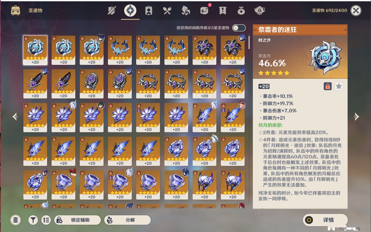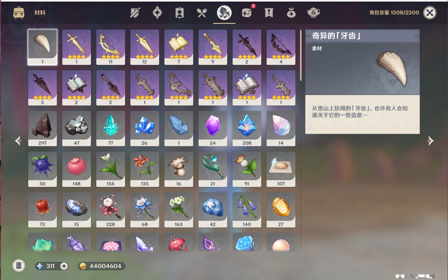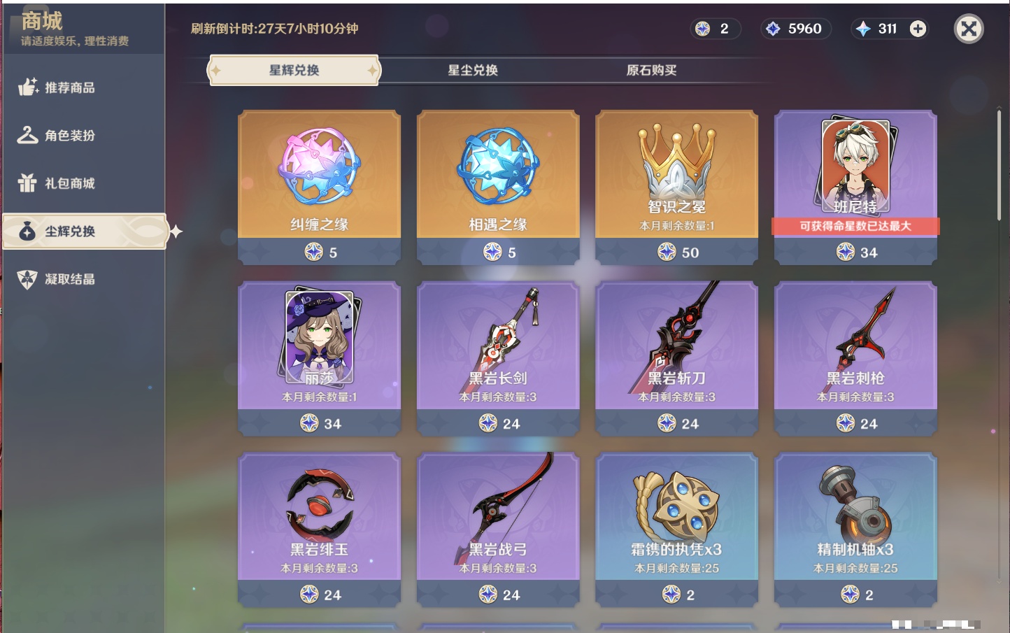 【25个五星武器】,精3天空之脊,精3狼的末路,精2飞雷之弦振,精2和璞鸢,精2护摩之杖,精2赤角石溃杵,精1终末嗟叹之诗,精1阿莫斯之弓,精1冲浪时光,精1万世流涌大典,精1图莱杜拉的回忆,精1千夜浮梦,精1天空之卷,精1香韵奏者,精1薙草之稻光,精1息灾,精1苍耀,精1静水流涌之辉,精1圣显之钥,精1雾切之回光,精1苍古自由之誓,精1天空之刃,精1无工之剑,精1四风原典,精1天空之傲,