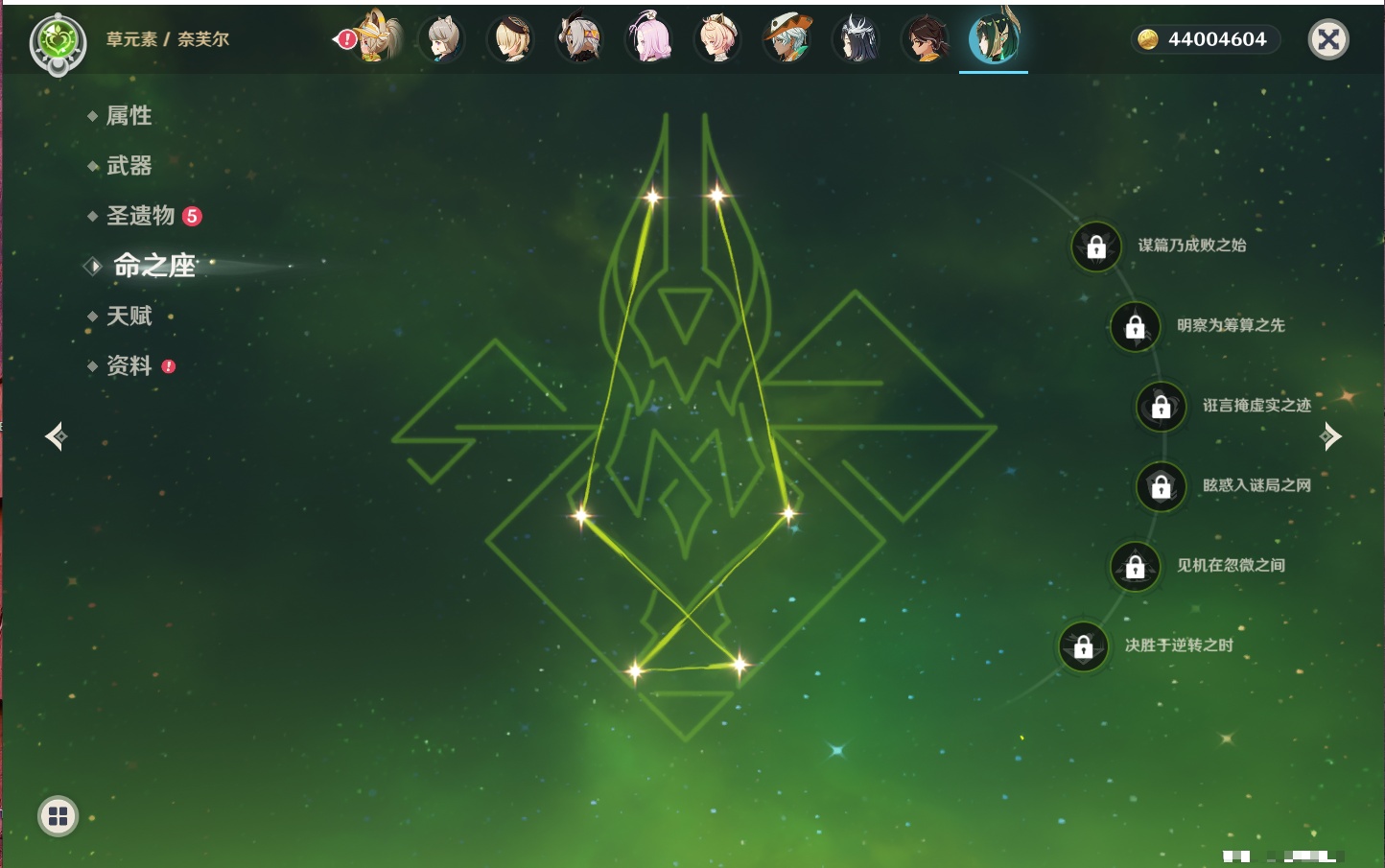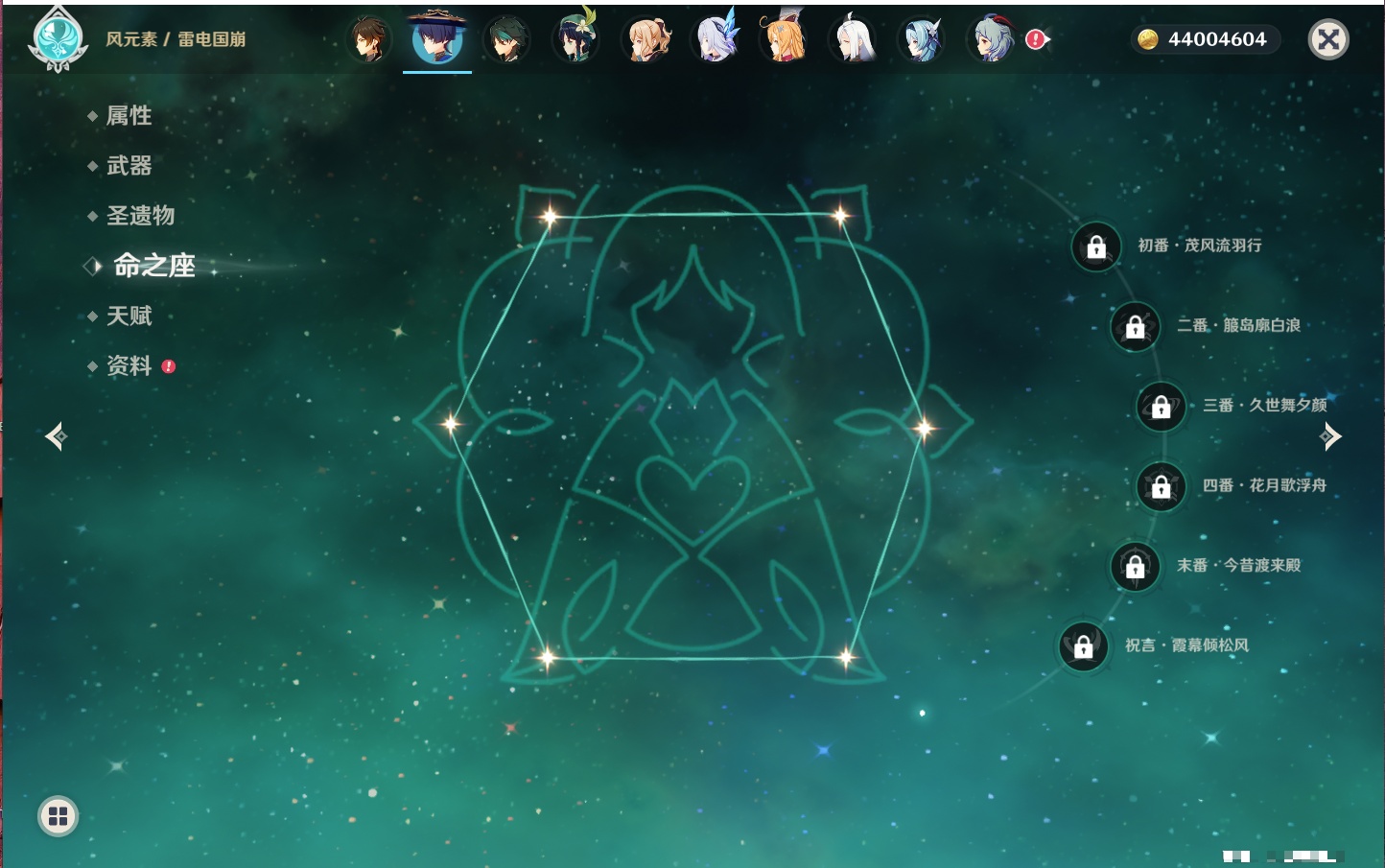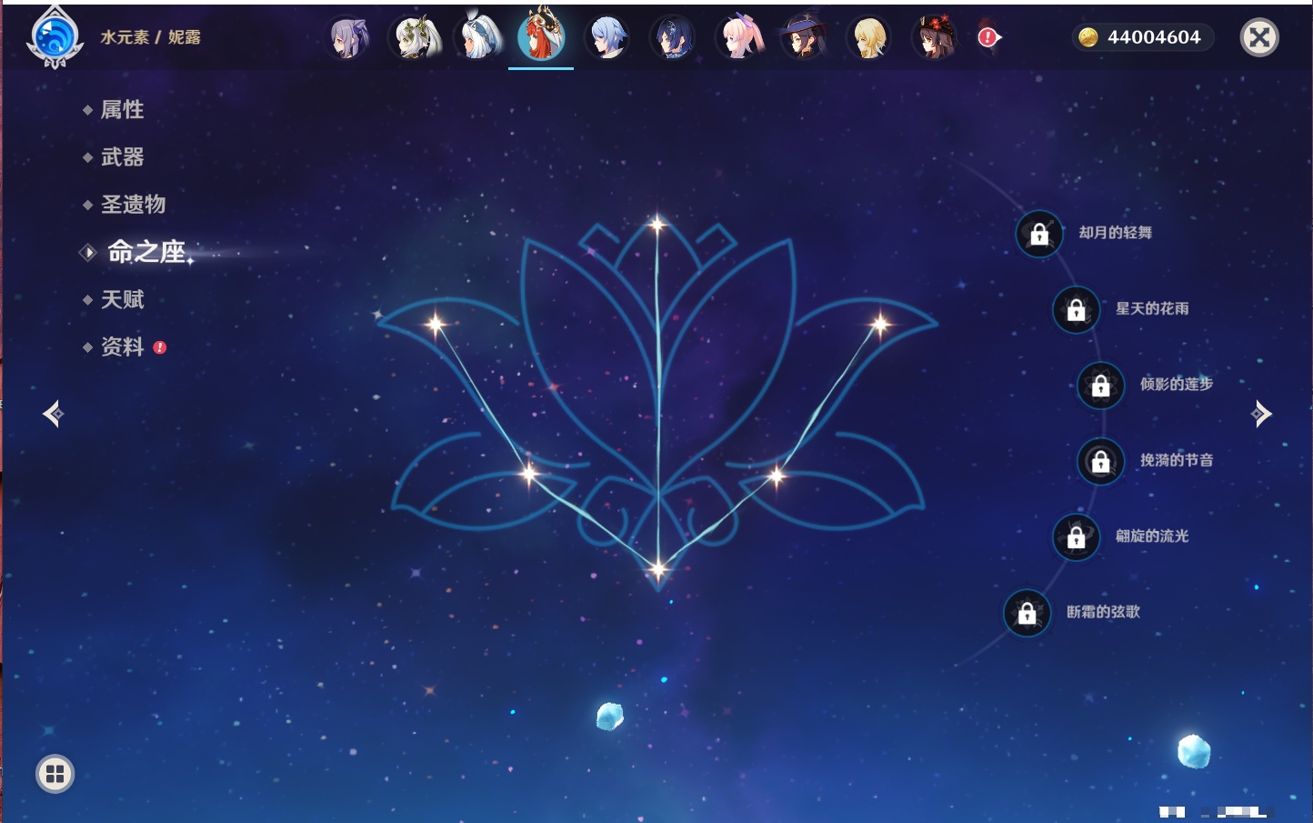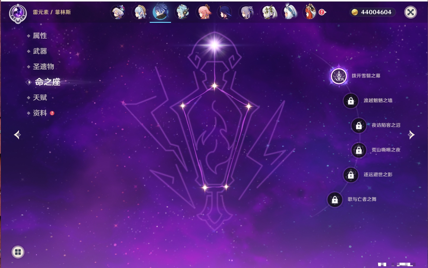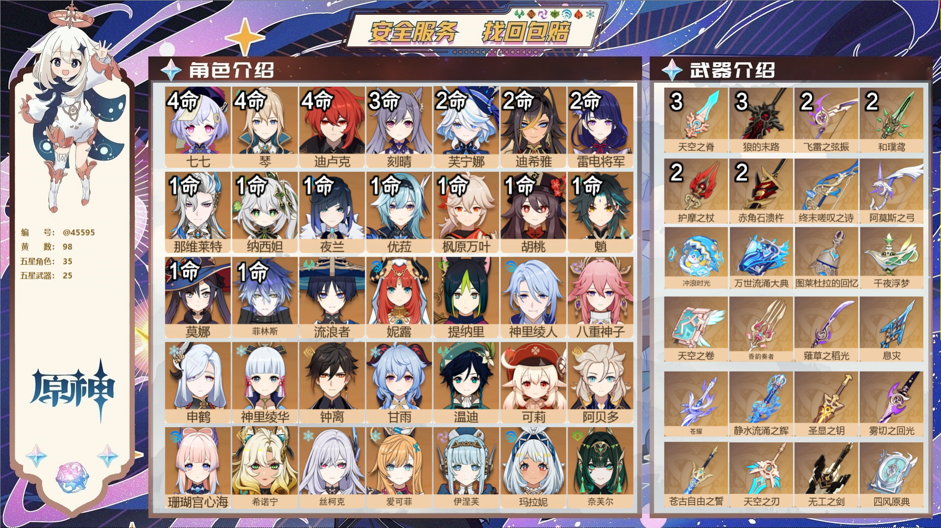 【35个五星角色】,4命七七,4命琴,4命迪卢克,3命刻晴,2命芙宁娜,2命迪希雅,2命雷电将军,1命那维莱特,1命纳西妲,1命夜兰,1命优菈,1命枫原万叶,1命胡桃,1命魈,1命莫娜,1命菲林斯,0命流浪者,0命妮露,0命提纳里,0命神里绫人,0命八重神子,0命申鹤,0命神里绫华,0命钟离,0命甘雨,0命温迪,0命可莉,0命阿贝多,0命珊瑚宫心海,0命希诺宁,0命丝柯克,0命爱可菲,0命伊涅芙,0命玛拉妮,0命奈芙尔,
