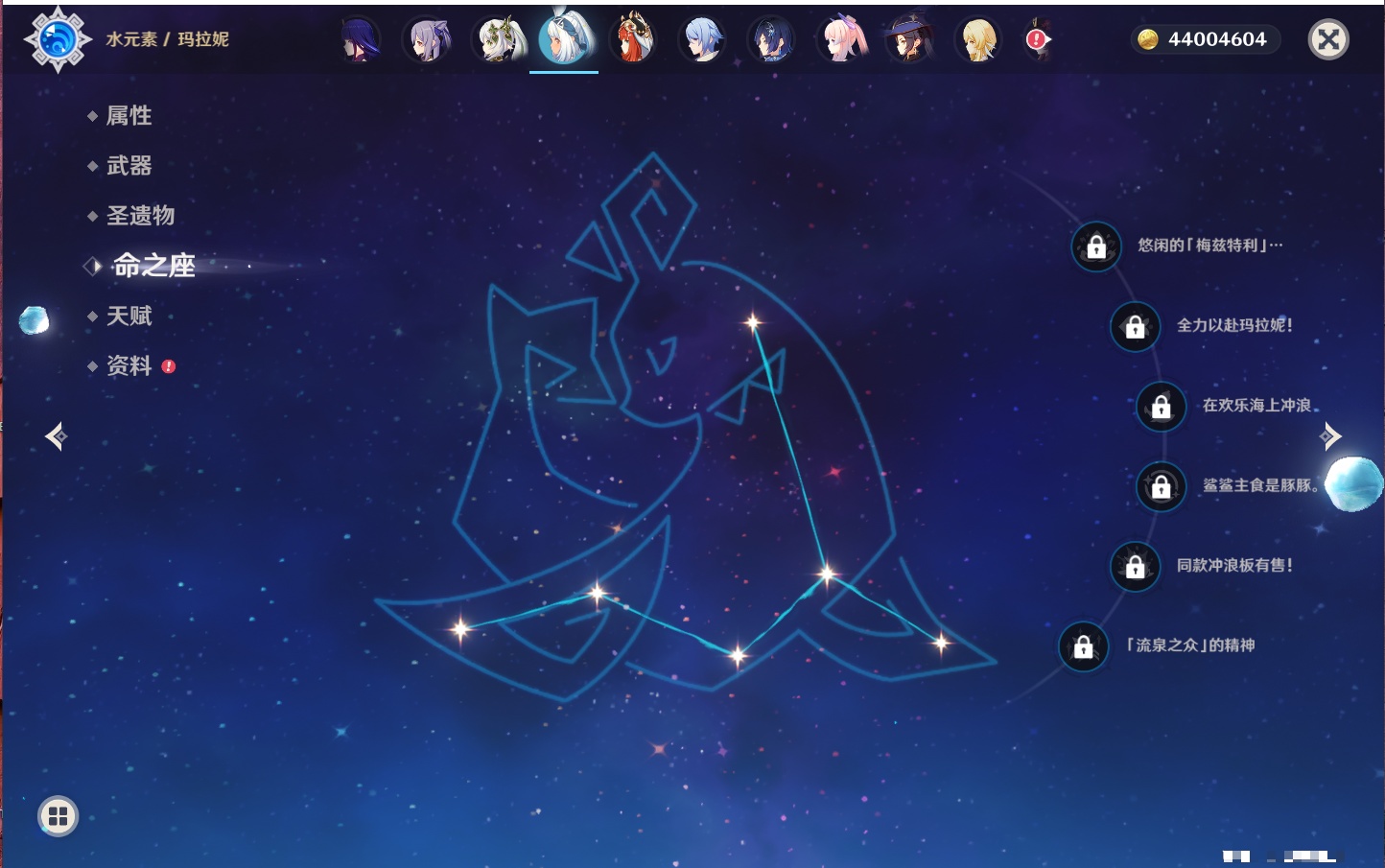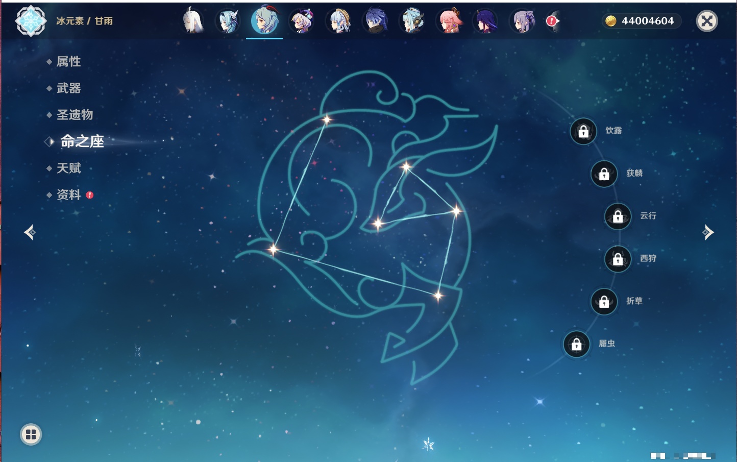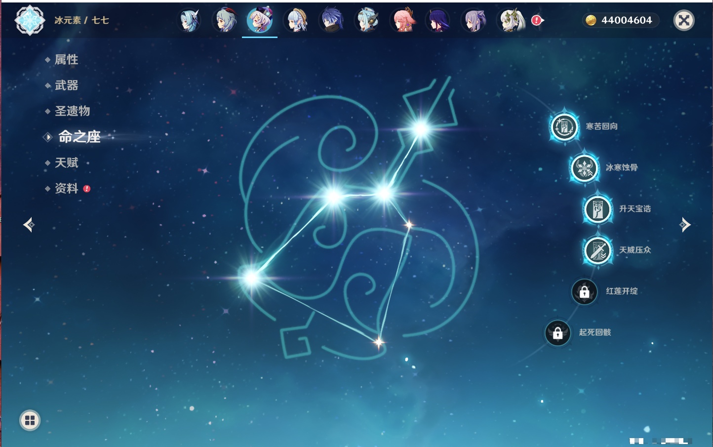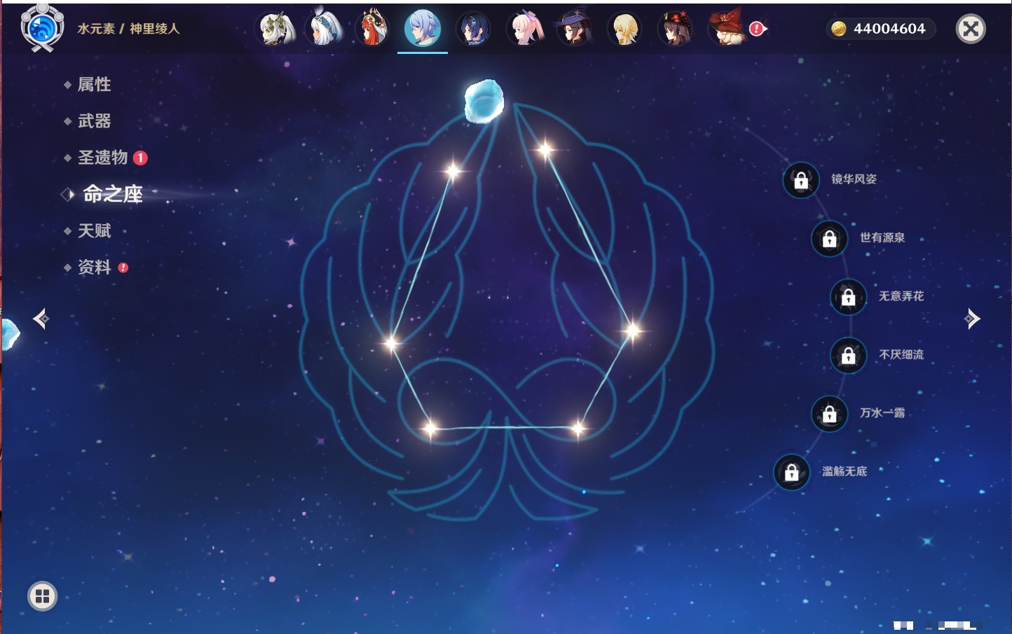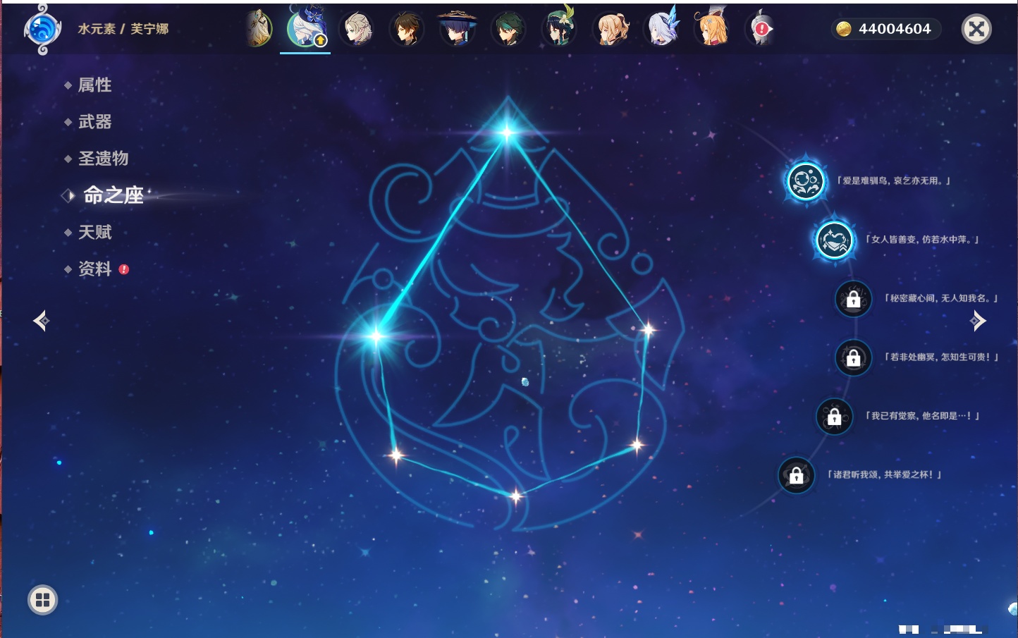 【35个五星角色】,4命七七,4命琴,4命迪卢克,3命刻晴,2命芙宁娜,2命迪希雅,2命雷电将军,1命那维莱特,1命纳西妲,1命夜兰,1命优菈,1命枫原万叶,1命胡桃,1命魈,1命莫娜,1命菲林斯,0命流浪者,0命妮露,0命提纳里,0命神里绫人,0命八重神子,0命申鹤,0命神里绫华,0命钟离,0命甘雨,0命温迪,0命可莉,0命阿贝多,0命珊瑚宫心海,0命希诺宁,0命丝柯克,0命爱可菲,0命伊涅芙,0命玛拉妮,0命奈芙尔,