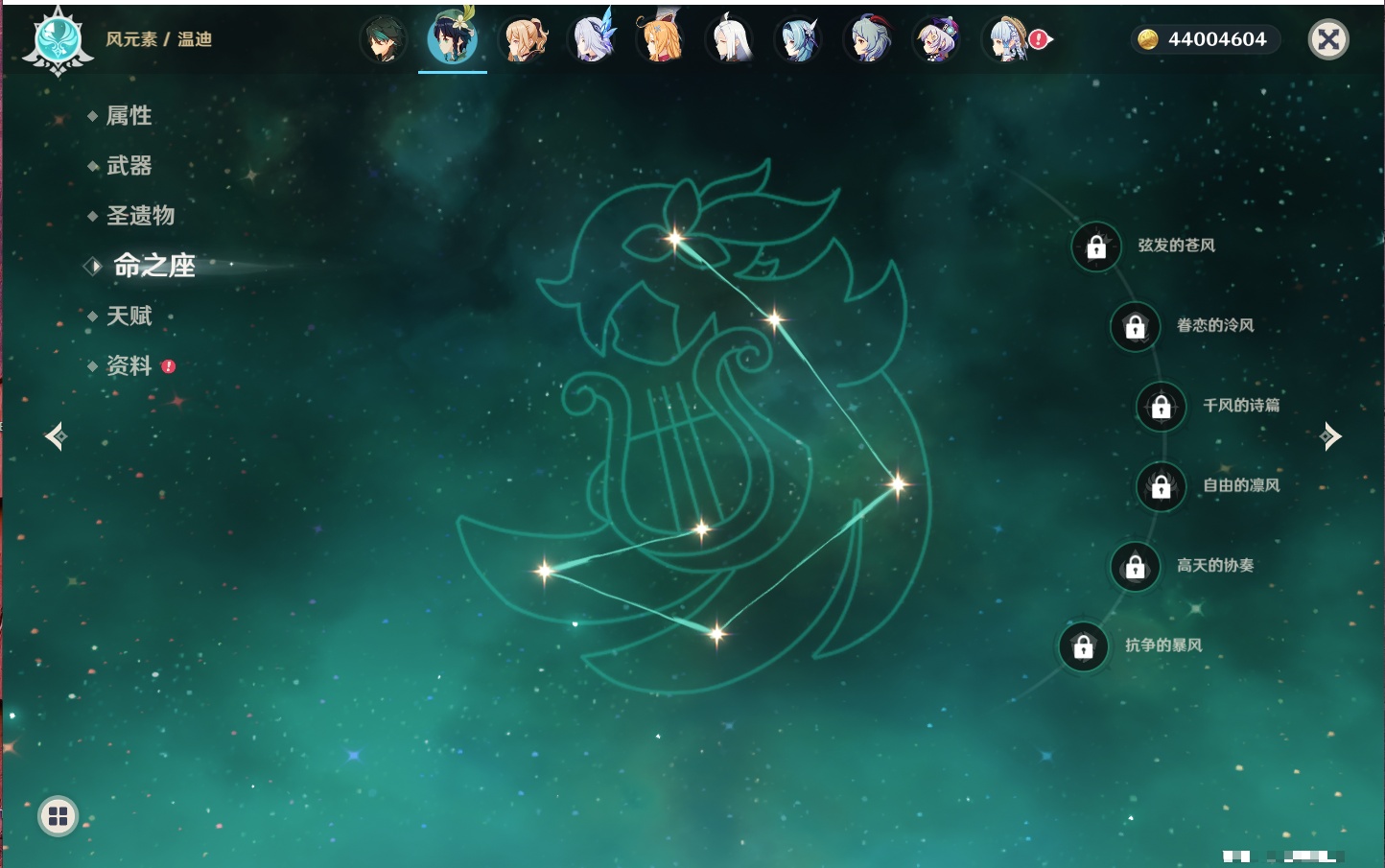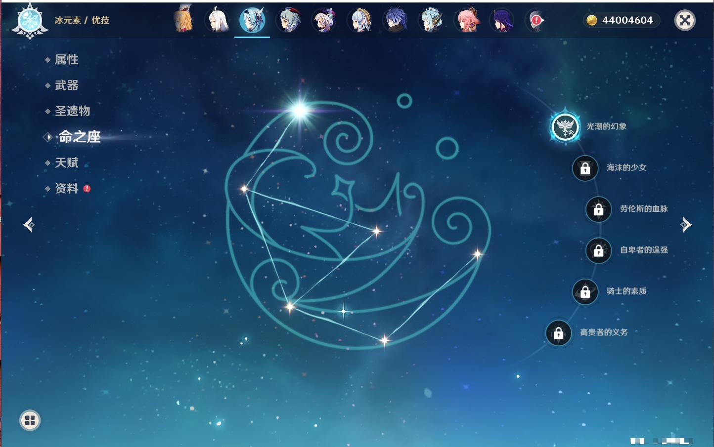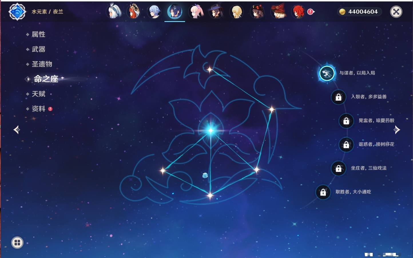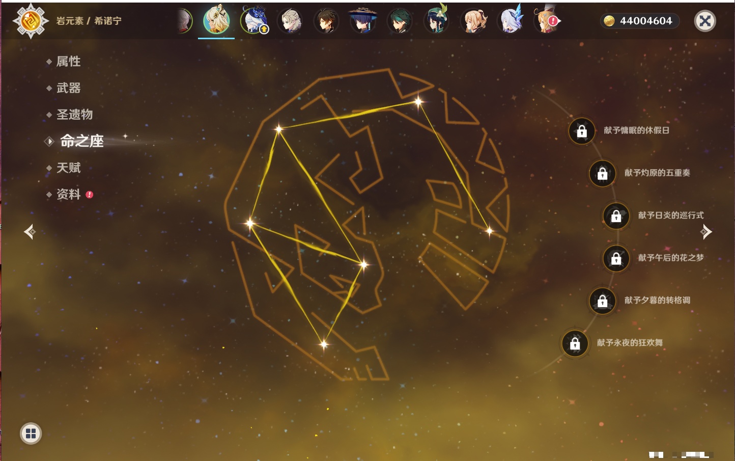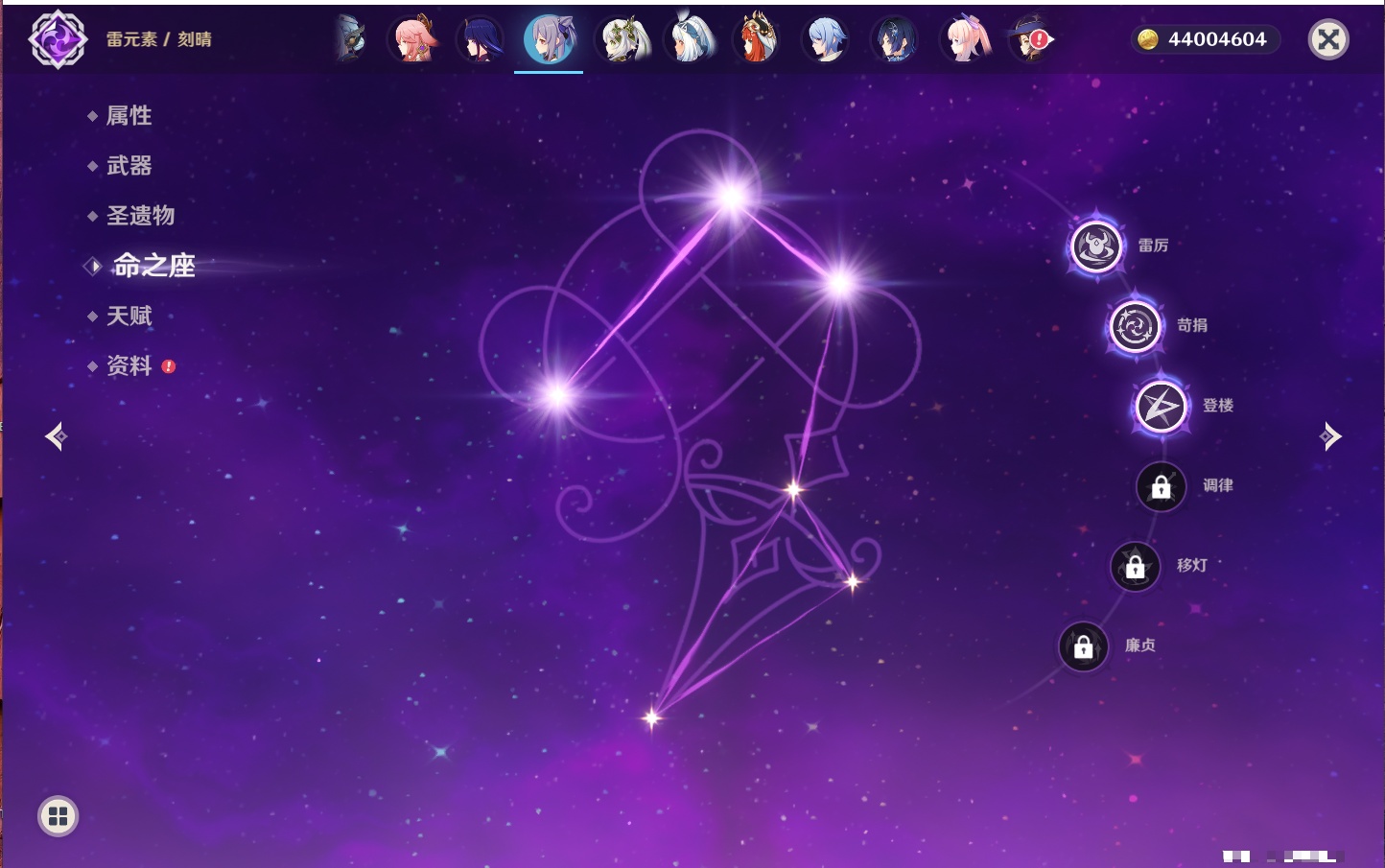 【35个五星角色】,4命七七,4命琴,4命迪卢克,3命刻晴,2命芙宁娜,2命迪希雅,2命雷电将军,1命那维莱特,1命纳西妲,1命夜兰,1命优菈,1命枫原万叶,1命胡桃,1命魈,1命莫娜,1命菲林斯,0命流浪者,0命妮露,0命提纳里,0命神里绫人,0命八重神子,0命申鹤,0命神里绫华,0命钟离,0命甘雨,0命温迪,0命可莉,0命阿贝多,0命珊瑚宫心海,0命希诺宁,0命丝柯克,0命爱可菲,0命伊涅芙,0命玛拉妮,0命奈芙尔,