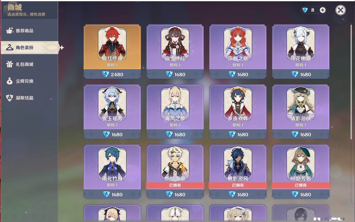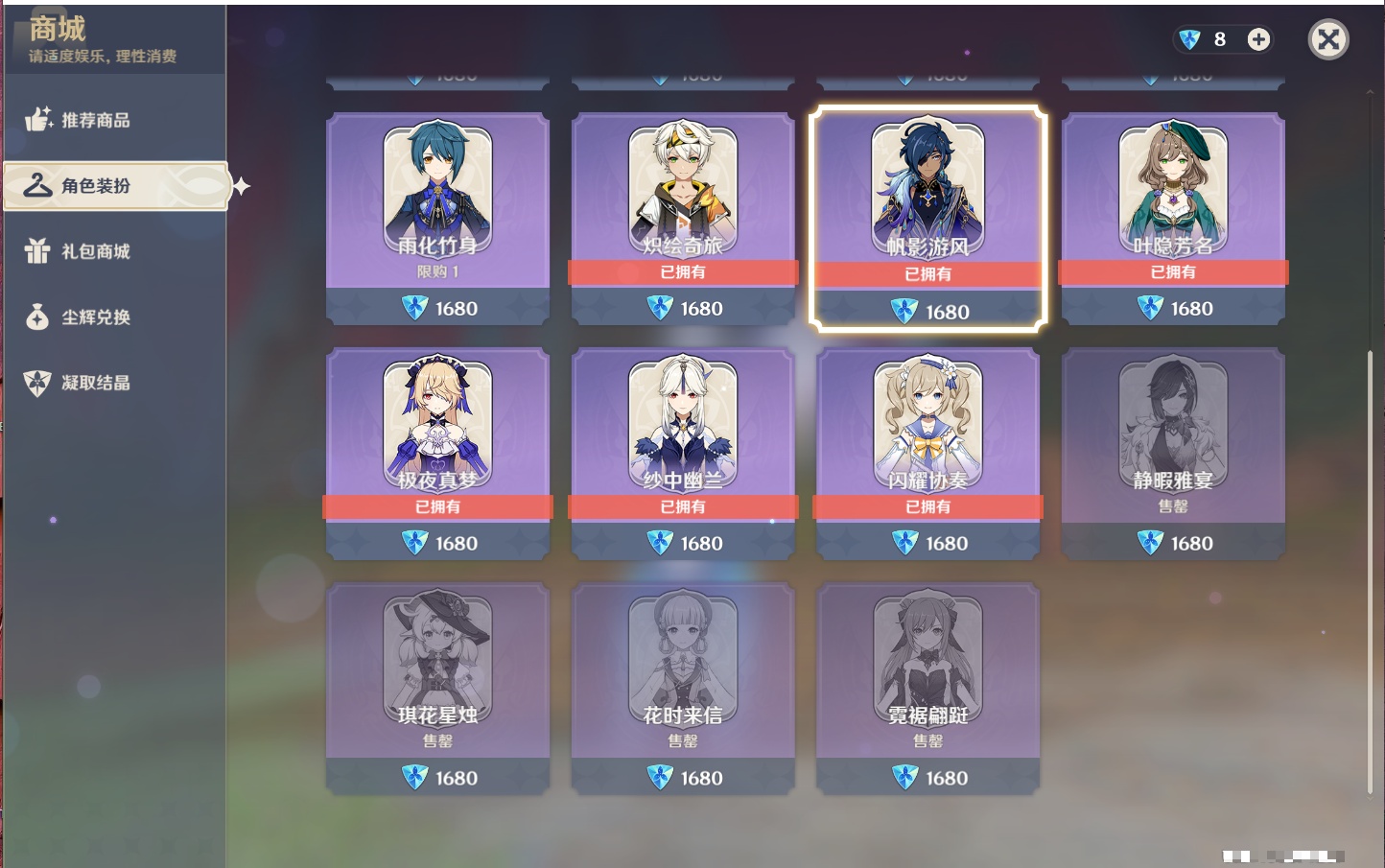 【时装】,炽绘奇旅,帆影游风,叶隐芳名,纱中幽兰,闪耀协奏,极夜真梦,静暇雅宴,琪花星烛,花时来信,霓裾蹁跹,【按区服: Mihoyo服】