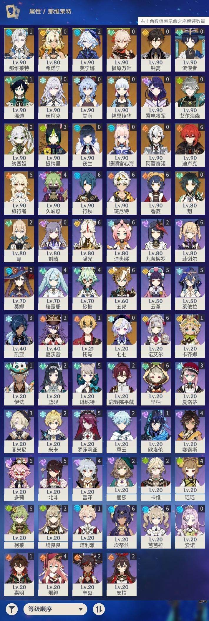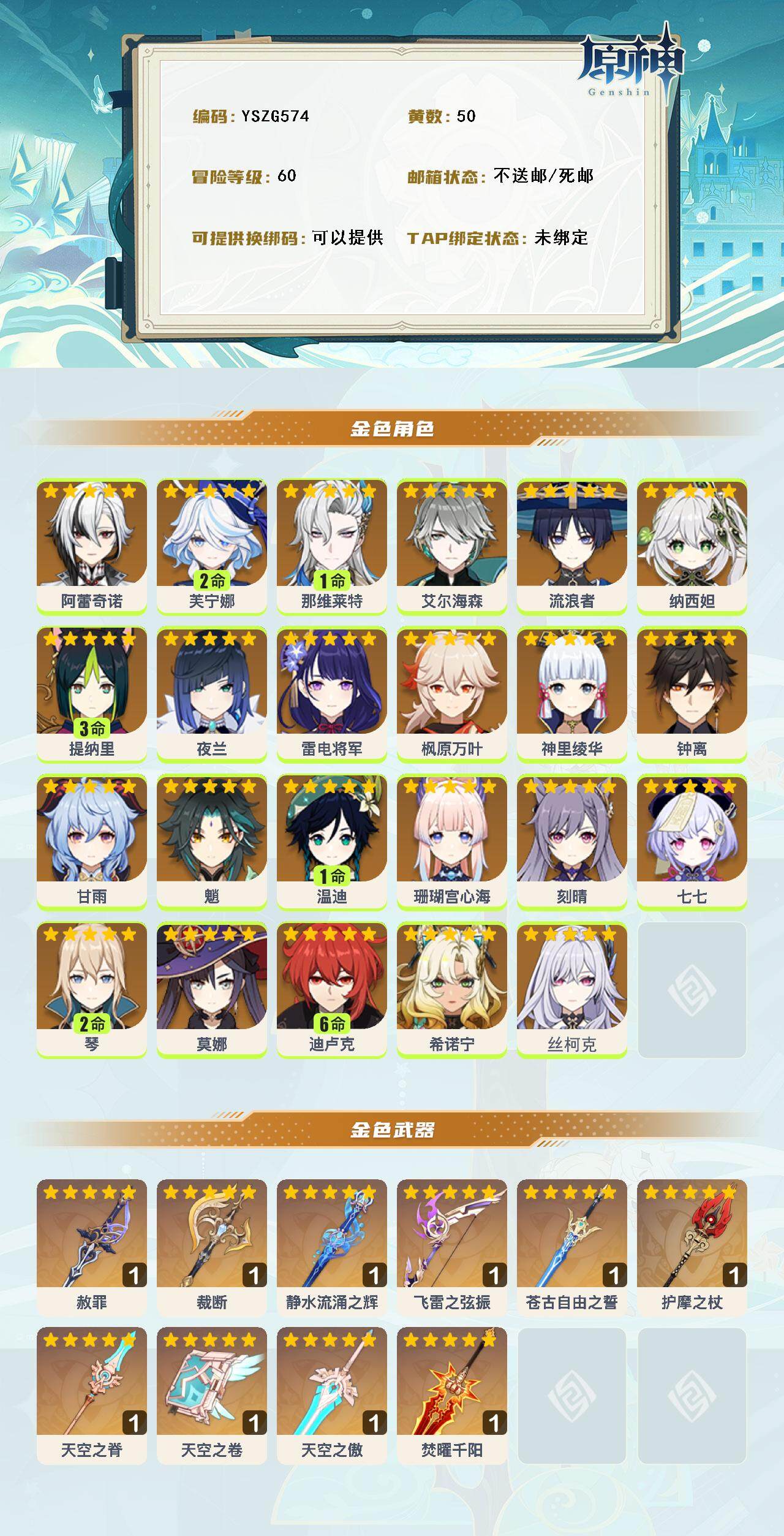 【YSZG574】60级/50黄/女主/23个五星角色/12个五星武器/1命那维莱特/0命希诺宁/2命芙宁娜/枫原万叶/钟离/流浪者/1命温迪/0命丝柯克/甘雨/神里绫华/雷电将军/艾尔海森/纳西妲/3命提纳里/夜兰/珊瑚宫心海/0命阿蕾奇诺/满命迪卢克/魈/2命琴/刻晴/莫娜/七七/飞雷之弦振/天空之卷/天空之脊/护摩之杖/精1焚曜千阳/精1裁断/精1赦罪/精1静水流涌之辉/苍古自由之誓/天空之傲【按邮箱: 邮箱不出售】