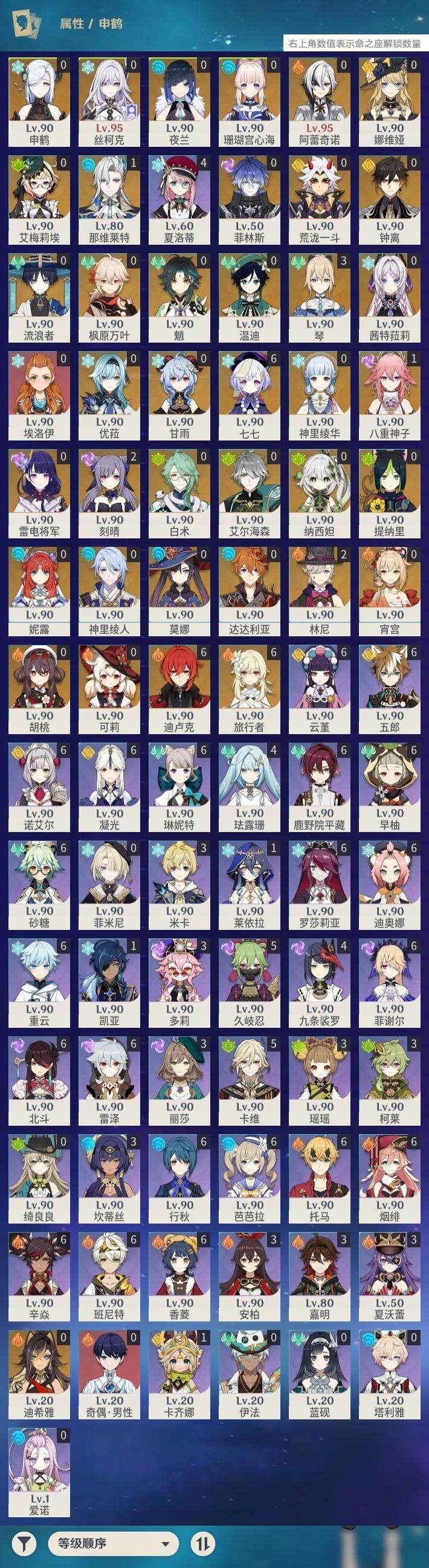 0命阿蕾奇诺,0命娜维娅,1命那维莱特,2命林尼,0命白术,0命迪希雅,0命艾尔海森,0命流浪者,0命纳西妲,0命妮露,0命提纳里,0命夜兰,0命神里绫人,1命八重神子,0命申鹤,0命荒泷一斗,0命优菈,0命雷电将军,0命枫原万叶,0命神里绫华,0命钟离,0命胡桃,0命甘雨,0命魈,0命宵宫,0命温迪,0命可莉,0命达达利亚,0命珊瑚宫心海,2命刻晴,满命七七,3命琴,0命莫娜,满命迪卢克,0命艾梅莉埃,0命茜特菈莉,0命丝柯克,0命菲林斯,精1最初的大魔术,精1护摩之杖,精1天空之脊,精1天空之翼,精1阿莫斯之弓,精1风鹰剑,精1狼的末路,精1天空之傲【按邮箱: 邮箱不出售】