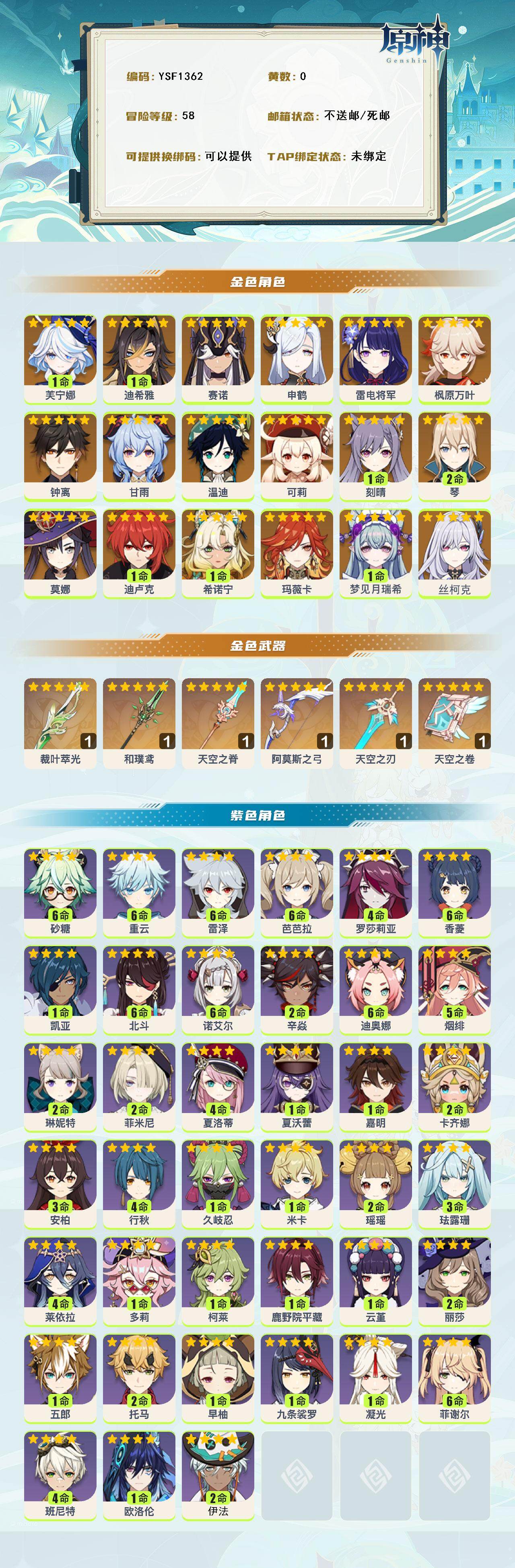 【YSF1362】58级/女主/21个五星角色/0命丝柯克/1命梦见月瑞希/0命玛薇卡/1命希诺宁/1命芙宁娜/1命迪希雅/赛诺/申鹤/雷电将军/枫原万叶/甘雨/钟离/可莉/温迪/2命琴/1命刻晴/1命迪卢克/莫娜/裁叶萃光/和璞鸢/天空之卷/阿莫斯之弓/天空之脊/天空之刃/2命伊法/0命欧洛伦/2命卡齐娜/1命嘉明/1命夏沃蕾/4命夏洛蒂/2命菲米尼/2命琳妮特/1命米卡/2命瑶瑶/3命珐露珊/4命莱依拉/1命多莉/0命柯莱/0命鹿野院平藏/1命久岐忍/0命云堇/1命五郎/2命托马/1命九条裟罗/1命早柚/5命烟绯/4命罗莎莉亚/2命辛焱/满命迪奥娜/满命砂糖/满命雷泽/满命菲谢尔/2命丽莎/满命北斗/满命香菱/3命安柏/4命班尼特/4命行秋/满命芭芭拉/1命凝光/满命诺艾尔/1命凯亚/满命重云【按邮箱: 邮箱不出售】