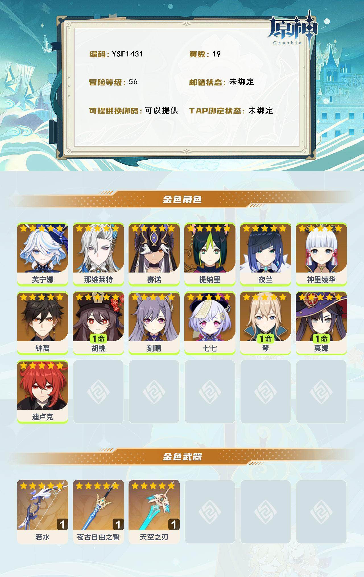 【YSF1431】56级/19黄/女主/13个五星角色/3个五星武器/钟离/0命芙宁娜/0命那维莱特/1命胡桃/神里绫华/提纳里/刻晴/夜兰/1命琴/七七/赛诺/1命莫娜/迪卢克/若水/天空之刃/苍古自由之誓【按邮箱: 邮箱未绑定】