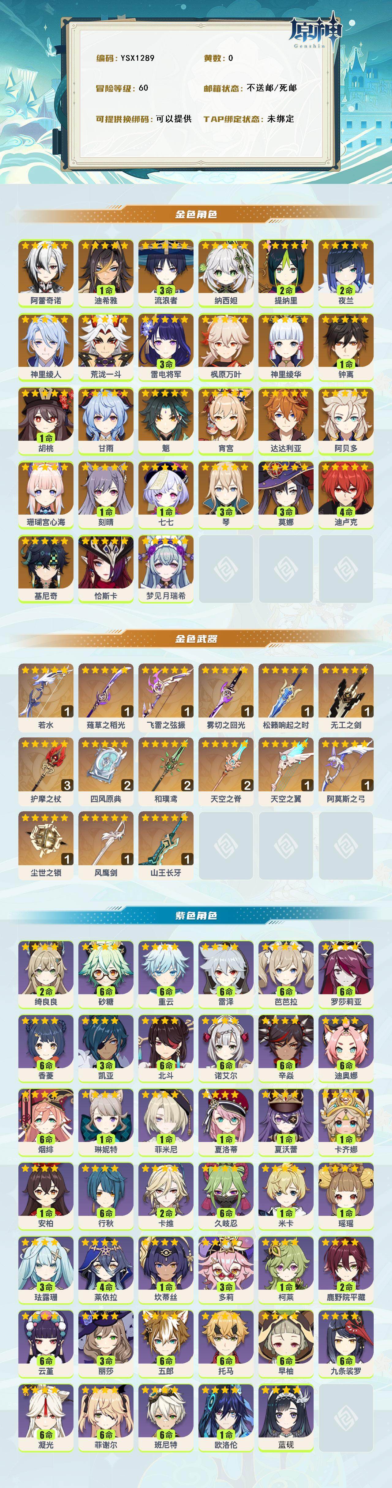 【YSX1289】60级/女主/30个五星角色/0命梦见月瑞希/0命恰斯卡/0命基尼奇/0命阿蕾奇诺/1命迪希雅/3命流浪者/纳西妲/2命提纳里/2命夜兰/神里绫人/荒泷一斗/珊瑚宫心海/3命雷电将军/宵宫/神里绫华/枫原万叶/1命胡桃/魈/甘雨/阿贝多/1命钟离/达达利亚/3命琴/1命刻晴/4命迪卢克/3命莫娜/1命七七/精1山王长牙/若水/薙草之稻光/雾切之回光/飞雷之弦振/松籁响起之时/精3护摩之杖/尘世之锁/无工之剑/精2和璞鸢/精2四风原典/阿莫斯之弓/风鹰剑/精2天空之脊/天空之翼/0命蓝砚/0命欧洛伦/0命卡齐娜/1命夏沃蕾/0命夏洛蒂/0命菲米尼/0命琳妮特/2命绮良良/2命卡维/1命米卡/0命瑶瑶/3命珐露珊/4命莱依拉/0命坎蒂丝/3命多莉/1命柯莱/2命鹿野院平藏/满命久岐忍/满命云堇/满命五郎/满命托马/满命九条裟罗/满命早柚/满命烟绯/满命罗莎莉亚/满命辛焱/满命迪奥娜/满命砂糖/满命雷泽/满命菲谢尔/3命丽莎/满命北斗/满命香菱/1命安柏/满命班尼特/满命行秋/满命芭芭拉/满命凝光/满命诺艾尔/3命凯亚/满命重云【按邮箱: 邮箱不出售】