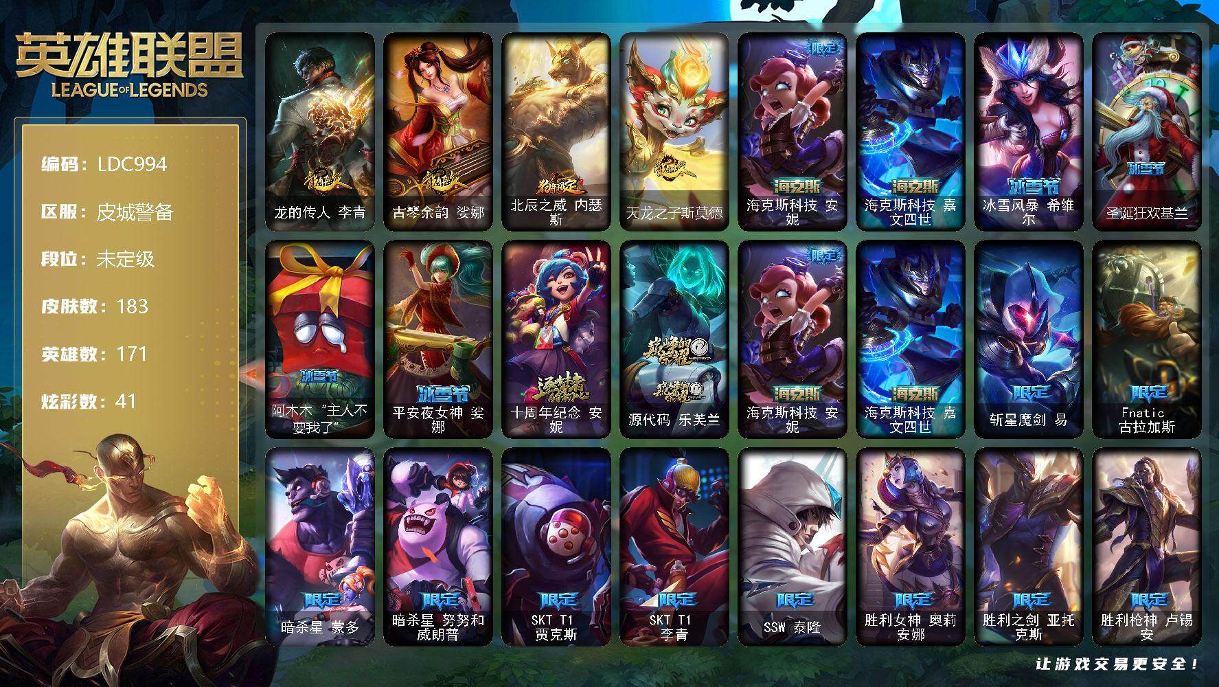 【LDC994】171英雄/183皮肤/4神话/22限定/2臻彩/41炫彩/10传说/50史诗/未定级/无畏骑士瑟庄妮赤子初心/魔女阿卡丽虚荣/龙的传人李青/古琴余韵娑娜/北辰之威内瑟斯/天龙之子斯莫德/海克斯科技安妮/海克斯科技嘉文四世/冰雪风暴希维尔/圣诞狂欢基兰/阿木木“主人不要我了”/平安夜女神娑娜/十周年纪念安妮/源代码乐芙兰/斩星魔剑易/Fnatic古拉加斯/暗杀星蒙多/暗杀星努努和威朗普/SKTT1贾克斯/SKTT1李青/SSW泰隆/胜利女神奥莉安娜/胜利之剑亚托克斯/胜利枪神卢锡安/暗影沃里克/野兽猎人泰达米尔/都铎王朝图奇/防暴天使凯尔/战地机甲厄加特/黑夜使者索拉卡/欧米伽小队幽灵特工/女皇艾希/女主播迦娜/第三类接触黑默丁格/黎明使者锐雯/枯萎之壤泽拉斯/灌篮高手德莱厄斯/黑夜使者亚索/特战先锋赵信/铁血剑豪易/圣洁化身索拉卡/熊猫提莫/黑帮狂花厄运小姐/少林武僧贾克斯/死神卡尔萨斯/殇之机器人阿木木/熔火之心拉莫斯/掠星魔刃卡萨丁/夜刃艾瑞莉娅/海克斯科技迦娜/恐惧新星普朗克/古墓丽影凯特琳/前线指挥官卡特琳娜/源计划雄心卡特琳娜/灵魂烈焰布兰德/至高之拳李青/地下拳王李青/苍穹之光薇恩/铁血猎手奈德丽/军神战甲波比/飞车暴走族古拉加斯/大夏武士潘森/至高君王玛尔扎哈/血色精锐锐雯/深海怪鱼克格莫/侏罗纪化石克格莫/战国大名慎/星际迷航拉克丝/银河魔装机神希瓦娜/暗影妖狐阿狸/黑帮教父格雷福斯/铁血猎人雷恩加尔/暗黑武士雷恩加尔/奥术大师吉格斯/驯龙女巫璐璐/死亡绽放卡兹克/生化骑士德莱厄斯/天启骑士杰斯/血羽凤凰奎因/西部牛仔亚索/源计划风亚索/腥红之月亚索/职业杀手卢锡安/爵士克烈/源计划自由艾克/霓虹杀拳蔚/上古战魂雷克塞/糖果之王艾翁/霹雳游侠弗拉基米尔/死亡骑士内瑟斯/战地之王加里奥/法老阿木木/魔导绅士维迦/风执事加里奥/黑暗骑士赵信/深渊巨蟹厄加特/潮流女王乐芙兰/弗拉基米尔伯爵/学生会长弗拉基米尔/幽魂费德提克/金牛座阿利斯塔/斗牛士阿利斯塔/美国大叔瑞兹/原野伐木工赛恩/森林女神索拉卡/绝息圣堂厄运小姐/梦魇泰达米尔/嘻哈精神基兰/机械污染辛吉德/黑暗女王伊芙琳/KDAALLOUT伊芙琳/黑金诱惑图奇/五杀摇滚III遗失的章节卡尔萨斯/尼斯巨兽科加斯/情绪摇滚阿木木/忍龟拉莫斯/联盟之喙艾尼维亚/千纸凤凰艾尼维亚/万能小丑萨科/战栗之毒蒙多/健美教练蒙多/嗜血行刑蒙多/缪斯女神娑娜/幽灵船长普朗克/老兵普朗克/绿水晶光辉塔里克/白魔法师维迦/垃圾场特朗德尔/传统造型特朗德尔/屠龙勇士特朗德尔/海贼参谋斯维因/铁锈斑斑布里茨/战场BOSS布里茨/珊瑚礁墨菲特/奥德赛墨菲特/星河战队雷克顿/血石战神雷克顿/哥特女仆奥莉安娜/恶灵布偶奥莉安娜/黑夜使者李青/独眼海盗兰博/单身贵族内瑟斯/丛林猎豹奈德丽/法国女仆奈德丽/龙神之力乌迪尔/品酒大师古拉加斯/丧尸杀手潘森/足球先生伊泽瑞尔/光执事伊泽瑞尔/龙骑士莫德凯撒/地狱送葬约里克/抵抗军灵魔约里克/蜂刺阿卡丽/源计划暗影阿卡丽/黄金骑士盖伦/海上霸主盖伦/魔灵玛尔扎哈/玉剑传说武剑仙/怒之火炮格雷福斯/苔原猎手菲兹/怒熊沃利贝尔/坚韧不屈沃利贝尔/雷喵喵尔/地底迷城诺提勒斯/造物主维克托/野兽女王瑟庄妮/糖果女巫璐璐/灵魂收割者德莱文/血石骑士赫卡里姆/魔女丽桑卓/摄魂猎手凯隐/鬼影森森婕拉/KDA卡莎/永恒之森纳尔/奥德赛亚索/战场BOSS亚索/女帝奇亚娜/腥红之月亚托克斯/鲛妮座人娜美/源代码娜美/深渊恐惧锤石/抵抗军炎魔俄洛伊/巴德吟游诗人/绝息圣堂洛/魔女尼菈