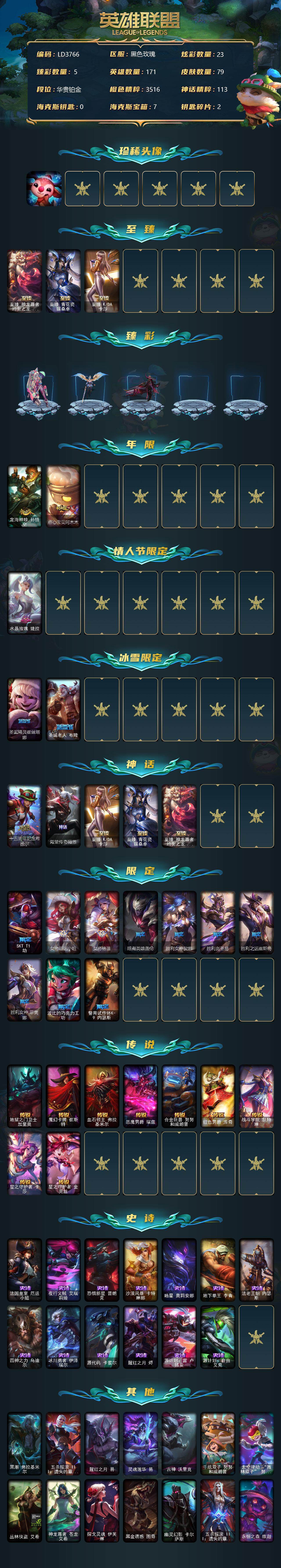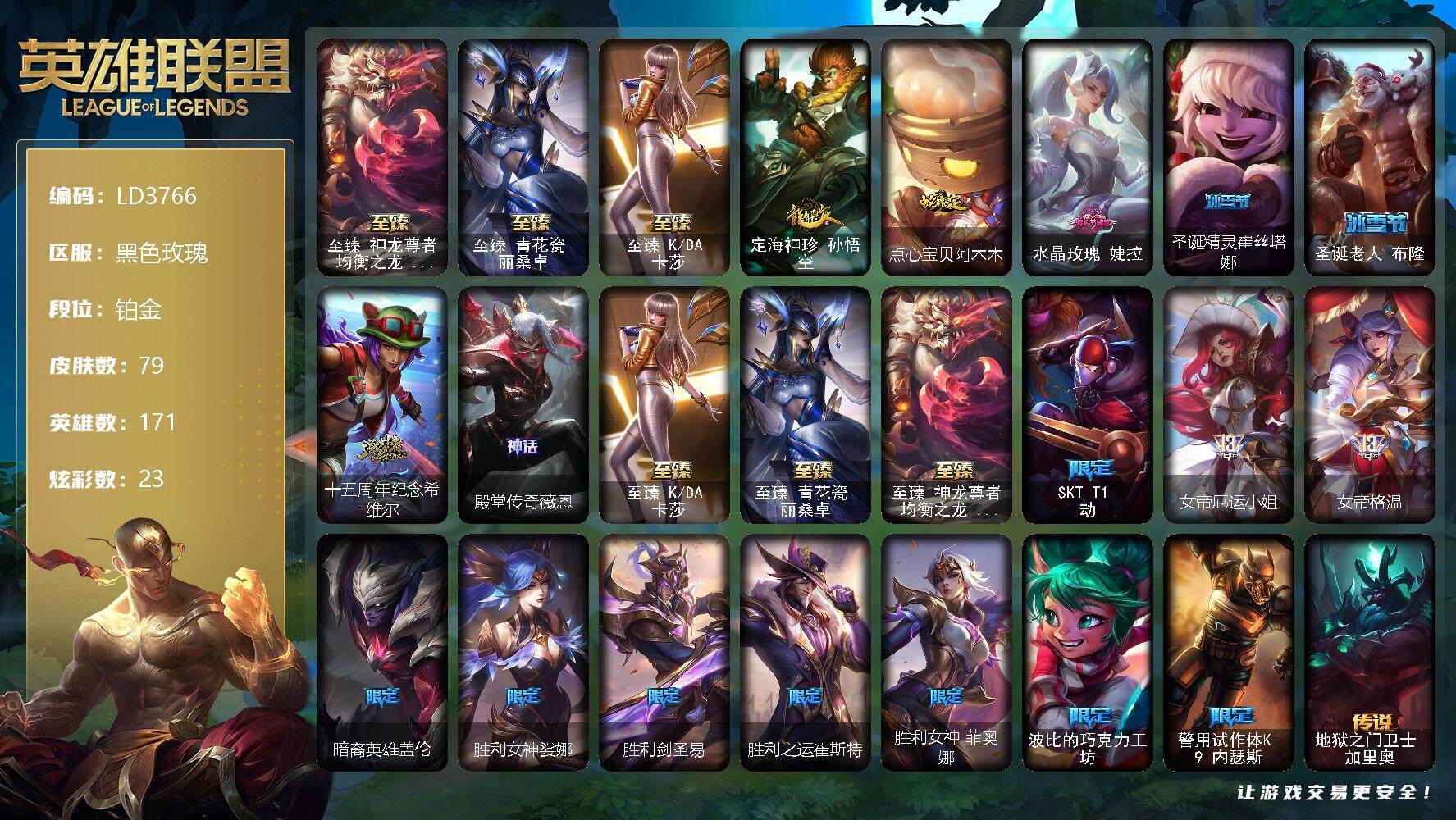 【LD3766】171英雄/79皮肤/5神话/15限定/5臻彩/23炫彩/9传说/13史诗/铂金账号等级:261/至爱的鹿头像/至臻神龙尊者均衡之龙沃利贝尔/至臻青花瓷丽桑卓/至臻KDA卡莎/冠军之刃锐雯2016凯旋圣装/幻灵战斗猫金克丝梦幻强袭/玉剑传说翼剑仙珠光/西部天使赛娜贝利尔之怠/定海神珍孙悟空/点心宝贝阿木木/水晶玫瑰婕拉/圣诞精灵崔丝塔娜/圣诞老人布隆/十五周年纪念希维尔/殿堂传奇薇恩/SKTT1劫/女帝厄运小姐/女帝格温/暗裔英雄盖伦/胜利女神娑娜/胜利剑圣易/胜利之运崔斯特/胜利女神菲奥娜/波比的巧克力工坊/警用试作体K9内瑟斯/地狱之门卫士加里奥/魔幻卡牌崔斯特/血石领主弗拉基米尔/恶魔男爵瑞兹/合金巨兽努努和威朗普/红色男爵库奇/战斗学院凯特琳/星之守护者卡莎/星之守护者金克丝/法国皇室厄运小姐/夜行义贼艾瑞莉娅/恐惧新星普朗克/沙漠风暴卡特琳娜/暗星奥莉安娜/地下拳王李青/法老王朝内瑟斯/四神之力乌迪尔/冰川勇者伊泽瑞尔/源代码卡蜜尔/腥红之月烬/源计划雷卢锡安/源计划自由艾克/黑潮弗拉基米尔/五杀摇滚III遗失的章节凯尔/腥红之月易/灵魂莲华易/古神沃里克/千纸双子努努和威朗普/太空律动舞林双子努努和威朗普/丛林侠盗艾希/神龙尊者苍龙艾希/探戈灵魂伊芙琳/黑金诱惑图奇/幽灵幻影卡尔萨斯/五杀摇滚III遗失的章节卡尔萨斯/永恒之森维迦/我怒角维迦/战斗学院卡特琳娜/鳄霸雷克顿/魔女伊莉丝/黑色玫瑰假面舞会伊莉丝/神龙尊者魔龙布兰德/灵魂莲华薇恩/太空律动串烧大师兰博/斯巴达之魂潘森/地下都市梦魇阿卡丽/战斗教授格雷福斯/沙之守护雷恩加尔/刃执事德莱文/幽魂骑士赫卡里姆/奥德赛卡兹克/战斗学院杰斯/黑潮黛安娜/神龙尊者玉境灵龙卡莎/幽梦玫瑰泽丽/黯晶巨兽雷克塞/永恒之森洛/永恒之森霞/黎明使者薇古丝【按大区: 电信】