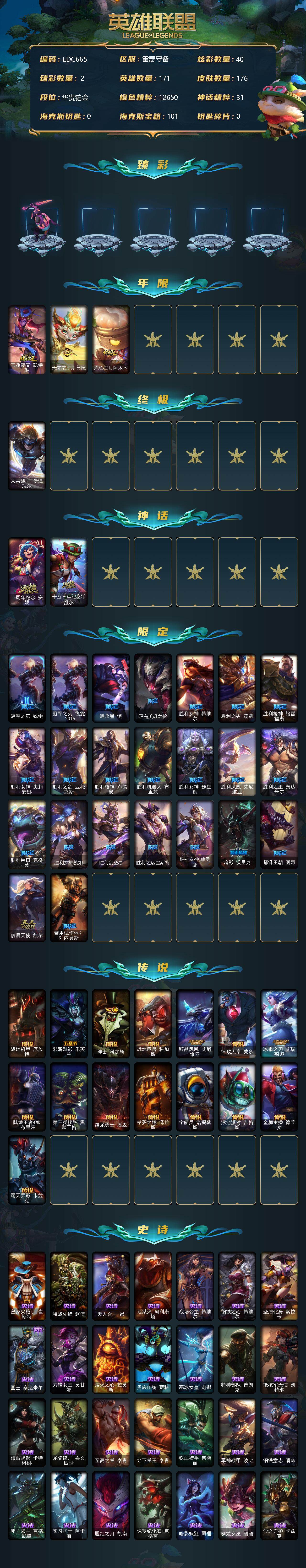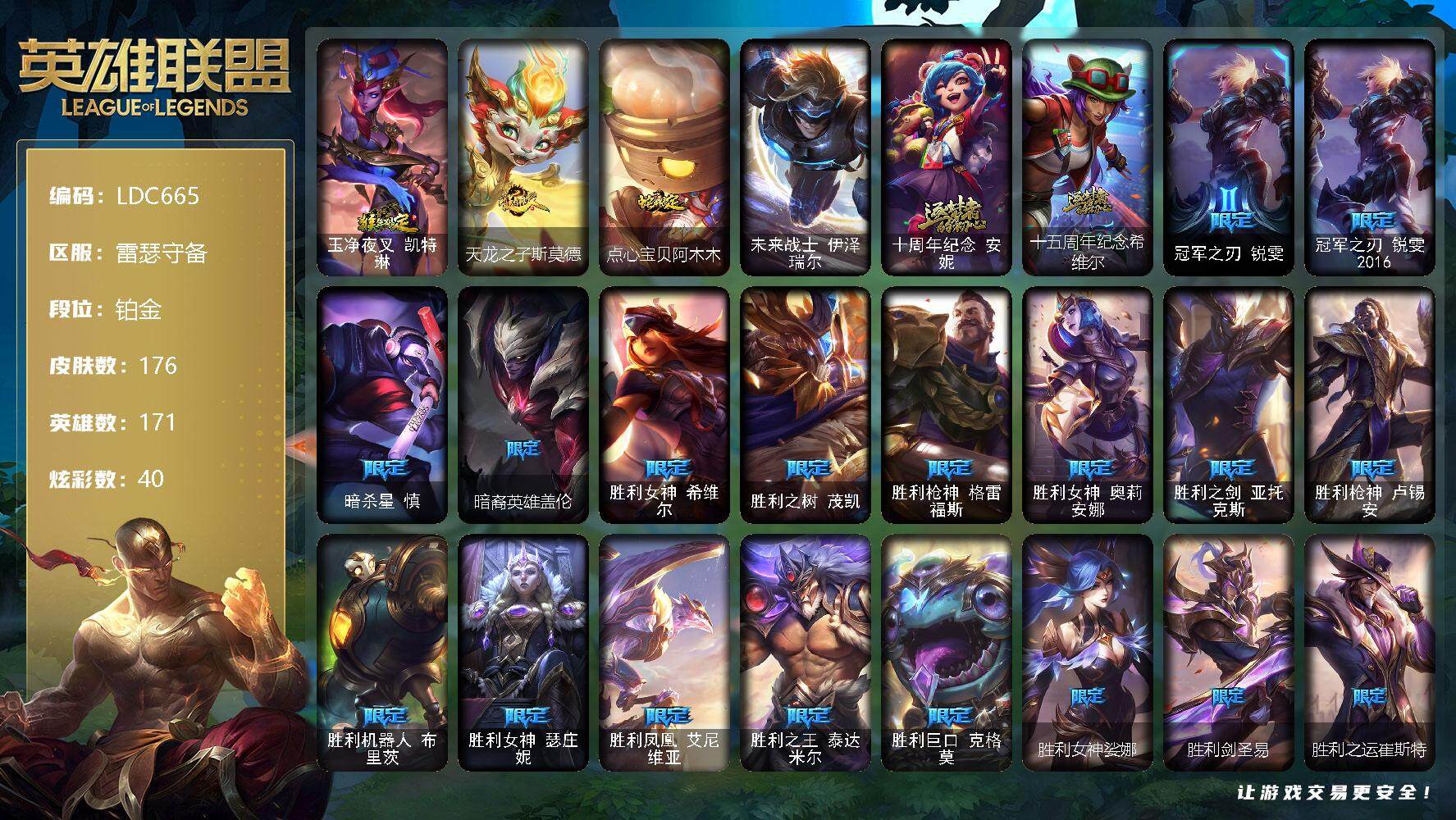 【LDC665】171英雄/176皮肤/1终极/2神话/26限定/2臻彩/40炫彩/15传说/42史诗/铂金/源计划毁灭派克幻灭/魔女阿卡丽虚荣/玉净夜叉凯特琳/天龙之子斯莫德/点心宝贝阿木木/未来战士伊泽瑞尔/十周年纪念安妮/十五周年纪念希维尔/冠军之刃锐雯/冠军之刃锐雯2016/暗杀星慎/暗裔英雄盖伦/胜利女神希维尔/胜利之树茂凯/胜利枪神格雷福斯/胜利女神奥莉安娜/胜利之剑亚托克斯/胜利枪神卢锡安/胜利机器人布里茨/胜利女神瑟庄妮/胜利凤凰艾尼维亚/胜利之王泰达米尔/胜利巨口克格莫/胜利女神娑娜/胜利剑圣易/胜利之运崔斯特/胜利女神菲奥娜/暗影沃里克/都铎王朝图奇/防暴天使凯尔/警用试作体K9内瑟斯/战地机甲厄加特/邪鸦魅影乐芙兰/绅士科加斯/战地巨兽科加斯/黯晶凤凰艾尼维亚/律政大亨蒙多/冰霜之刃艾瑞莉娅/陆地王者4WD布里茨/第三类接触黑默丁格/屠龙勇士潘森/枯萎之壤泽拉斯/宇航员诺提勒斯/泳池派对吉格斯/金牌主播德莱文/霸天异形卡兹克/皇家火枪手崔斯特/特战先锋赵信/天人合一易/地狱火阿利斯塔/战场公主希维尔/钢铁之心希维尔/圣洁化身索拉卡/国王泰达米尔/刀锋女王莫甘娜/熔火之心拉莫斯/贵族血统萨科/寒冰女皇迦娜/特种部队普朗克/抵抗军天使凯特琳/海贼魅影卡特琳娜/龙骑统帅嘉文四世/至高之拳李青/地下拳王李青/铁血猎手奈德丽/军神战甲波比/钢铁意志潘森/死亡领主莫德凯撒/实习护士阿卡丽/腥红之月凯南/侏罗纪化石克格莫/暗影妖狐阿狸/驯龙女巫璐璐/沙之守护卡兹克/死亡绽放卡兹克/全金属狂潮杰斯/刀锋女王丽桑卓/血羽凤凰奎因/邪恶魔人扎克/西部牛仔亚索/战地机甲维克兹/黑帮狂花金克丝/源计划雷卢锡安/冲击之刃劫/霓虹杀拳蔚/霸天剑魔亚托克斯/河水之灵娜美/腥红之月锤石/星空之门内瑟斯/西部牛仔崔斯特/战地之王加里奥/拆弹专家黑默丁格/冰河时代奥拉夫/亮丽女神希维尔/魔导绅士维迦/嗜血狂暴沃里克/风执事加里奥/皇家守卫赵信/电锯狂人厄加特/潮流女王乐芙兰/弗拉基米尔侯爵/黑潮弗拉基米尔/暗影易/原野伐木工赛恩/游击队员崔丝塔娜/约德尔海贼团崔丝塔娜/源计划末日沃里克/脏兮兮努努和威朗普/西部牛仔厄运小姐/勇敢的心泰达米尔/宗师级钓鱼训练师贾克斯/复仇武神贾克斯/武神贾克斯/冲浪高手辛吉德/科学狂人辛吉德/黑暗女王伊芙琳/探戈灵魂伊芙琳/北风冻原图奇/自由女神卡尔萨斯/山海绘卷科加斯/情绪摇滚阿木木/联盟之喙艾尼维亚/恐怖之源萨科/光明哨兵艾瑞莉娅/老兵普朗克/电玩上校库奇/紫水晶意志塔里克/白魔法师维迦/灰胡子魔法师维迦/垃圾场特朗德尔/创世之神特朗德尔/珊瑚礁墨菲特/烈焰古树茂凯/星河战队雷克顿/血石战神雷克顿/猛龙雷克顿/黑色玫瑰假面舞会伊莉丝/传统僧侣李青/摩登骇客薇恩/猎天使魔女薇恩/单身贵族内瑟斯/丛林猎豹奈德丽/法国女仆奈德丽/武力全开乌迪尔/诺克萨斯波比/美酒节特使古拉加斯/狂热球迷古拉加斯/冒险精神伊泽瑞尔/光执事伊泽瑞尔/奈落之炎阿卡丽/银色闪电凯南/战神阿瑞斯盖伦/海上霸主盖伦/荣誉使者玛尔扎哈/刺客信条泰隆/玉剑传说武剑仙/索诺拉沙虫克格莫/荣誉使者慎/高丽风情阿狸/风纪委员阿狸/无情重炮格雷福斯/坚韧不屈沃利贝尔/夜魔水晶韦鲁斯/全金属狂潮维克托/死亡骑士瑟庄妮/德莱德莱德莱文/西部魔影赫卡里姆/西部魔影德莱厄斯/方块王后辛德拉/银河魔装机神纳尔/莫测之影卡蜜尔/荣誉使者阿克尚/任性学霸艾克/玉剑传说寒潭夭夭/永恒之森阿兹尔/灵能特工莎弥拉/水瓶星神俄洛伊/腥红之月卡莉丝塔【按大区: 电信】