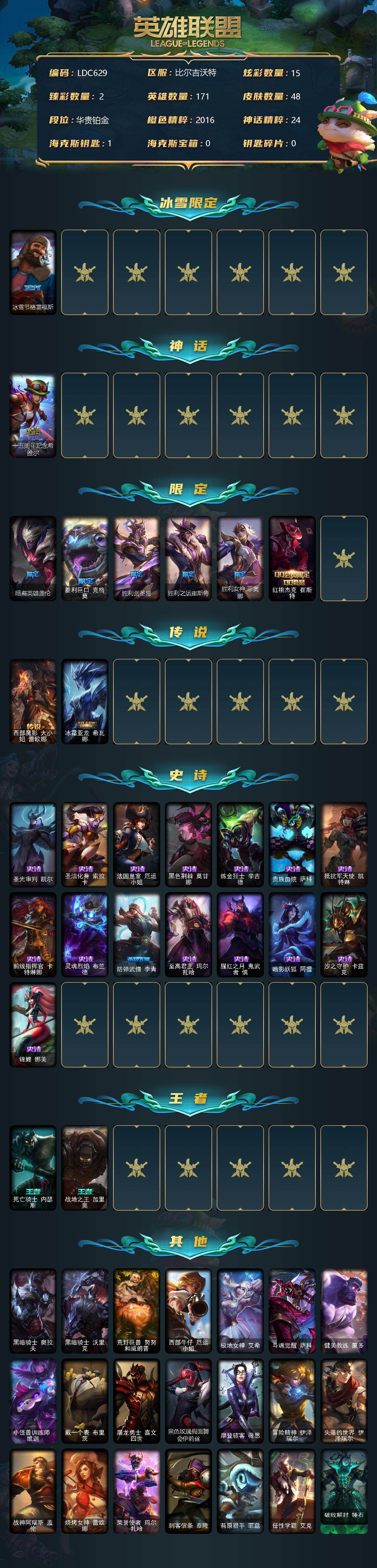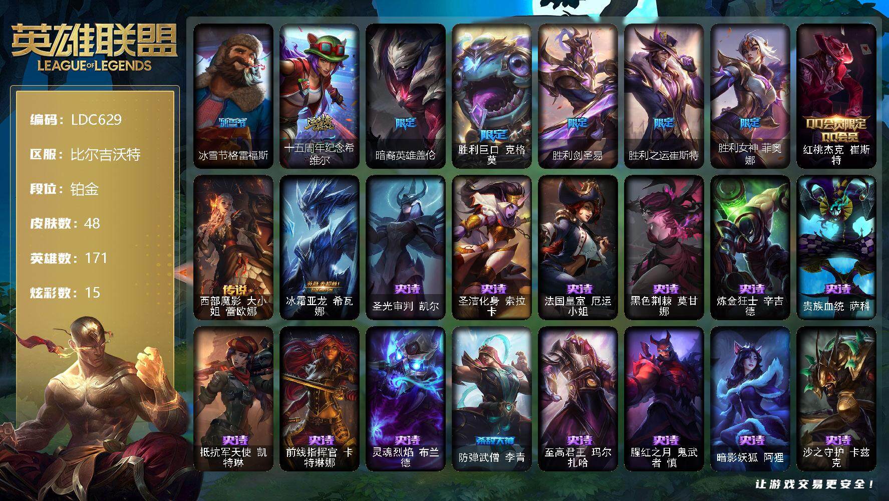 【LDC629】171英雄/48皮肤/1神话/7限定/2臻彩/15炫彩/2传说/15史诗/铂金账号等级:248/冠军之刃锐雯2016凯旋圣装/战斗学院盖伦不死鸟/冰雪节格雷福斯/十五周年纪念希维尔/暗裔英雄盖伦/胜利巨口克格莫/胜利剑圣易/胜利之运崔斯特/胜利女神菲奥娜/红桃杰克崔斯特/西部魔影大小姐蕾欧娜/冰霜亚龙希瓦娜/圣光审判凯尔/圣洁化身索拉卡/法国皇室厄运小姐/黑色荆棘莫甘娜/炼金狂士辛吉德/贵族血统萨科/抵抗军天使凯特琳/前线指挥官卡特琳娜/灵魂烈焰布兰德/防弹武僧李青/至高君王玛尔扎哈/腥红之月鬼武者慎/暗影妖狐阿狸/沙之守护卡兹克/锦鲤娜美/死亡骑士内瑟斯/战地之王加里奥/黑暗骑士奥拉夫/黑暗骑士沃里克/荒野巨兽努努和威朗普/西部牛仔厄运小姐/极地女神艾希/斗魂觉醒萨科/健美教练蒙多/小怪兽训练师维迦/戴一个表布里茨/屠龙勇士嘉文四世/黑色玫瑰假面舞会伊莉丝/摩登骇客薇恩/冒险精神伊泽瑞尔/失落的世界伊泽瑞尔/战神阿瑞斯盖伦/烧烤女神蕾欧娜/荣誉使者玛尔扎哈/刺客信条泰隆/苔原猎手菲兹/任性学霸艾克/破败解封锤石【按大区: 网通】