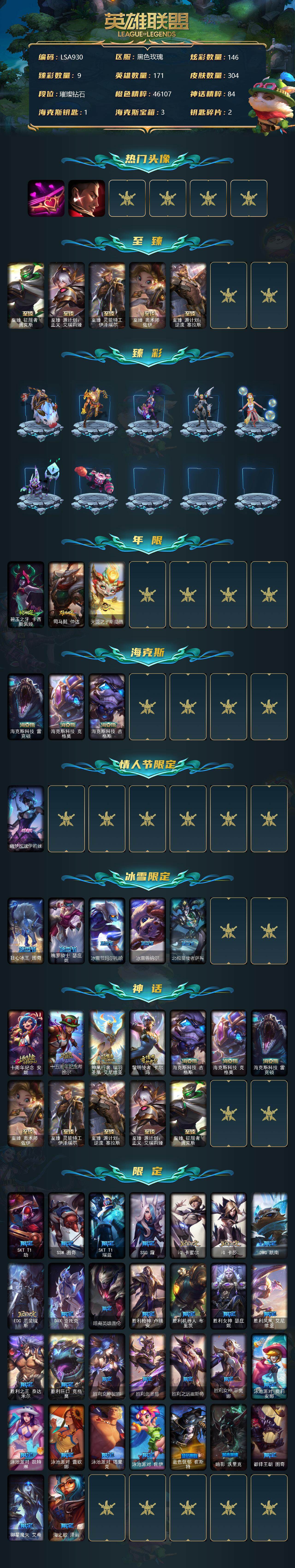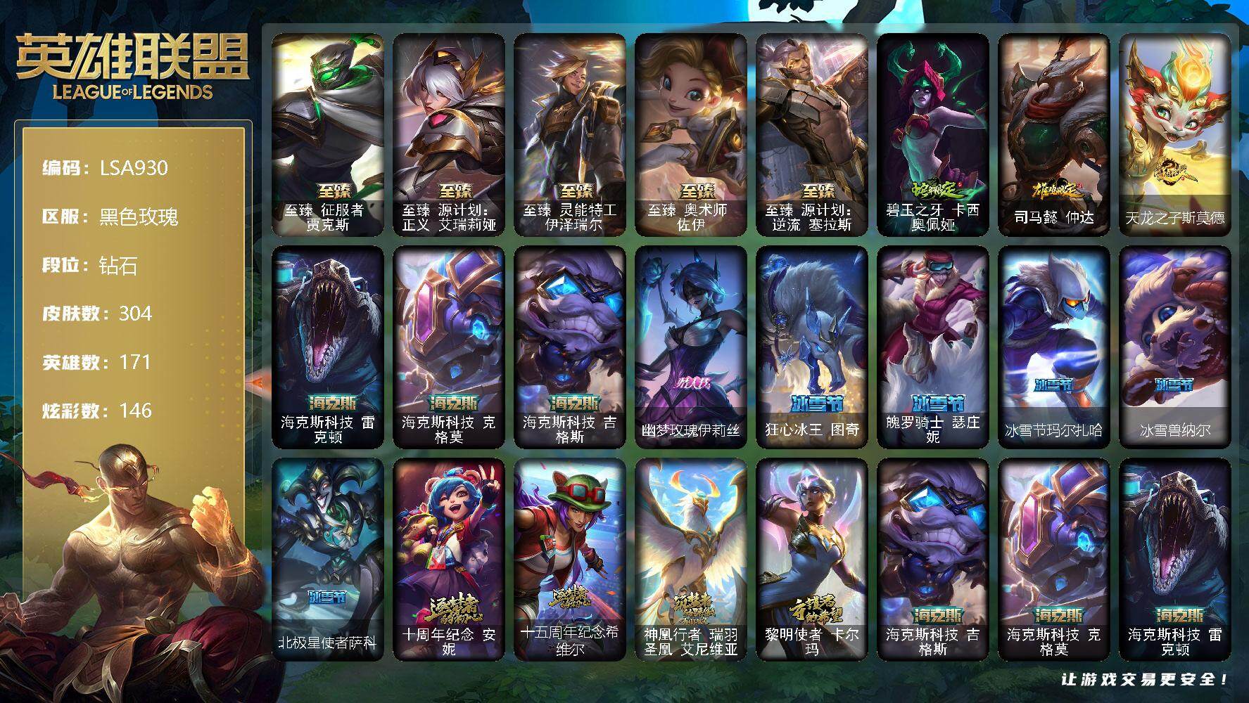 【LSA930】171英雄/304皮肤/12神话/39限定/9臻彩/146炫彩/34传说/59史诗/钻石账号等级:805/爱情之歌头像/觅心游侠卢锡安头像/至臻征服者贾克斯/至臻源计划正义艾瑞莉娅/至臻灵能特工伊泽瑞尔/至臻奥术师佐伊/至臻源计划逆流塞拉斯/无畏骑士瑟庄妮赤子初心/神龙尊者圣龙李青龙腾云起/斗魂觉醒拉克丝无限斗志/星之守护者娑娜未来之光/星之守护者金克丝黑洞/弹幕天使卡莎炽天使公正/泳池派对辛德拉荔枝枝连击/最终BOSS维迦里大魔王/可爱可爱粉红红布里茨/碧玉之牙卡西奥佩娅/司马懿仲达/天龙之子斯莫德/海克斯科技雷克顿/海克斯科技克格莫/海克斯科技吉格斯/幽梦玫瑰伊莉丝/狂心冰王图奇/魄罗骑士瑟庄妮/冰雪节玛尔扎哈/冰雪兽纳尔/北极星使者萨科/十周年纪念安妮/十五周年纪念希维尔/神凰行者瑞羽圣凰艾尼维亚/黎明使者卡尔玛/SKTT1劫/SSW图奇/SKTT1瑞兹/SSG霞/iG卡蜜尔/iG卡莎/DWG凯南/EDG厄斐琉斯/DRX亚托克斯/暗裔英雄盖伦/胜利枪神卢锡安/胜利机器人布里茨/胜利女神瑟庄妮/胜利凤凰艾尼维亚/胜利之王泰达米尔/胜利巨口克格莫/胜利女神娑娜/胜利剑圣易/胜利之运崔斯特/胜利女神菲奥娜/泳池派对奥莉安娜/泳池派对凯特琳/泳池派对蕾欧娜/泳池派对塔里克/泳池派对佐伊/蓝色忧郁崔斯特/暗影沃里克/都铎王朝图奇/御星魔矢艾希/海之歌泽丽/地狱之门卫士加里奥/战地机甲厄加特/血石领主弗拉基米尔/提莫约德尔人的一大步/约德尔国队长提莫/烈焰雄心崔丝塔娜/合金巨兽努努和威朗普/女皇艾希/恶魔之刃泰达米尔/绅士科加斯/战地巨兽科加斯/双重冰晶艾尼维亚/冰霜之刃艾瑞莉娅/最终BOSS维迦/未来战士凯特琳/苹果机器人布里茨/丧尸布兰德/神龙尊者圣龙李青/源计划净化薇恩/战斗学院伊泽瑞尔/青花瓷伊泽瑞尔/黎明使者锐雯/星之守护者拉克丝/黯黑魔龙希瓦娜/灵魂莲华阿狸/苍穹之光韦鲁斯/宇航员诺提勒斯/神王德莱厄斯/奥德赛凯隐/神龙尊者昼日真龙亚索/神龙尊者夜月幻龙亚索/星之守护者金克丝/西部魔影卢锡安/星之守护者霞/冰霜烈焰安妮/铁钩船长费德提克/圣光审判凯尔/钢铁之心希维尔/月光女神阿忒弥斯索拉卡/黑帮狂花厄运小姐/女船长厄运小姐/刀锋女王莫甘娜/卡尔萨斯祸害之光/全金属狂潮拉莫斯/战争血统蒙多/掠星魔刃卡萨丁/恐惧新星普朗克/血石诅咒塔里克/抵抗军天使凯特琳/古墓丽影凯特琳/霸天巨兽墨菲特/无畏号墨菲特/海贼魅影卡特琳娜/枯萎之壤雷克顿/灵骨工匠奥莉安娜/三昧真火孙悟空/生化博士黑默丁格/艳后奈德丽/四神之力乌迪尔/血色之锤波比/大夏武士潘森/冰川勇者伊泽瑞尔/死亡领主莫德凯撒/刺客信条凯南/至高君王玛尔扎哈/帝王斑蝶克格莫/侏罗纪化石克格莫/战国大名慎/沙之守护泽拉斯/银河魔装机神希瓦娜/黑帮教父格雷福斯/海牛猎手菲兹/铁血猎人雷恩加尔/暗星韦鲁斯/生化骑士德莱厄斯/全金属狂潮杰斯/源代码丽桑卓/暗黑女武神黛安娜/血羽凤凰奎因/仲裁圣女辛德拉/驯龙女巫婕拉/最后一只恐龙纳尔/弗雷尔卓德塔莉垭/源代码卡蜜尔/猛虎布隆/银河魔装机神千珏/黑帮狂花金克丝/五星大厨塔姆/职业杀手卢锡安/爵士克烈/霸天剑魔亚托克斯/虚空使者俄洛伊/暮星之羽霞/五杀摇滚鼓手奥拉夫/星空之门内瑟斯/霹雳游侠弗拉基米尔/西部牛仔崔斯特/战地之王加里奥/创意工坊黑默丁格/亮丽女神希维尔/幽蓝梦魇加里奥/风执事加里奥/地狱火加里奥/探戈灵魂崔斯特/皇家守卫赵信/赵云子龙/学生会长弗拉基米尔/波江星神弗拉基米尔/禁卫机甲费德提克/末世天使凯尔/食日天使凯尔/斗牛士阿利斯塔/后场堡垒阿利斯塔/黑暗骑士阿利斯塔/哞利斯塔/部落精神瑞兹/武仙座海格力斯赛恩/原野伐木工赛恩/咖啡甜心希维尔/小恶魔崔丝塔娜/冻原猎手沃里克/脏兮兮努努和威朗普/攻城巨兽努努和威朗普/西部牛仔厄运小姐/特工狂花厄运小姐/荒野女警厄运小姐/勇敢的心泰达米尔/梦魇泰达米尔/复仇武神贾克斯/武神贾克斯/杀戮天使昔拉莫甘娜/腥红之月基兰/机械污染辛吉德/探戈灵魂伊芙琳/首领图奇/黑金诱惑图奇/西部魔影送葬人图奇/自由女神卡尔萨斯/狂欢阿木木/王子不是我阿木木/小丑工作坊萨科/硬汉蒙多/缪斯女神娑娜/凌云之翼艾瑞莉娅/莲花之令艾瑞莉娅/西部天使艾瑞莉娅/光明哨兵艾瑞莉娅/暴风女神迦娜/电玩上校库奇/光明骑士卡尔玛/灰胡子魔法师维迦/垃圾场特朗德尔/传统造型特朗德尔/创世之神特朗德尔/屠龙勇士特朗德尔/海贼参谋斯维因/电玩女神凯特琳/双城之战凯特琳/铁锈斑斑布里茨/戴一个表布里茨/珊瑚礁墨菲特/古神魔腾/图腾古树茂凯/荒野之咬雷克顿/鳄霸雷克顿/黑夜使者嘉文四世/战斗学院孙悟空/灵魂莲华薇恩/上古魔蛇卡西奥佩娅/魔女卡西奥佩娅/银河魔装机神奈德丽/武力全开乌迪尔/乡村农夫古拉加斯/万人敌潘森/冒险精神伊泽瑞尔/睡衣守护者伊泽瑞尔/龙骑士莫德凯撒/五杀摇滚III遗失的章节莫德凯撒/奈落之炎阿卡丽/足球宝贝阿卡丽/KDA阿卡丽/源计划暗影阿卡丽/真实伤害阿卡丽/KDAALLOUT阿卡丽/魔女阿卡丽/医学博士凯南/奈落之炎凯南/战神阿瑞斯盖伦/海上霸主盖伦/德玛西亚警官盖伦/战斗学院蕾欧娜/暗影王子玛尔扎哈/荣誉使者玛尔扎哈/未来战士锐雯/玉剑传说武剑仙/幻灵战斗兔锐雯/毛毛虫克格莫/小蜜蜂克格莫/主治医师慎/荣誉使者慎/战地法师泽拉斯/战斗教授格雷福