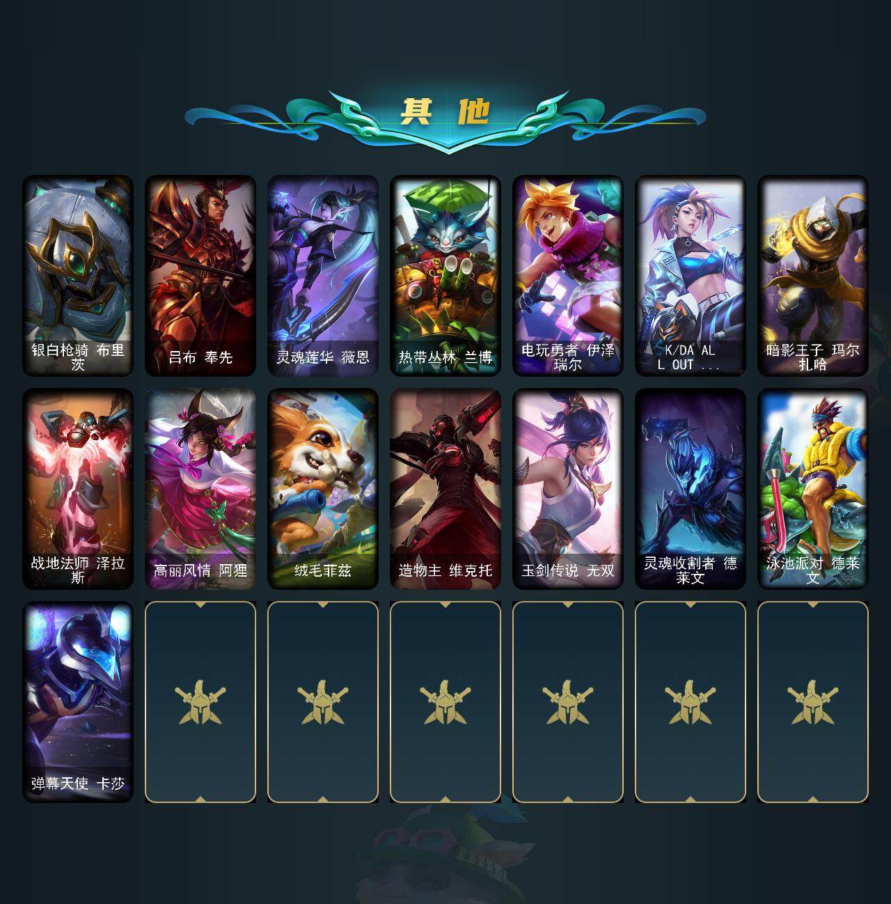【LDC647】117英雄/76皮肤/2终极/2神话/16限定/1臻彩/3炫彩/16传说/17史诗/未定级账号等级:105/冠军之隐劫凯旋圣装/烈焰美人薇恩/圣诞老人德莱文/大元素使拉克丝/未来战士伊泽瑞尔/十周年纪念安妮/源代码乐芙兰/地底世界崔斯特/冠军之刃锐雯/冠军之刃锐雯2016/冠军之隐劫/SKTT1卡莉丝塔/SSG霞/iG卡莎/iG乐芙兰/FPX薇恩/EDG佐伊/EDG厄斐琉斯/死亡誓约维克托/死亡誓约劫/防暴天使凯尔/血石领主弗拉基米尔/战场女武神凯尔/源计划林易/提莫约德尔人的一大步/源计划联合艾希/恶魔之刃泰达米尔/最终BOSS维迦/未来战士凯特琳/丧尸布兰德/神拳李青/源计划净化薇恩/冰霜亚龙希瓦娜/偶像歌手阿狸/霸天异形卡兹克/黑夜使者亚索/星之守护者金克丝/冰霜烈焰安妮/卡尔萨斯祸害之光/蓝焰梦魔魔腾/暗星奥莉安娜/苍穹之光薇恩/星之守护者波比/腥红之月泰隆/沙之守护泽拉斯/银河魔装机神菲兹/暗黑武士雷恩加尔/暗星韦鲁斯/源计划火菲奥娜/奥术大师吉格斯/腥红之月黛安娜/仲裁圣女辛德拉/源计划风亚索/霸天剑魔亚托克斯/西部牛仔崔斯特/牛扒狂战奥拉夫/电锯狂人厄加特/原野伐木工赛恩/腥红之月伊芙琳/北风冻原图奇/幽灵幻影卡尔萨斯/绿野仙踪维迦/银白枪骑布里茨/吕布奉先/灵魂莲华薇恩/热带丛林兰博/电玩勇者伊泽瑞尔/KDAALLOUT阿卡丽/暗影王子玛尔扎哈/战地法师泽拉斯/高丽风情阿狸/绒毛菲兹/造物主维克托/玉剑传说无双/灵魂收割者德莱文/泳池派对德莱文/弹幕天使卡莎【按大区: 电信】