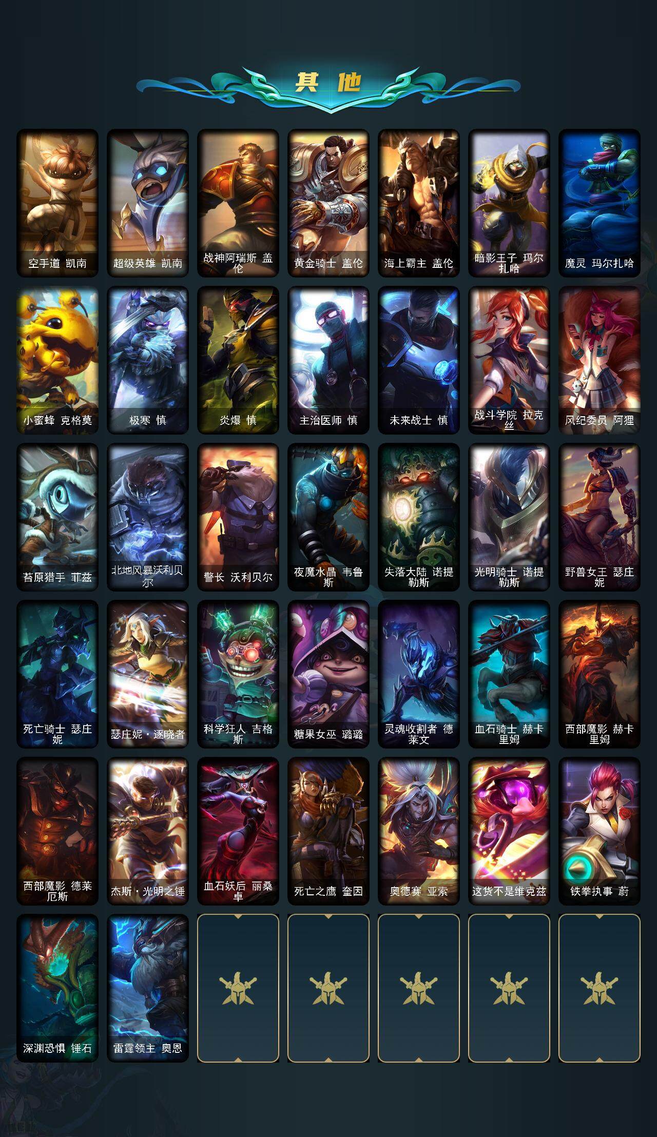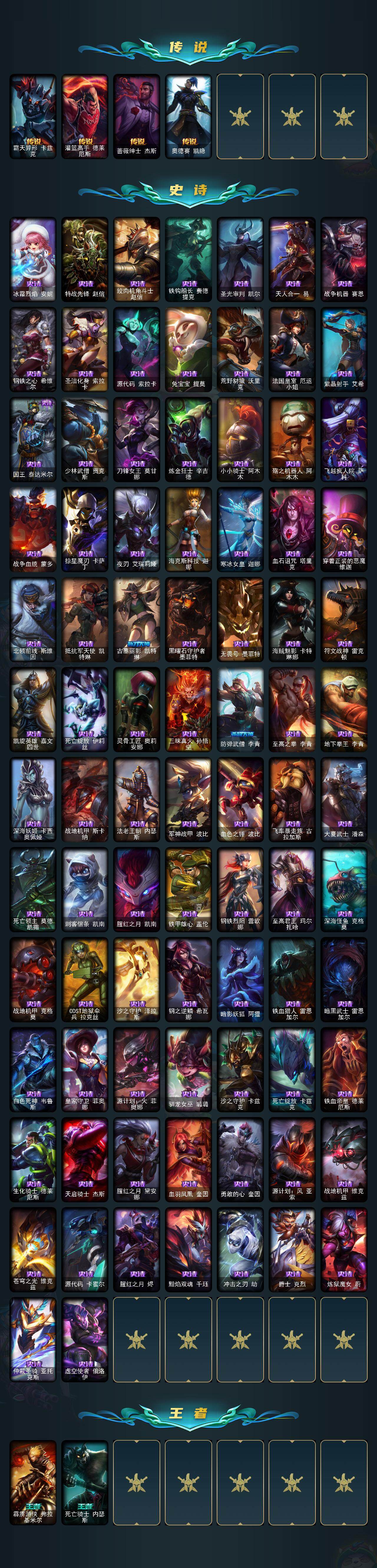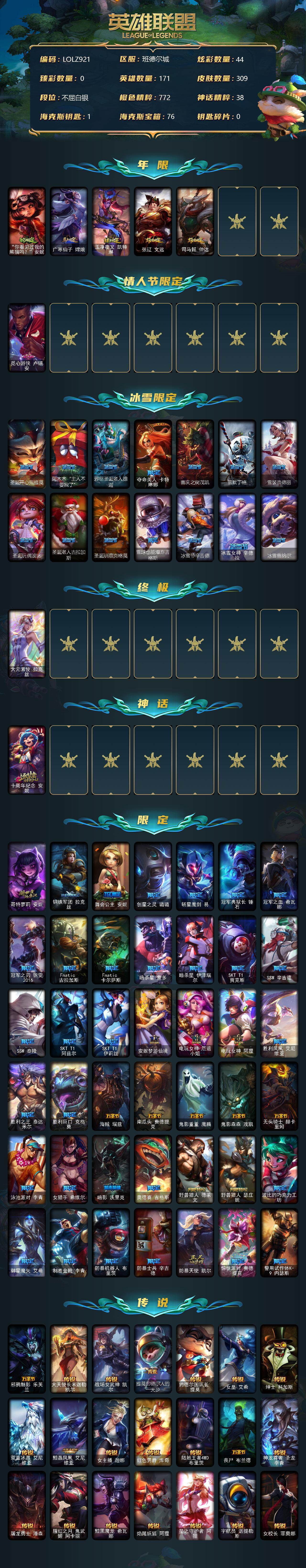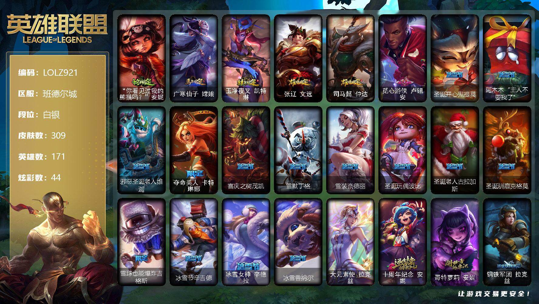 【LOLZ921】171英雄/309皮肤/1终极/1神话/62限定/44炫彩/25传说/86史诗/白银/你看见过我的熊猫吗安妮/广寒仙子嫦娥/玉净夜叉凯特琳/张辽文远/司马懿仲达/觅心游侠卢锡安/圣诞开心鬼提莫/阿木木“主人不要我了”/邪恶圣诞老人维迦/夺命美人卡特琳娜/喜庆之树茂凯/雪默丁格/雪装奈德丽/圣诞玩偶波比/圣诞老人古拉加斯/圣诞驯鹿克格莫/雪球也能爆炸吉格斯/冰雪节辛吉德/冰雪女神辛德拉/冰雪兽纳尔/大元素使拉克丝/十周年纪念安妮/哥特萝莉安妮/钢铁军团拉克丝/舞会公主安妮/创星之灵璐璐/斩星魔剑易/冠军典狱长锤石/冠军之血希瓦娜/冠军之刃锐雯2016/Fnatic古拉加斯/Fnatic卡尔萨斯/暗杀星蒙多/暗杀星伊泽瑞尔/SKTT1贾克斯/SSW辛吉德/SSW泰隆/SKTT1阿兹尔/SKTT1伊莉丝/安妮梦游仙境/电玩女神厄运小姐/电玩女神阿狸/胜利凤凰艾尼维亚/胜利之王泰达米尔/胜利巨口克格莫/海贼瑞兹/南瓜头费德提克/鬼影重重魔腾/鬼影森森茂凯/无头骑士赫卡里姆/泳池派对李青/女猎手希维尔/暗影沃里克/奥德赛吉格斯/野兽猎人德莱文/野兽猎人瑟庄妮/波比的巧克力工坊/御星魔矢艾希/制胜金靴李青/防暴机器人布里茨/防暴士兵辛吉德/防暴天使凯尔/惊悚派对费德提克/警用试作体K9内瑟斯/邪鸦魅影乐芙兰/大天使长米迦勒凯尔/战场女武神凯尔/提莫约德尔人的一大步/约德尔国队长提莫/女皇艾希/绅士科加斯/双重冰晶艾尼维亚/黯晶凤凰艾尼维亚/女主播迦娜/红色男爵库奇/陆地王者4WD布里茨/丧尸布兰德/神龙尊者圣龙李青/屠龙勇士潘森/腥红之月鬼武姬阿卡丽/黯黑魔龙希瓦娜/焰尾妖狐阿狸/星之守护者阿狸/宇航员诺提勒斯/女校长菲奥娜/霸天异形卡兹克/灌篮高手德莱厄斯/蔷薇绅士杰斯/奥德赛凯隐/冰霜烈焰安妮/特战先锋赵信/绞肉机角斗士赵信/铁钩船长费德提克/圣光审判凯尔/天人合一易/战争机器赛恩/钢铁之心希维尔/圣洁化身索拉卡/源代码索拉卡/兔宝宝提莫/荒野豺狼沃里克/法国皇室厄运小姐/紫晶射手艾希/国王泰达米尔/少林武僧贾克斯/刀锋女王莫甘娜/炼金狂士辛吉德/小小骑士阿木木/殇之机器人阿木木/飞越疯人院萨科/战争血统蒙多/掠星魔刃卡萨丁/夜刃艾瑞莉娅/海克斯科技迦娜/寒冰女皇迦娜/血石诅咒塔里克/穿着正装的恶魔维迦/北领前线斯维因/抵抗军天使凯特琳/古墓丽影凯特琳/黑曜石守护者墨菲特/无畏号墨菲特/海贼魅影卡特琳娜/符文战神雷克顿/凯旋英雄嘉文四世/死亡绽放伊莉丝/灵骨工匠奥莉安娜/三昧真火孙悟空/防弹武僧李青/至高之拳李青/地下拳王李青/深海妖姬卡西奥佩娅/战地机甲斯卡纳/法老王朝内瑟斯/军神战甲波比/血色之锤波比/飞车暴走族古拉加斯/大夏武士潘森/死亡领主莫德凯撒/刺客信条凯南/腥红之月凯南/铁甲雄心盖伦/钢铁烈阳蕾欧娜/至高君王玛尔扎哈/深海怪鱼克格莫/战地机甲克格莫/ODST地狱伞兵拉克丝/沙之守护泽拉斯/钢之逆鳞希瓦娜/暗影妖狐阿狸/铁血猎人雷恩加尔/暗黑武士雷恩加尔/白色死神韦鲁斯/皇家守卫菲奥娜/源计划火菲奥娜/驯龙女巫璐璐/沙之守护卡兹克/死亡绽放卡兹克/铁血帝皇德莱厄斯/生化骑士德莱厄斯/天启骑士杰斯/腥红之月黛安娜/血羽凤凰奎因/勇敢的心奎因/源计划风亚索/战地机甲维克兹/苍穹之光维克兹/源代码卡蜜尔/腥红之月烬/黯焰双魂千珏/冲击之刃劫/爵士克烈/炼狱魔女蔚/仲裁圣骑亚托克斯/虚空使者俄洛伊/霹雳游侠弗拉基米尔/死亡骑士内瑟斯/冰河时代奥拉夫/创意工坊黑默丁格/深潜蛙人古拉加斯/宗师级锻造训练师/幽蓝梦魇加里奥/探戈灵魂崔斯特/逆转裁判崔斯特/深渊巨蟹厄加特/社会名流乐芙兰/弗拉基米尔伯爵/弗拉基米尔侯爵/幽魂费德提克/荒野幽灵费德提克/星战易/金牛座阿利斯塔/斗牛士阿利斯塔/黑暗骑士阿利斯塔/部落精神瑞兹/美国大叔瑞兹/宗师级法师训练师瑞兹/蕉泥座人索拉卡/游击队员崔丝塔娜/约德尔海贼团崔丝塔娜/荒野巨兽努努和威朗普/脏兮兮努努和威朗普/西部牛仔厄运小姐/特工狂花厄运小姐/黑暗骑士艾希/勇敢的心泰达米尔/冰球队员贾克斯/光明骑士贾克斯/嘻哈精神基兰/时间机器基兰/机械污染辛吉德/科学狂人辛吉德/黑暗女王伊芙琳/假面女皇伊芙琳/探戈灵魂伊芙琳/黑金诱惑图奇/横行霸道图奇/自由女神卡尔萨斯/五杀摇滚主唱卡尔萨斯/尼斯巨兽科加斯/暴龙科加斯/情绪摇滚阿木木/极度深寒拉莫斯/联盟之喙艾尼维亚/战栗之毒蒙多/嗜血行刑蒙多/硬汉蒙多/缪斯女神娑娜/暴风女神迦娜/老兵普朗克/雪橇速滑库奇/急速前进库奇/海牛骑手库奇/日冕女神卡尔玛/樱花乱舞卡尔玛/光明骑士卡尔玛/绿水晶光辉塔里克/绿野仙踪维迦/里尔击球手特朗德尔/海贼参谋斯维因/铁锈斑斑布里茨/钢铁之门布里茨/擂台皇帝布里茨/戴一个表布里茨/赏金猎人卡特琳娜/红牌退场卡特琳娜/恶咒亡魂魔腾/烈焰古树茂凯/喵凯/血石战神雷克顿/猛龙雷克顿/银河魔装机神伊莉丝/末日余生布兰德/传统僧侣李青/独眼海盗兰博/荒漠之咬卡西奥佩娅/沙暴巨蝎斯卡纳/沙之守护斯卡纳/武力全开乌迪尔/乡村农夫古拉加斯/品酒大师古拉加斯/狂热球迷古拉加斯/古拉加斯碎桶者/斯巴达之魂潘森/丧尸杀手潘森/失落的世界伊泽瑞尔/龙骑士莫德凯撒/五杀摇滚吉他手莫德凯撒/梅花国王莫德凯撒/足球宝贝阿卡丽/刺身之拳阿卡丽/银色闪电凯南/空手道凯南/超级英雄凯南/战神阿瑞斯盖伦/