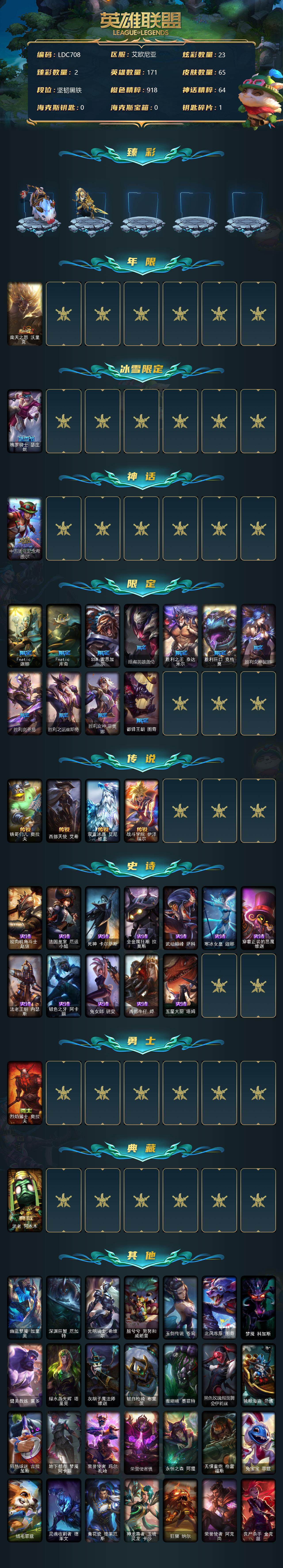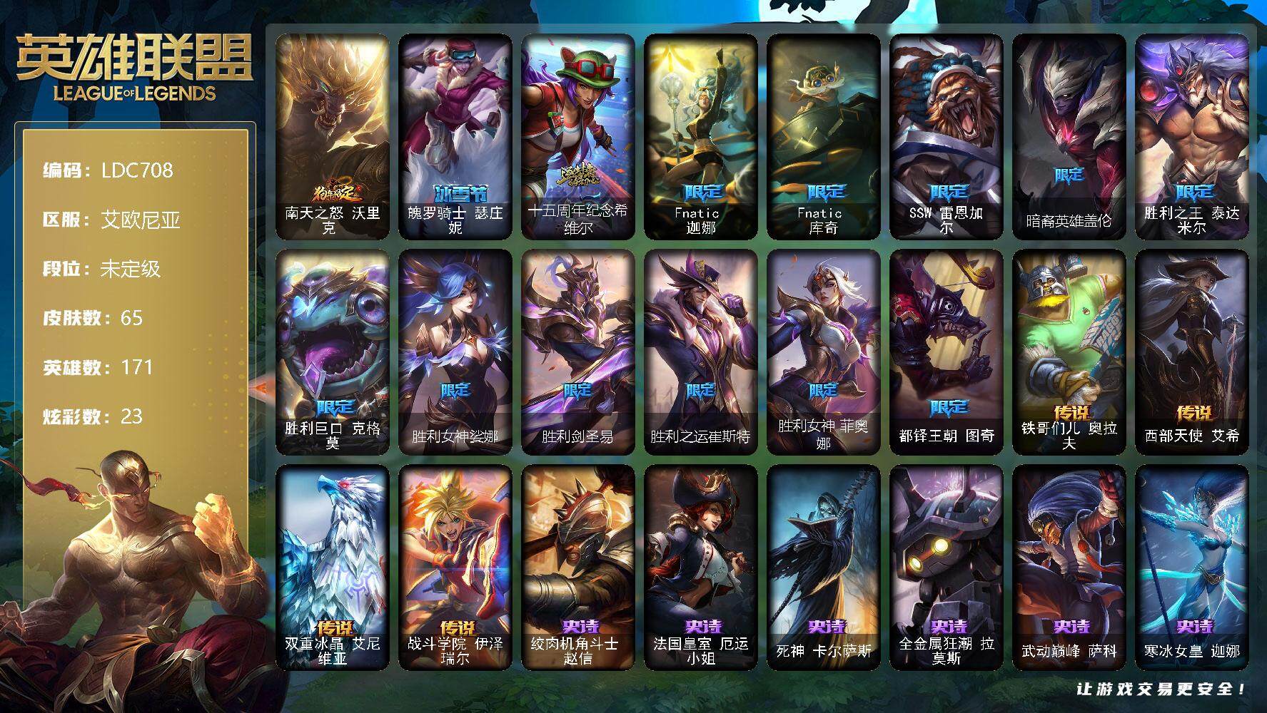 【LDC708】171英雄/65皮肤/1神话/13限定/2臻彩/23炫彩/4传说/12史诗/未定级账号等级:587/无畏骑士瑟庄妮赤子初心/赵云子龙炫金将军/南天之怒沃里克/魄罗骑士瑟庄妮/十五周年纪念希维尔/Fnatic迦娜/Fnatic库奇/SSW雷恩加尔/暗裔英雄盖伦/胜利之王泰达米尔/胜利巨口克格莫/胜利女神娑娜/胜利剑圣易/胜利之运崔斯特/胜利女神菲奥娜/都铎王朝图奇/铁哥们儿奥拉夫/西部天使艾希/双重冰晶艾尼维亚/战斗学院伊泽瑞尔/绞肉机角斗士赵信/法国皇室厄运小姐/死神卡尔萨斯/全金属狂潮拉莫斯/武动巅峰萨科/寒冰女皇迦娜/穿着正装的恶魔维迦/法老王朝内瑟斯/银色之牙阿卡丽/兔女郎锐雯/西部牛仔烬/五星大厨塔姆/烈焰猛士奥拉夫/法老阿木木/幽蓝梦魇加里奥/深渊巨蟹厄加特/光明骑士希维尔/脏兮兮努努和威朗普/玉剑传说苍鸾/北风冻原图奇/梦魇科加斯/健美教练蒙多/绿水晶光辉塔里克/灰胡子魔法师维迦/银白枪骑布里茨/珊瑚礁墨菲特/黑色玫瑰假面舞会伊莉丝/独眼海盗兰博/狂热球迷古拉加斯/地下都市梦魇阿卡丽/荣誉使者玛尔扎哈/荣誉使者慎/永恒之森阿狸/无情重炮格雷福斯/兔宝宝菲兹/绒毛菲兹/灵魂收割者德莱文/青花瓷德莱厄斯/神龙尊者玉境灵龙卡莎/狂狮纳尔/荣誉使者阿克尚/丧尸杀手金克丝/幻灵战斗猫金克丝/源计划逆流塞拉斯/黑夜使者厄斐琉斯/灵能特工派克/光明哨兵派克【按大区: 电信】