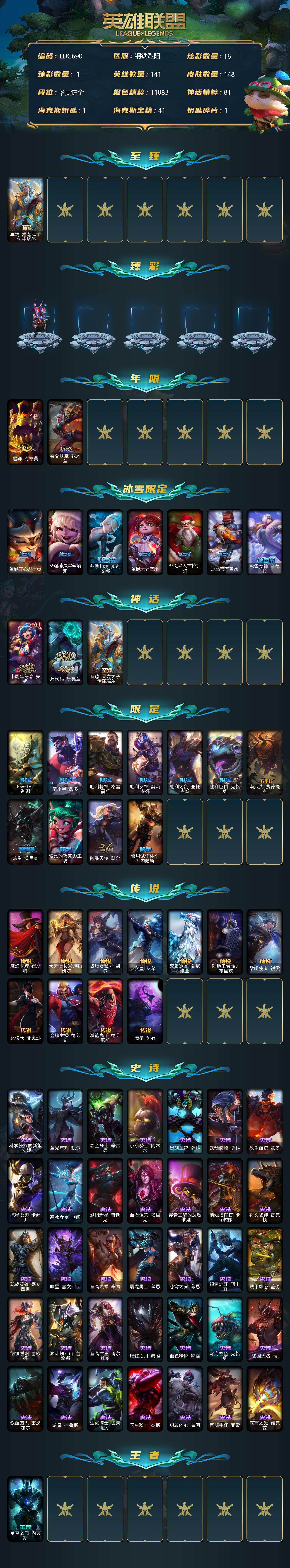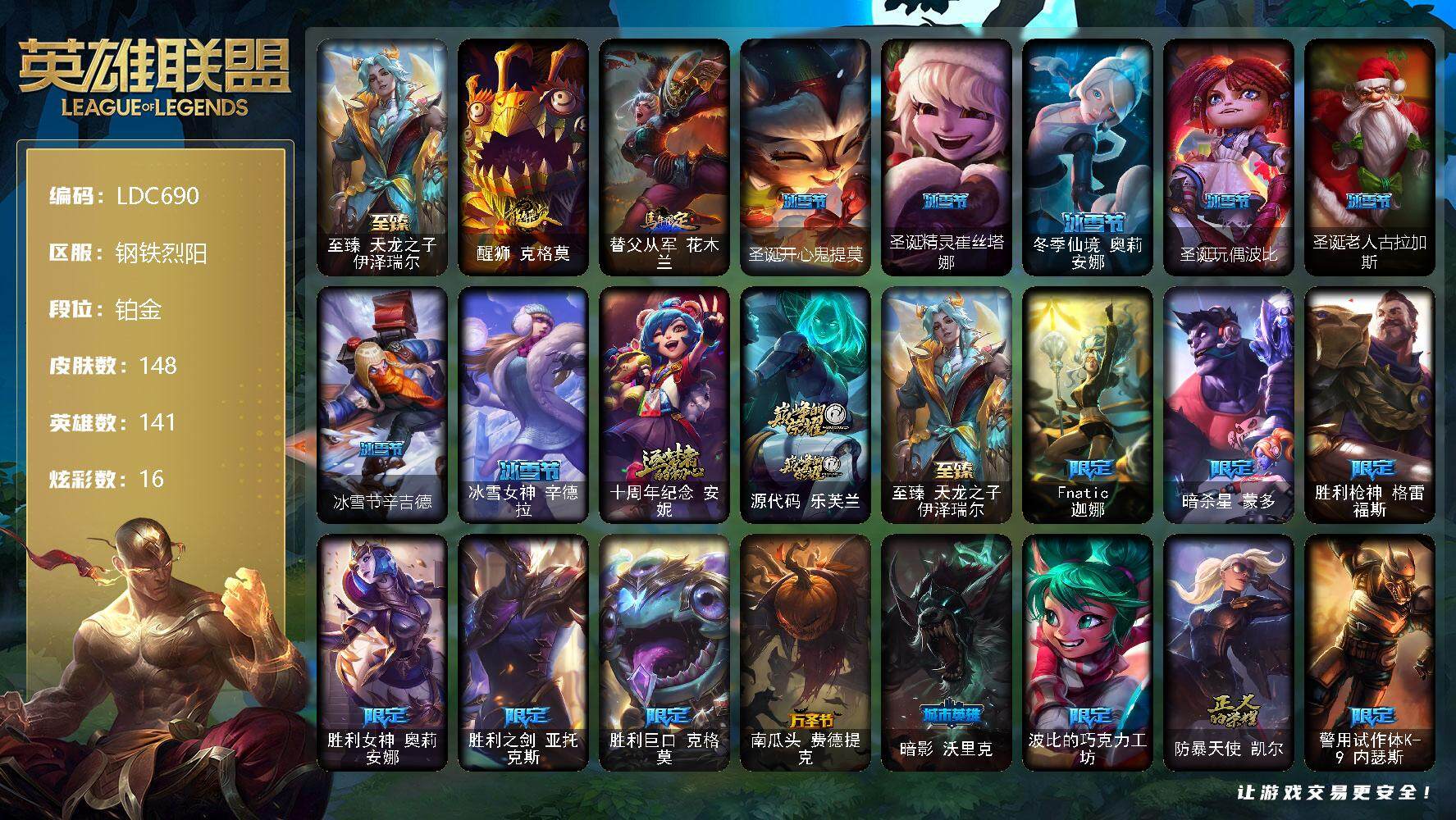 【LDC690】141英雄/148皮肤/3神话/20限定/1臻彩/16炫彩/11传说/35史诗/铂金账号等级:225/至臻天龙之子伊泽瑞尔/星之守护者霞烈羽/醒狮克格莫/替父从军花木兰/圣诞开心鬼提莫/圣诞精灵崔丝塔娜/冬季仙境奥莉安娜/圣诞玩偶波比/圣诞老人古拉加斯/冰雪节辛吉德/冰雪女神辛德拉/十周年纪念安妮/源代码乐芙兰/Fnatic迦娜/暗杀星蒙多/胜利枪神格雷福斯/胜利女神奥莉安娜/胜利之剑亚托克斯/胜利巨口克格莫/南瓜头费德提克/暗影沃里克/波比的巧克力工坊/防暴天使凯尔/警用试作体K9内瑟斯/魔幻卡牌崔斯特/大天使长米迦勒凯尔/战场女武神凯尔/女皇艾希/双重冰晶艾尼维亚/陆地王者4WD布里茨/黎明使者锐雯/女校长菲奥娜/金牌主播德莱文/灌篮高手德莱厄斯/暗星锤石/科学怪熊的新娘安妮/圣光审判凯尔/炼金狂士辛吉德/小小骑士阿木木/贵族血统萨科/武动巅峰萨科/战争血统蒙多/掠星魔刃卡萨丁/寒冰女皇迦娜/恐惧新星普朗克/血石诅咒塔里克/穿着正装的恶魔维迦/前线指挥官卡特琳娜/符文战神雷克顿/凯旋英雄嘉文四世/暗星嘉文四世/至高之拳李青/屠龙勇士薇恩/苍穹之光薇恩/银色之牙阿卡丽/铁甲雄心盖伦/钢铁烈阳蕾欧娜/源计划山蕾欧娜/至高君王玛尔扎哈/腥红之月泰隆/血色精锐锐雯/深海怪鱼克格莫/战国大名慎/铁血猎人雷恩加尔/暗星韦鲁斯/生化骑士德莱厄斯/天启骑士杰斯/勇敢的心奎因/西部牛仔亚索/苍穹之光维克兹/星空之门内瑟斯/烈焰猛士奥拉夫/法老阿木木/嗜血狂暴沃里克/幽蓝梦魇加里奥/探戈灵魂崔斯特/深渊巨蟹厄加特/弗拉基米尔伯爵/末世天使凯尔/后场堡垒阿利斯塔/宗师级法师训练师瑞兹/原野伐木工赛恩/腥红之月希维尔/森林女神索拉卡/约德尔海贼团崔丝塔娜/荒野巨兽努努和威朗普/脏兮兮努努和威朗普/攻城巨兽努努和威朗普/复仇武神贾克斯/遗迹守护者基兰/机械污染辛吉德/惊天魔盗伊芙琳/北风冻原图奇/黑金诱惑图奇/尼斯巨兽科加斯/狂欢阿木木/铬金铠甲拉莫斯/忍龟拉莫斯/沙之守护拉莫斯/重甲猎鹰艾尼维亚/小丑工作坊萨科/健美教练蒙多/嗜血行刑蒙多/电玩上校库奇/光明骑士卡尔玛/冰壶选手维迦/绿野仙踪维迦/里尔击球手特朗德尔/铁锈斑斑布里茨/擂台皇帝布里茨/珊瑚礁墨菲特/赏金猎人卡特琳娜/烈焰古树茂凯/猛龙雷克顿/吕布奉先/哥特女仆奥莉安娜/传统僧侣李青/猎天使魔女薇恩/蛇发女妖卡西奥佩娅/沙暴巨蝎斯卡纳/武力全开乌迪尔/狂热球迷古拉加斯/足球先生伊泽瑞尔/光执事伊泽瑞尔/黑桃皇牌伊泽瑞尔/龙骑士莫德凯撒/五杀摇滚吉他手莫德凯撒/蜂刺阿卡丽/足球宝贝阿卡丽/银色闪电凯南/空手道凯南/战神阿瑞斯盖伦/德玛西亚警官盖伦/极寒慎/主治医师慎/战地法师泽拉斯/无情重炮格雷福斯/失落大陆菲兹/全金属狂潮维克托/初号机维克托/热血班长德莱厄斯/暗星女王丽桑卓/方块王后辛德拉/鬼影森森婕拉/弹幕天使卡莎/丧尸杀手金克丝/鲛妮座人娜美/玉剑传说寒潭夭夭/深渊恐惧锤石【按大区: 电信】