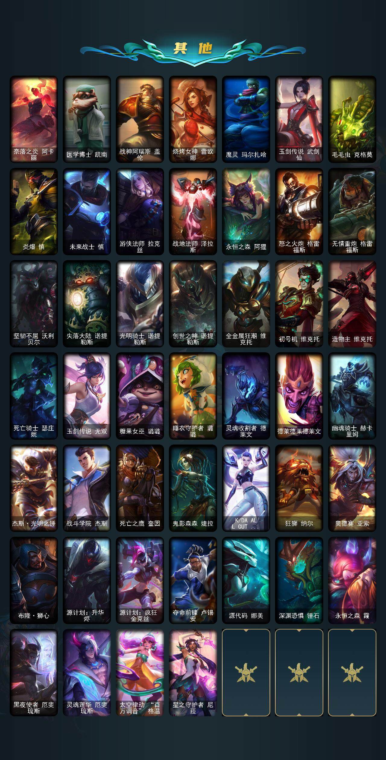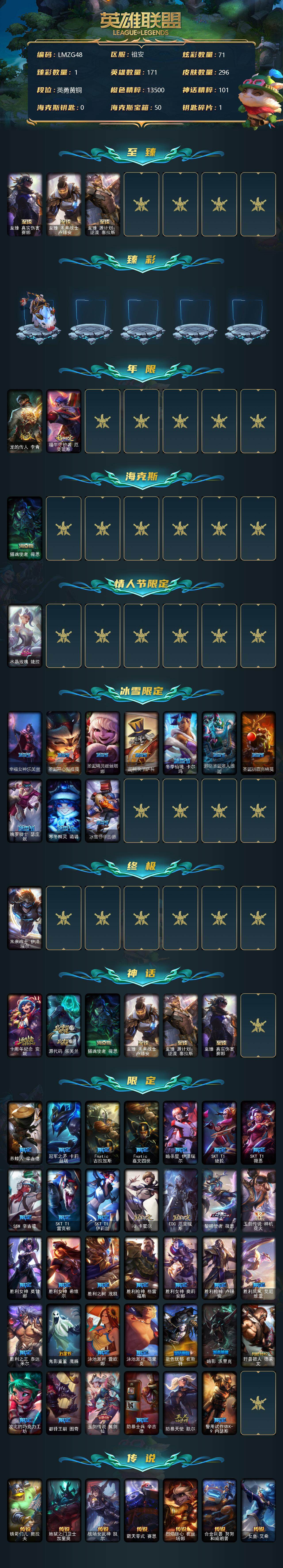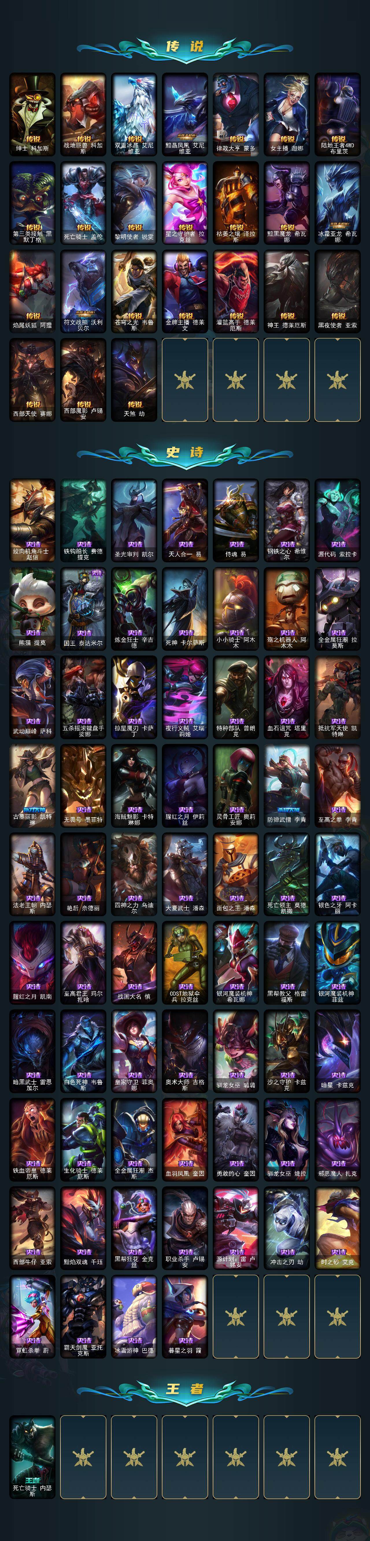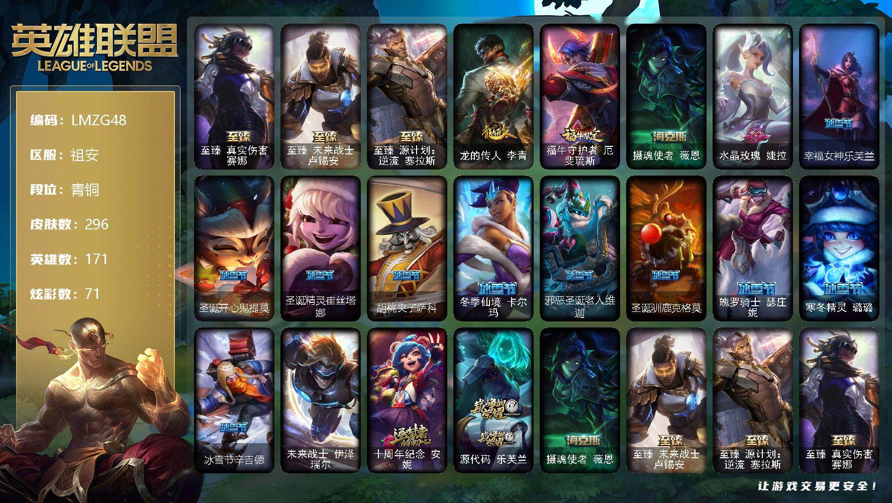 【LMZG48】171英雄/296皮肤/1终极/6神话/47限定/1臻彩/71炫彩/31传说/67史诗/青铜/至臻真实伤害赛娜/至臻未来战士卢锡安/至臻源计划逆流塞拉斯/无畏骑士瑟庄妮赤子初心/龙的传人李青/福牛守护者厄斐琉斯/摄魂使者薇恩/水晶玫瑰婕拉/幸福女神乐芙兰/圣诞开心鬼提莫/圣诞精灵崔丝塔娜/胡桃夹子萨科/冬季仙境卡尔玛/邪恶圣诞老人维迦/圣诞驯鹿克格莫/魄罗骑士瑟庄妮/寒冬精灵璐璐/冰雪节辛吉德/未来战士伊泽瑞尔/十周年纪念安妮/源代码乐芙兰/养蜂人辛吉德/冠军之矛卡莉丝塔/Fnatic古拉加斯/Fnatic嘉文四世/暗杀星伊泽瑞尔/SKTT1婕拉/SKTT1薇恩/SSW辛吉德/SKTT1雷克顿/SKTT1伊莉丝/iG卡蜜尔/EDG厄斐琉斯/黎明使者薇恩/玉剑传说神机花火/胜利女神莫甘娜/胜利女神希维尔/胜利之树茂凯/胜利枪神格雷福斯/胜利女神奥莉安娜/胜利枪神卢锡安/胜利凤凰艾尼维亚/胜利之王泰达米尔/鬼影重重魔腾/泳池派对蕾欧娜/泳池派对塔里克/蓝色忧郁崔斯特/暗影沃里克/野兽猎人德莱文/波比的巧克力工坊/都铎王朝图奇/玉剑传说翼剑仙/防暴士兵辛吉德/防暴天使凯尔/警用试作体K9内瑟斯/铁哥们儿奥拉夫/地狱之门卫士加里奥/战场女武神凯尔/霸天零式赛恩/烈焰雄心崔丝塔娜/合金巨兽努努和威朗普/女皇艾希/绅士科加斯/战地巨兽科加斯/双重冰晶艾尼维亚/黯晶凤凰艾尼维亚/律政大亨蒙多/女主播迦娜/陆地王者4WD布里茨/第三类接触黑默丁格/死亡骑士盖伦/黎明使者锐雯/星之守护者拉克丝/枯萎之壤泽拉斯/黯黑魔龙希瓦娜/冰霜亚龙希瓦娜/焰尾妖狐阿狸/符文战熊沃利贝尔/苍穹之光韦鲁斯/金牌主播德莱文/灌篮高手德莱厄斯/神王德莱厄斯/黑夜使者亚索/西部天使赛娜/西部魔影卢锡安/天煞劫/绞肉机角斗士赵信/铁钩船长费德提克/圣光审判凯尔/天人合一易/侍魂易/钢铁之心希维尔/源代码索拉卡/熊猫提莫/国王泰达米尔/炼金狂士辛吉德/死神卡尔萨斯/小小骑士阿木木/殇之机器人阿木木/全金属狂潮拉莫斯/武动巅峰萨科/五杀摇滚键盘手娑娜/掠星魔刃卡萨丁/夜行义贼艾瑞莉娅/特种部队普朗克/血石诅咒塔里克/抵抗军天使凯特琳/古墓丽影凯特琳/无畏号墨菲特/海贼魅影卡特琳娜/腥红之月伊莉丝/灵骨工匠奥莉安娜/防弹武僧李青/至高之拳李青/法老王朝内瑟斯/艳后奈德丽/四神之力乌迪尔/大夏武士潘森/面包之王潘森/死亡领主莫德凯撒/银色之牙阿卡丽/腥红之月凯南/至高君王玛尔扎哈/战国大名慎/ODST地狱伞兵拉克丝/银河魔装机神希瓦娜/黑帮教父格雷福斯/银河魔装机神菲兹/暗黑武士雷恩加尔/白色死神韦鲁斯/皇家守卫菲奥娜/奥术大师吉格斯/驯龙女巫璐璐/沙之守护卡兹克/暗星卡兹克/铁血帝皇德莱厄斯/生化骑士德莱厄斯/全金属狂潮杰斯/血羽凤凰奎因/勇敢的心奎因/驯龙女巫婕拉/邪恶魔人扎克/西部牛仔亚索/黯焰双魂千珏/黑帮狂花金克丝/职业杀手卢锡安/源计划雷卢锡安/冲击之刃劫/时之砂艾克/霓虹杀拳蔚/霸天剑魔亚托克斯/冰雪游神巴德/暮星之羽霞/死亡骑士内瑟斯/拆弹专家黑默丁格/创意工坊黑默丁格/亮丽女神希维尔/烈焰猛士奥拉夫/钢铁终结者赛恩/嗜血狂暴沃里克/小红帽安妮/牛扒狂战奥拉夫/幽蓝梦魇加里奥/风执事加里奥/皇家守卫赵信/赵云子龙/电锯狂人厄加特/潮流女王乐芙兰/社会名流乐芙兰/弗拉基米尔侯爵/联合王国费德提克/末世天使凯尔/钢铁审判官凯尔/暗影易/斗牛士阿利斯塔/后场堡垒阿利斯塔/哞利斯塔/宗师级法师训练师瑞兹/武仙座海格力斯赛恩/原野伐木工赛恩/军情五处提莫/游击队员崔丝塔娜/约德尔海贼团崔丝塔娜/黑暗骑士沃里克/脏兮兮努努和威朗普/西部牛仔厄运小姐/星之守护者厄运小姐/极地女神艾希/勇敢的心艾希/冰球队员贾克斯/武神贾克斯/时间机器基兰/机械污染辛吉德/黑暗女王伊芙琳/探戈灵魂伊芙琳/绝影神偷图奇/幽灵幻影卡尔萨斯/五杀摇滚主唱卡尔萨斯/梦魇科加斯/狂欢阿木木/情绪摇滚阿木木/王子不是我阿木木/铬金铠甲拉莫斯/忍龟拉莫斯/重甲猎鹰艾尼维亚/翼龙艾尼维亚/小丑工作坊萨科/万能小丑萨科/健美教练蒙多/嗜血行刑蒙多/硬汉蒙多/虚空前世卡萨丁/源计划正义艾瑞莉娅/玉剑传说风仙子/老兵普朗克/电玩上校库奇/日冕女神卡尔玛/光明骑士卡尔玛/绿水晶光辉塔里克/冰壶选手维迦/灰胡子魔法师维迦/里尔击球手特朗德尔/垃圾场特朗德尔/巡逻警官特朗德尔/荒野治安官凯特琳/戴一个表布里茨/珊瑚礁墨菲特/赏金猎人卡特琳娜/星河战队雷克顿/血石战神雷克顿/鳄霸雷克顿/末日余生布兰德/战场BOSS布兰德/猎天使魔女薇恩/灵魂莲华薇恩/热带丛林兰博/废土男爵兰博/荒漠之咬卡西奥佩娅/蛇发女妖卡西奥佩娅/沙暴巨蝎斯卡纳/法国女仆奈德丽/武力全开乌迪尔/诺克萨斯波比/乡村农夫古拉加斯/品酒大师古拉加斯/斯巴达之魂潘森/冒险精神伊泽瑞尔/足球先生伊泽瑞尔/黑桃皇牌伊泽瑞尔/五杀摇滚贝斯手约里克/蜂刺阿卡丽/奈落之炎阿卡丽/医学博士凯南/战神阿瑞斯盖伦/烧烤女神蕾欧娜/魔灵玛尔扎哈/玉剑传说武剑仙/毛毛虫克格莫/炎爆慎/未来战士慎/游侠法师拉克丝/战地法师泽拉斯/永恒之森阿狸/怒之火炮格雷福斯/无情重炮格雷福斯/坚韧不屈沃利贝尔/失落大陆诺提勒斯/光明骑士诺提勒斯/创世之神诺提勒斯/全金属狂潮维克托/初号机维克托/造物主维克托/死亡骑士瑟庄妮/玉剑传说无双/糖果女巫璐璐