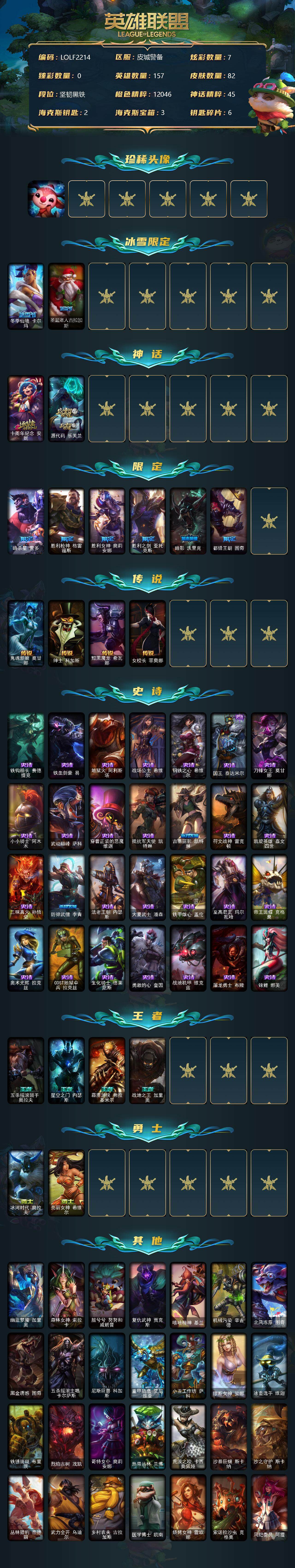 【LOLF2214】157英雄/82皮肤/2神话/8限定/7炫彩/4传说/28史诗/未定级/至爱的鹿头像/冬季仙境卡尔玛/圣诞老人古拉加斯/十周年纪念安妮/源代码乐芙兰/暗杀星蒙多/胜利枪神格雷福斯/胜利女神奥莉安娜/胜利之剑亚托克斯/暗影沃里克/都铎王朝图奇/鬼魂新娘莫甘娜/绅士科加斯/黯黑魔龙希瓦娜/女校长菲奥娜/铁钩船长费德提克/铁血剑豪易/地狱火阿利斯塔/战场公主希维尔/钢铁之心希维尔/国王泰达米尔/刀锋女王莫甘娜/小小骑士阿木木/武动巅峰萨科/穿着正装的恶魔维迦/抵抗军天使凯特琳/古墓丽影凯特琳/符文战神雷克顿/凯旋英雄嘉文四世/三昧真火孙悟空/防弹武僧李青/法老王朝内瑟斯/大夏武士潘森/铁甲雄心盖伦/至高君王玛尔扎哈/帝王斑蝶克格莫/奥术光辉拉克丝/ODST地狱伞兵拉克丝/生化骑士德莱厄斯/勇敢的心奎因/战地机甲维克兹/屠龙勇士布隆/锦鲤娜美/五杀摇滚鼓手奥拉夫/星空之门内瑟斯/霹雳游侠弗拉基米尔/战地之王加里奥/冰河时代奥拉夫/亮丽女神希维尔/幽蓝梦魇加里奥/森林女神索拉卡/脏兮兮努努和威朗普/复仇武神贾克斯/嘻哈精神基兰/机械污染辛吉德/北风冻原图奇/黑金诱惑图奇/五杀摇滚主唱卡尔萨斯/尼斯巨兽科加斯/重甲猎鹰艾尼维亚/小丑工作坊萨科/缪斯女神娑娜/冰壶选手维迦/铁锈斑斑布里茨/烈焰古树茂凯/哥特女仆奥莉安娜/热带丛林兰博/荒漠之咬卡西奥佩娅/沙暴巨蝎斯卡纳/沙之守护斯卡纳/丛林猎豹奈德丽/武力全开乌迪尔/乡村农夫古拉加斯/医学博士凯南/烧烤女神蕾欧娜/索诺拉沙虫克格莫/风纪委员阿狸/坚韧不屈沃利贝尔/全金属狂潮维克托/初号机维克托/狂狮纳尔/铁拳执事蔚/深渊恐惧锤石【按大区: 电信】
