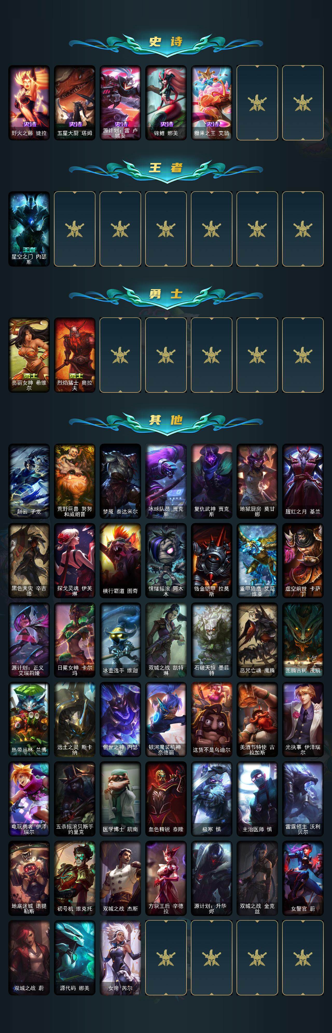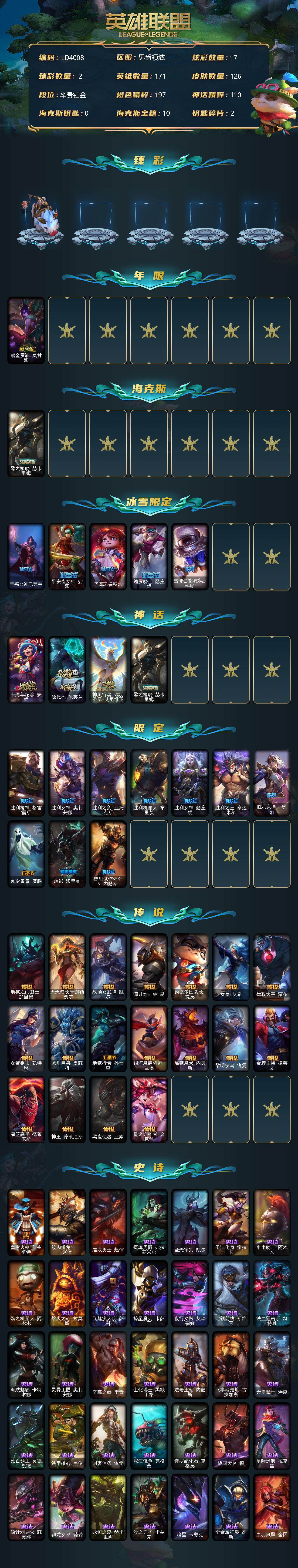 【LD4008】171英雄/126皮肤/4神话/16限定/2臻彩/17炫彩/18传说/40史诗/铂金/无畏骑士瑟庄妮赤子初心/魔女阿卡丽虚荣/紫金罗刹莫甘娜/零之枪骑赫卡里姆/幸福女神乐芙兰/平安夜女神娑娜/圣诞玩偶波比/魄罗骑士瑟庄妮/雪球也能爆炸吉格斯/十周年纪念安妮/源代码乐芙兰/神凰行者瑞羽圣凰艾尼维亚/胜利枪神格雷福斯/胜利女神奥莉安娜/胜利之剑亚托克斯/胜利机器人布里茨/胜利女神瑟庄妮/胜利之王泰达米尔/胜利女神菲奥娜/鬼影重重魔腾/暗影沃里克/警用试作体K9内瑟斯/地狱之门卫士加里奥/大天使长米迦勒凯尔/战场女武神凯尔/源计划林易/约德尔国队长提莫/女皇艾希/律政大亨蒙多/女警狙击凯特琳/冰川巨兽墨菲特/地狱行者孙悟空/银河魔装机神兰博/炼狱魔犬内瑟斯/黎明使者锐雯/金牌主播德莱文/灌篮高手德莱厄斯/神王德莱厄斯/黑夜使者亚索/星之守护者金克丝/皇家火枪手崔斯特/绞肉机角斗士赵信/屠龙勇士赵信/摄魂男爵弗拉基米尔/圣光审判凯尔/圣洁化身索拉卡/小小骑士阿木木/殇之机器人阿木木/熔火之心拉莫斯/飞越疯人院萨科/掠星魔刃卡萨丁/夜行义贼艾瑞莉娅/北领前线斯维因/铁血狙击手凯特琳/海贼魅影卡特琳娜/灵骨工匠奥莉安娜/至高之拳李青/生化博士黑默丁格/法老王朝内瑟斯/飞车暴走族古拉加斯/大夏武士潘森/死亡领主莫德凯撒/铁甲雄心盖伦/刺客信条锐雯/深海怪鱼克格莫/侏罗纪化石克格莫/战国大名慎/星际迷航拉克丝/源计划火菲奥娜/驯龙女巫璐璐/永恒之森赫卡里姆/沙之守护卡兹克/暗星卡兹克/全金属狂潮杰斯/血羽凤凰奎因/野火之藤婕拉/五星大厨塔姆/源计划雷卢锡安/锦鲤娜美/糖果之王艾翁/星空之门内瑟斯/亮丽女神希维尔/烈焰猛士奥拉夫/赵云子龙/荒野巨兽努努和威朗普/梦魇泰达米尔/冰球队员贾克斯/复仇武神贾克斯/地狱厨房莫甘娜/腥红之月基兰/黑色天灾辛吉德/探戈灵魂伊芙琳/横行霸道图奇/情绪摇滚阿木木/铬金铠甲拉莫斯/重甲猎鹰艾尼维亚/虚空前世卡萨丁/源计划正义艾瑞莉娅/日冕女神卡尔玛/冰壶选手维迦/双城之战凯特琳/石破天惊墨菲特/恶咒亡魂魔腾/图腾古树茂凯/热带丛林兰博/远土之灵斯卡纳/创世之神内瑟斯/银河魔装机神奈德丽/这货不是乌迪尔/美酒节特使古拉加斯/光执事伊泽瑞尔/电玩勇者伊泽瑞尔/五杀摇滚贝斯手约里克/医学博士凯南/血色精锐泰隆/极寒慎/主治医师慎/雷霆领主沃利贝尔/地底迷城诺提勒斯/初号机维克托/双城之战杰斯/方块王后辛德拉/源计划升华烬/双城之战金克丝/女警官蔚/双城之战蔚/源代码娜美/女帝芮尔【按大区: 峡谷之巅】