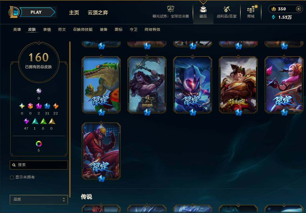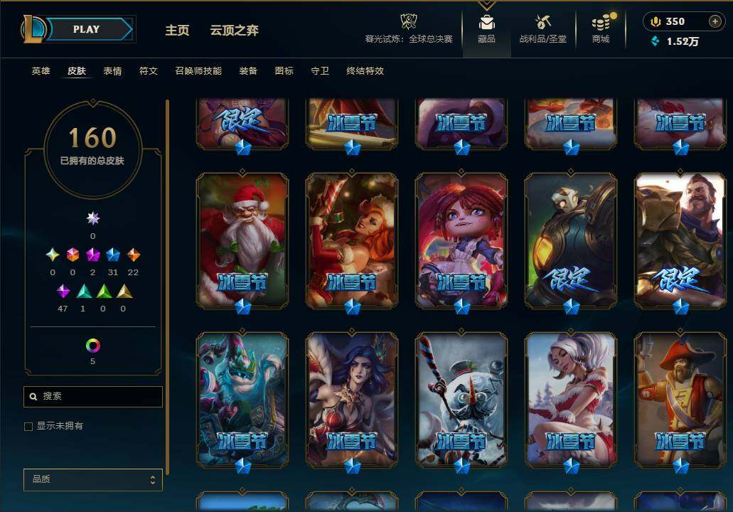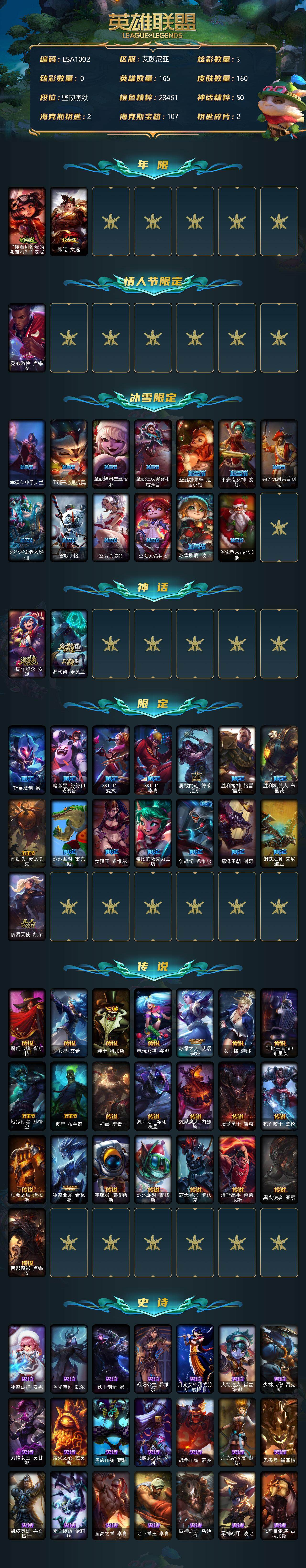 按大区: 电信 按服务器: 艾欧尼亚 诚心卖服务: 卖家已购买诚心卖服务 实名情况: 可二次实名 珍稀头像: 锦鲤娜美 冰雪限定: 圣诞糖果棒厄运小姐 平安夜女神娑娜 冰雪驯鹿波比 年限皮肤: 张辽文远 情人节限定: 觅心游侠卢锡安 热门头像: 觅心游侠卢锡安 皮肤数量: 160 英雄数量: 165