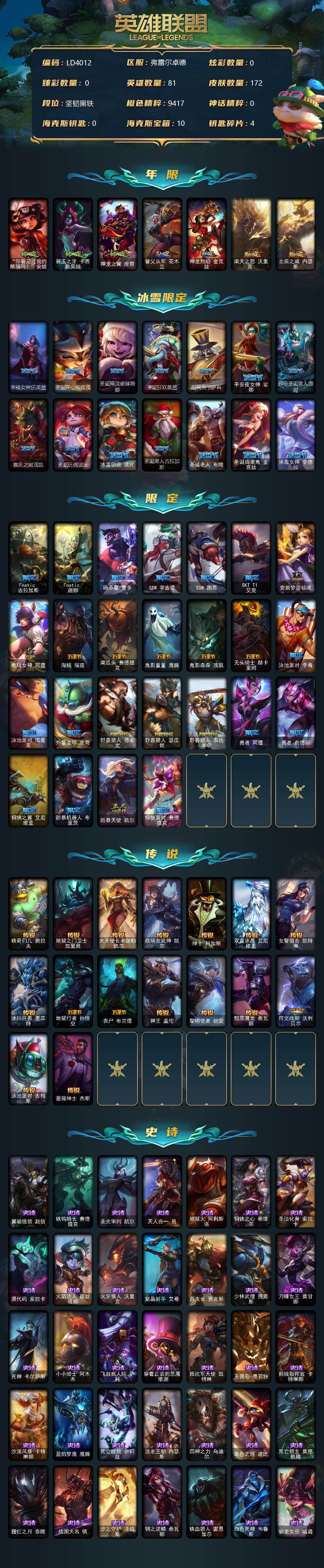 【LD4012】81英雄/172皮肤/46限定/16传说/41史诗/未定级账号等级:43/你看见过我的熊猫吗安妮/碧玉之牙卡西奥佩娅/神龙之翼库奇/替父从军花木兰/神龙烈焰金克丝/南天之怒沃里克/北辰之威内瑟斯/幸福女神乐芙兰/圣诞开心鬼提莫/圣诞精灵崔丝塔娜/圣诞狂欢基兰/胡桃夹子萨科/平安夜女神娑娜/邪恶圣诞老人维迦/喜庆之树茂凯/圣诞玩偶波比/冰雪驯鹿波比/圣诞老人古拉加斯/圣诞老人布隆/圣诞捣蛋鬼金克丝/冰雪女神辛德拉/Fnatic古拉加斯/Fnatic迦娜/暗杀星蒙多/SSW辛吉德/SSW图奇/SKTT1艾克/安妮梦游仙境/电玩女神阿狸/海贼瑞兹/南瓜头费德提克/鬼影重重魔腾/鬼影森森茂凯/无头骑士赫卡里姆/泳池派对李青/泳池派对塔里克/外星装甲库奇/野兽猎人德莱文/野兽猎人瑟庄妮/野兽猎人泰达米尔/勇者阿狸/勇者奈德丽/钢铁之翼艾尼维亚/防暴机器人布里茨/防暴天使凯尔/惊悚派对费德提克/铁哥们儿奥拉夫/地狱之门卫士加里奥/大天使长米迦勒凯尔/战场女武神凯尔/绅士科加斯/双重冰晶艾尼维亚/女警狙击凯特琳/冰川巨兽墨菲特/地狱行者孙悟空/丧尸布兰德/神王盖伦/黎明使者锐雯/黯黑魔龙希瓦娜/符文战熊沃利贝尔/泳池派对吉格斯/蔷薇绅士杰斯/翼骑统领赵信/铁钩船长费德提克/圣光审判凯尔/天人合一易/地狱火阿利斯塔/钢铁之心希维尔/圣洁化身索拉卡/源代码索拉卡/火箭达人崔丝塔娜/火牙狼人沃里克/紫晶射手艾希/百夫长贾克斯/少林武僧贾克斯/刀锋女王莫甘娜/死神卡尔萨斯/小小骑士阿木木/飞越疯人院萨科/穿着正装的恶魔维迦/抵抗军天使凯特琳/无畏号墨菲特/前线指挥官卡特琳娜/沙漠风暴卡特琳娜/蓝焰梦魔魔腾/死亡绽放伊莉丝/法老王朝内瑟斯/四神之力乌迪尔/血色之锤波比/死亡领主莫德凯撒/腥红之月泰隆/战国大名慎/沙之守护泽拉斯/钢之逆鳞希瓦娜/铁血猎人雷恩加尔/白色死神韦鲁斯/驯龙女巫璐璐/暗星卡兹克/血羽凤凰奎因/屠龙勇士布隆/五星大厨塔姆/炼狱魔女蔚/仲裁圣骑亚托克斯/五杀摇滚鼓手奥拉夫/星空之门内瑟斯/霹雳游侠弗拉基米尔/创意工坊黑默丁格/烈焰猛士奥拉夫/法老阿木木/钢铁终结者赛恩/魔导绅士维迦/嗜血狂暴沃里克/宗师级锻造训练师/深渊巨蟹厄加特/弗拉基米尔伯爵/瑞兹白须/原野伐木工赛恩/森林女神索拉卡/黑暗骑士艾希/时间机器基兰/腥红之月基兰/冲浪高手辛吉德/黑暗女王伊芙琳/惊天魔盗伊芙琳/黑金诱惑图奇/横行霸道图奇/尼斯巨兽科加斯/情绪摇滚阿木木/铬金铠甲拉莫斯/忍龟拉莫斯/联盟之喙艾尼维亚/翼龙艾尼维亚/嗜血行刑蒙多/深海一号卡萨丁/玉剑传说风仙子/幽灵船长普朗克/日冕女神卡尔玛/传统服饰卡尔玛/光明骑士卡尔玛/白魔法师维迦/垃圾场特朗德尔/传统造型特朗德尔/星河战队雷克顿/血石战神雷克顿/恶灵布偶奥莉安娜/蛇发女妖卡西奥佩娅/远土之灵斯卡纳/沙之守护斯卡纳/创世之神内瑟斯/银河魔装机神奈德丽/狂热球迷古拉加斯/足球先生伊泽瑞尔/梅花国王莫德凯撒/五杀摇滚贝斯手约里克/医学博士凯南/神圣守卫蕾欧娜/毛毛虫克格莫/炎爆慎/主治医师慎/战地法师泽拉斯/坚韧不屈沃利贝尔/失落大陆诺提勒斯/光明骑士诺提勒斯/初号机维克托/野兽女王瑟庄妮/死亡骑士瑟庄妮/少校吉格斯/邪恶女巫璐璐/泳池派对德莱文/血石骑士赫卡里姆/鬼影森森婕拉/巴德吟游诗人【按大区: 网通】