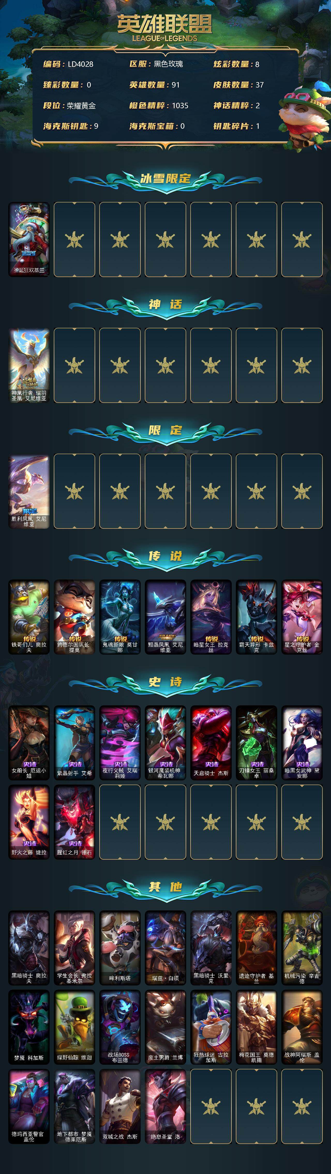 【LD4028】91英雄/37皮肤/1神话/2限定/8炫彩/7传说/9史诗/黄金/圣诞狂欢基兰/神凰行者瑞羽圣凰艾尼维亚/胜利凤凰艾尼维亚/铁哥们儿奥拉夫/约德尔国队长提莫/鬼魂新娘莫甘娜/黯晶凤凰艾尼维亚/暗星女王拉克丝/霸天异形卡兹克/星之守护者金克丝/女船长厄运小姐/紫晶射手艾希/夜行义贼艾瑞莉娅/银河魔装机神希瓦娜/天启骑士杰斯/刀锋女王丽桑卓/暗黑女武神黛安娜/野火之藤婕拉/腥红之月锤石/黑暗骑士奥拉夫/学生会长弗拉基米尔/哞利斯塔/瑞兹白须/黑暗骑士沃里克/遗迹守护者基兰/机械污染辛吉德/梦魇科加斯/绿野仙踪维迦/战场BOSS布兰德/废土男爵兰博/狂热球迷古拉加斯/梅花国王莫德凯撒/战神阿瑞斯盖伦/德玛西亚警官盖伦/地下都市梦魇德莱厄斯/双城之战杰斯/绝息圣堂洛【按大区: 电信】